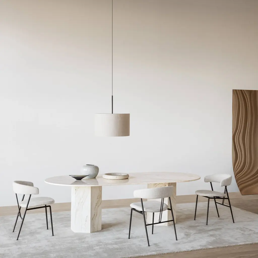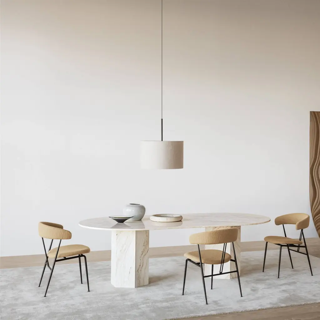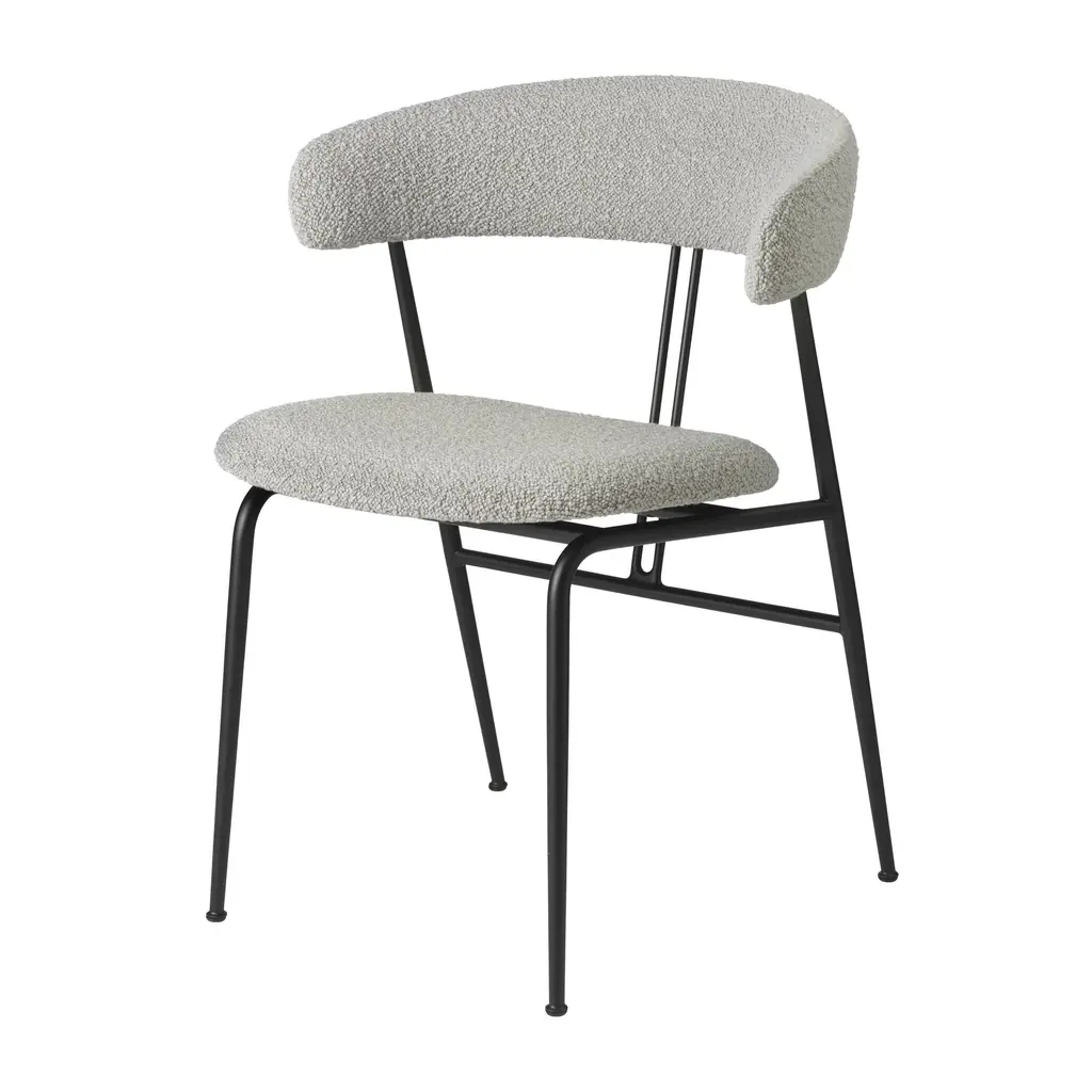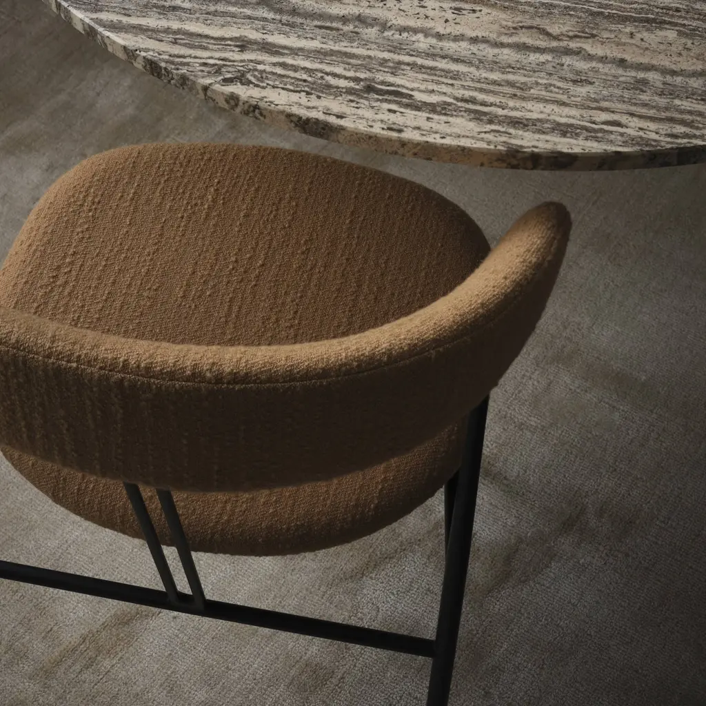 Full upholstery allows for a custom take on Danish-Italian duo GamFratesi’s unique Violin Chair. Two center parallel lines echo its namesake instruments’s strings, providing a decorative signature as well as support for the curved backrest. A generous seat resting on gently tapering, powder-coated steel legs completes the half-arm concept, designed to serve as a dining chair or an armchair without compromising on comfort.
