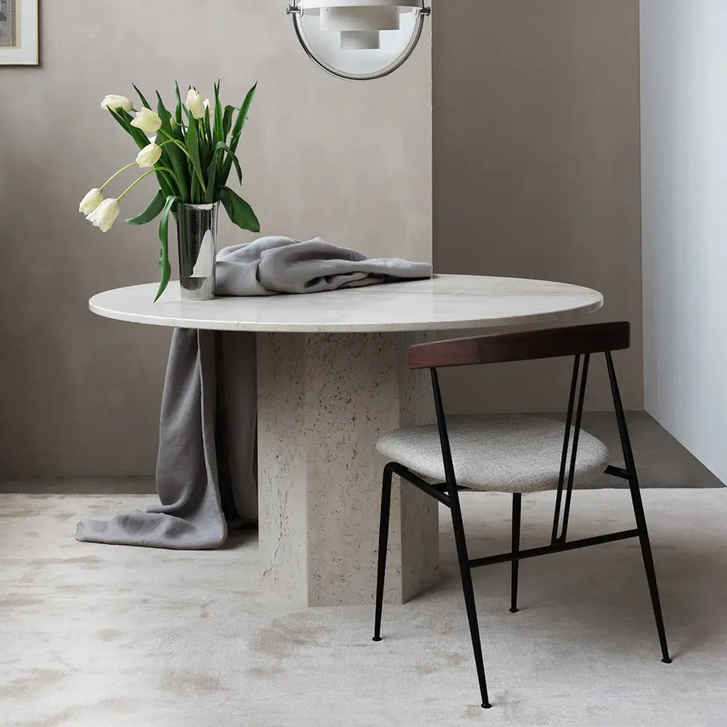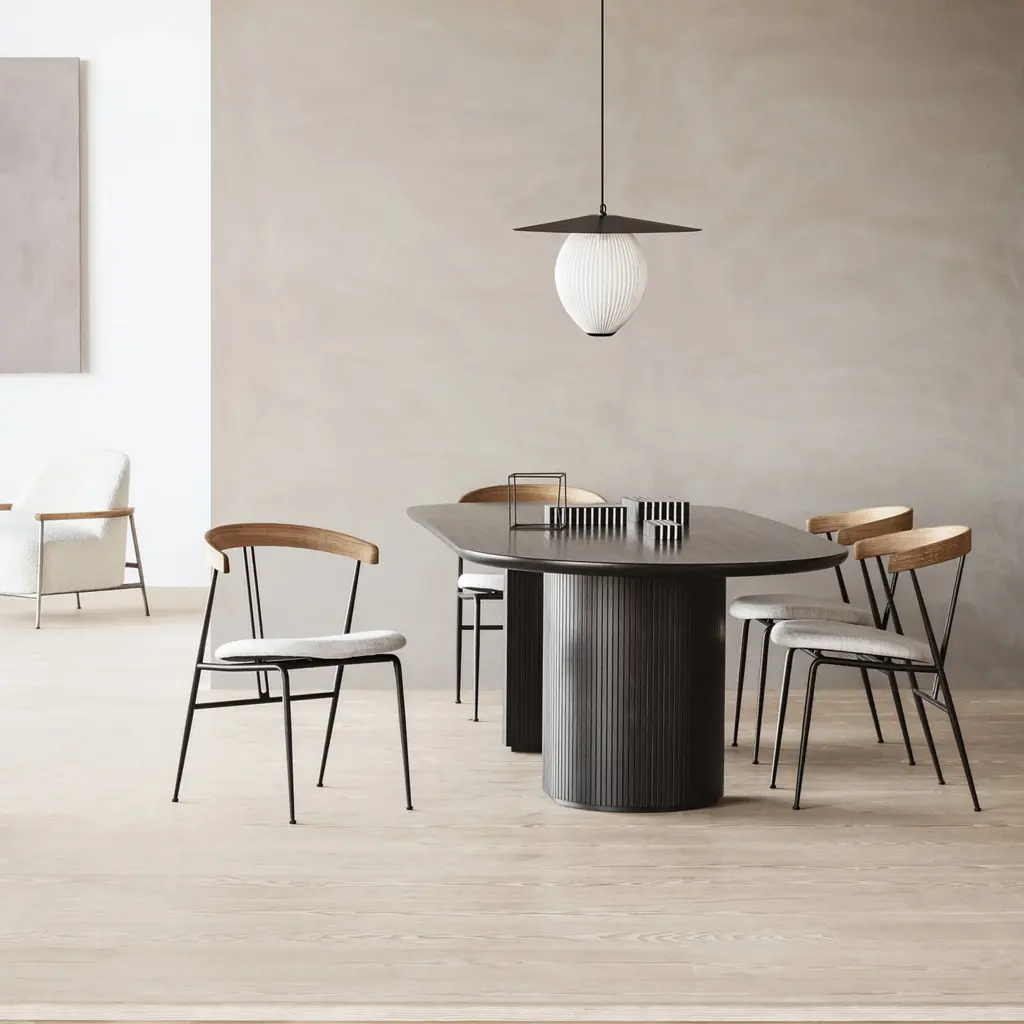 An upholstered seat customizes design duo GamFratesi’s uniquely creative Violin Chair. Suggesting its namesake instruments’s strings, 2 center lines lend a signature note as well as support for the curved backrest. A generous seat tops gently tapering, powder-coated steel legs, for a half-armchair look that serves as well at the dining table as it does as comfortable seating on its own.