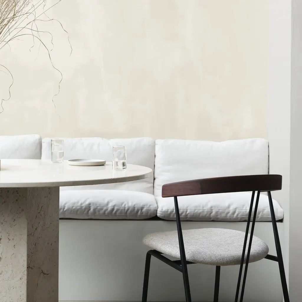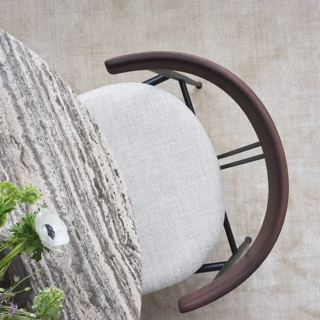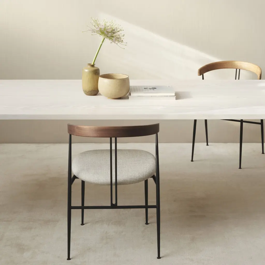 An upholstered seat customizes design duo GamFratesi’s uniquely creative Violin Chair. Suggesting its namesake instruments’s strings, 2 center lines lend a signature note as well as support for the curved backrest. A generous seat tops gently tapering, powder-coated steel legs, for a half-armchair look that serves as well at the dining table as it does as comfortable seating on its own.