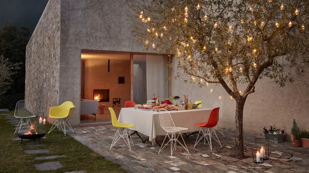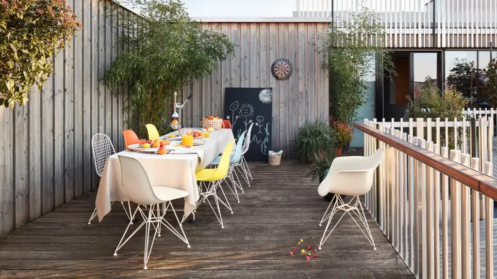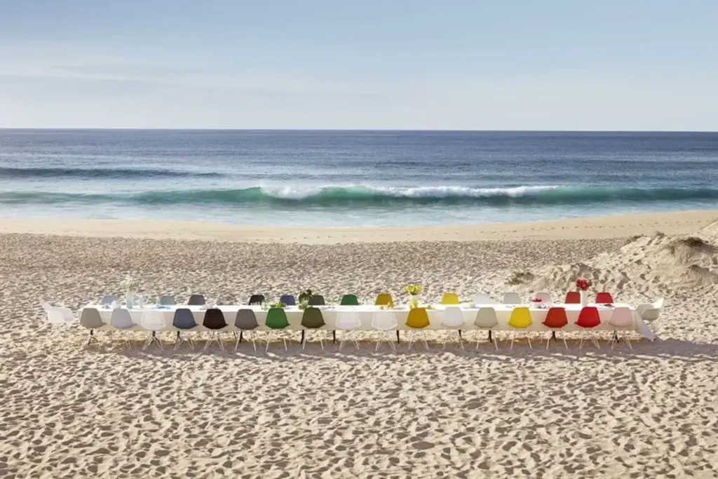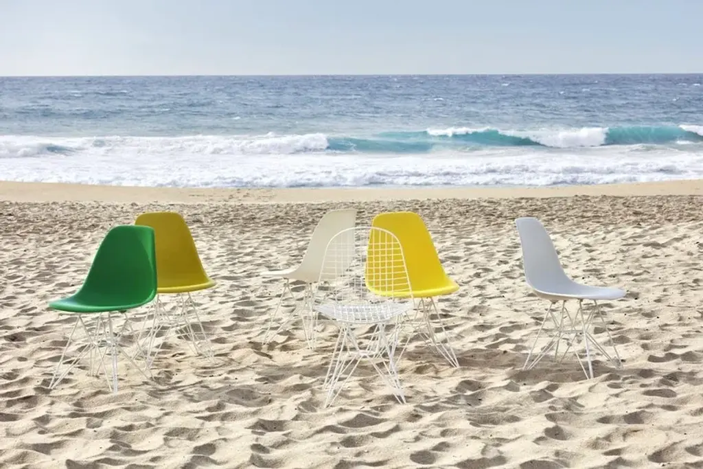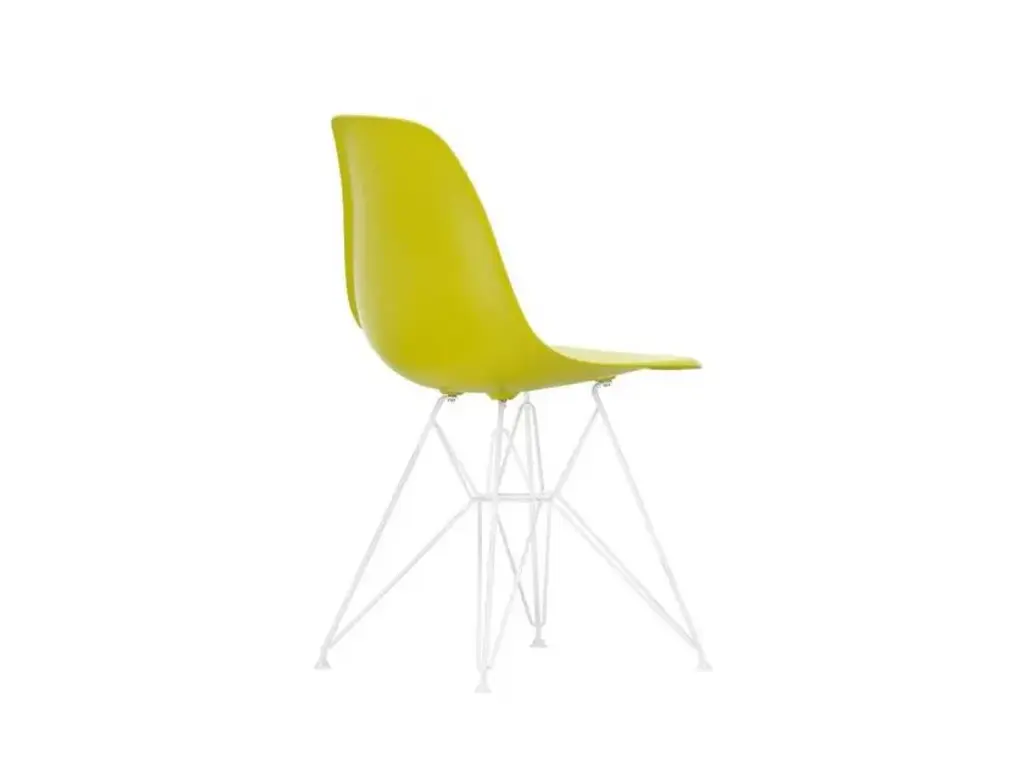 The so-called Eiffel Tower base of the DSR chair (Dining Height Side Chair Rod Base), an intricate and graceful construction made of steel wire, combines light, elegant forms with structural strength. The organically shaped plastic seat shell allows this distinctive classic by Charles and Ray Eames to be adapted to a wide range of individual needs and preferences.From January 2024 the shells of the Eames Plastic Chairs from Vitra are now made of recycled post-consumer plastic. These chairs are known as Eames Plastic Chairs RE. The recycling material stems from Germany's 'Yellow Bag' (Gelber Sack) collection of household waste, which primarily consists of used packaging. Utilising this recyclate instead of conventional plastic generates fewer climate-damaging emissions and significantly reduces energy consumption.Due to the composition of the recycled materials, the different colour versions of the seat shells are interspersed with tiny specks of pigment.- Seat shell: dyed-through polypropylene.- Base: non-stacking four-legged wire base with cross struts.Shell colour: CitroBase finishing: White powder-coated (smooth)Glides / Castors: Glides - Felt glides white for hard floor