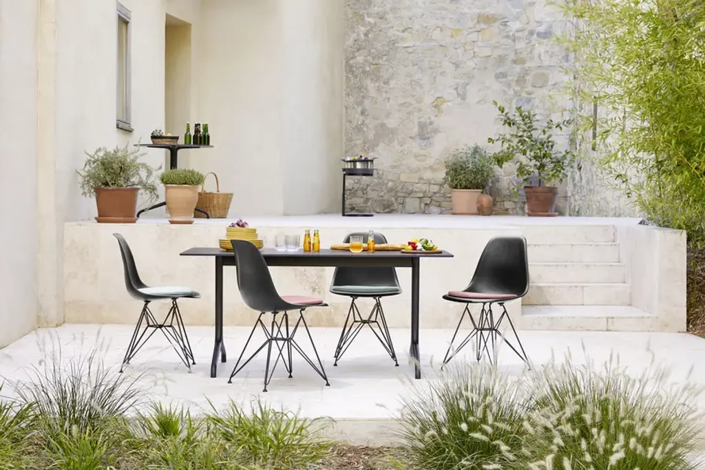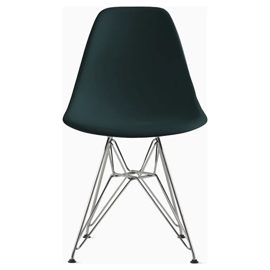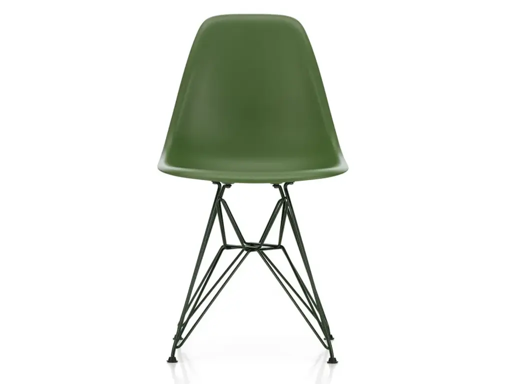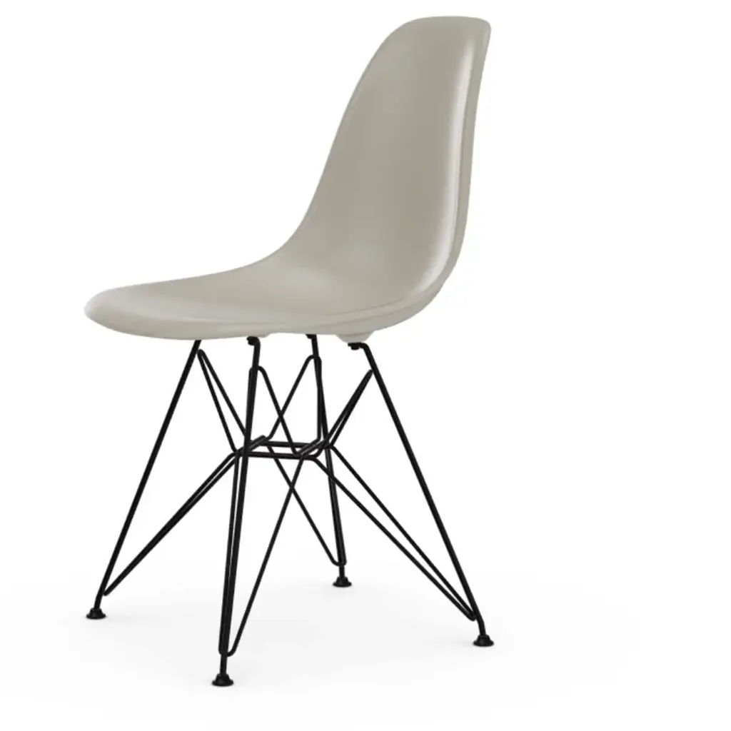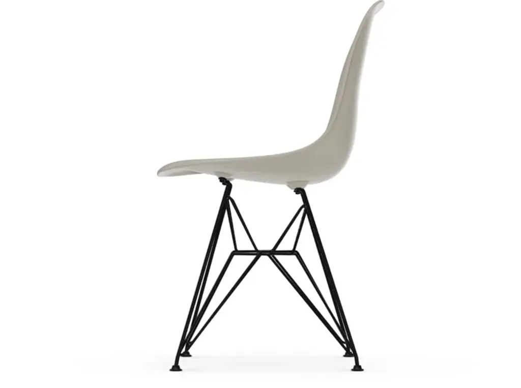 The so-called Eiffel Tower base of the DSR chair (Dining Height Side Chair Rod Base), an intricate and graceful construction made of steel wire, combines light, elegant forms with structural strength. The organically shaped plastic seat shell allows this distinctive classic by Charles and Ray Eames to be adapted to a wide range of individual needs and preferences.Colour of seat shell: pebbleBase colour: Coated, basic darkBase on: glides basic dark
