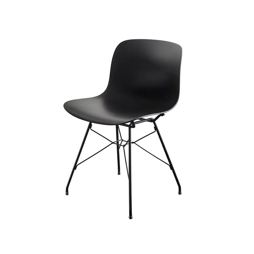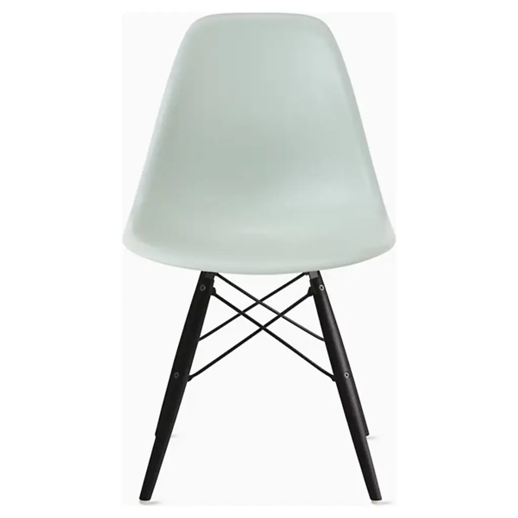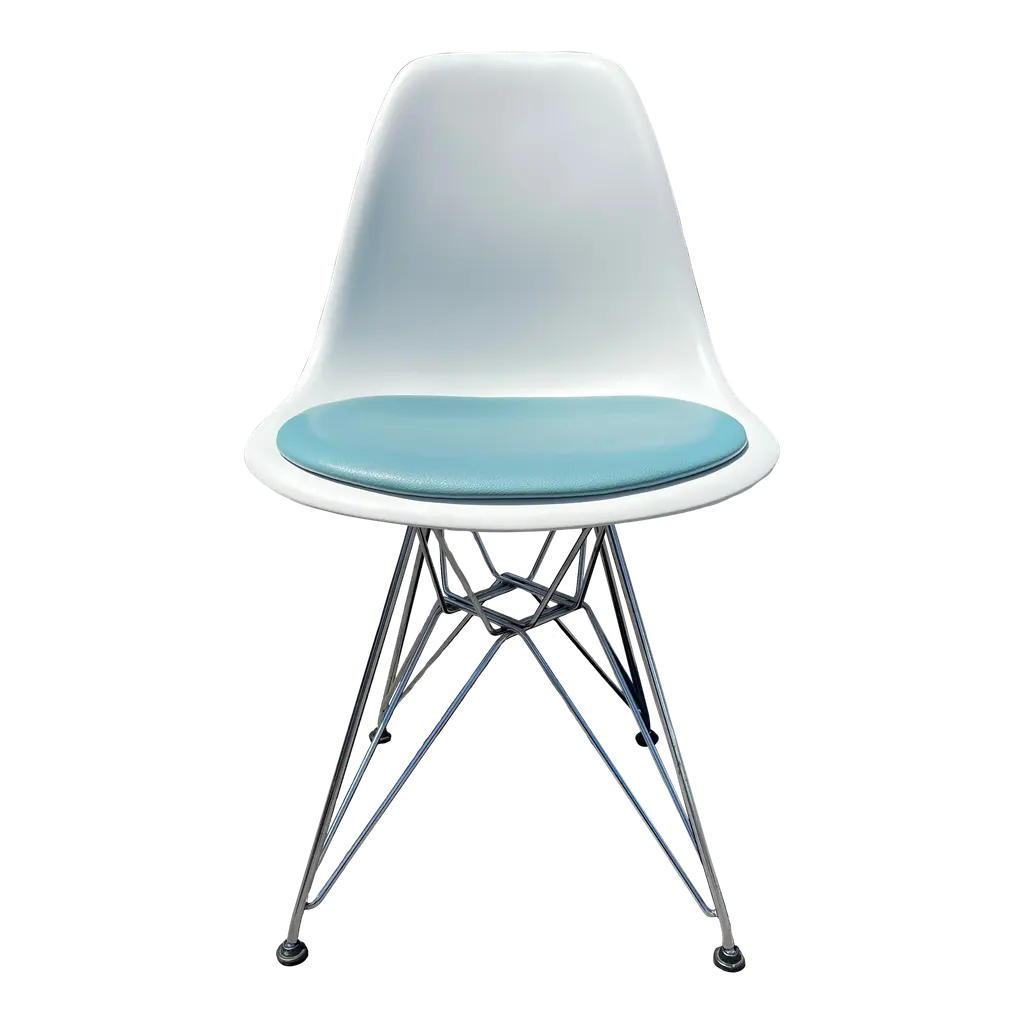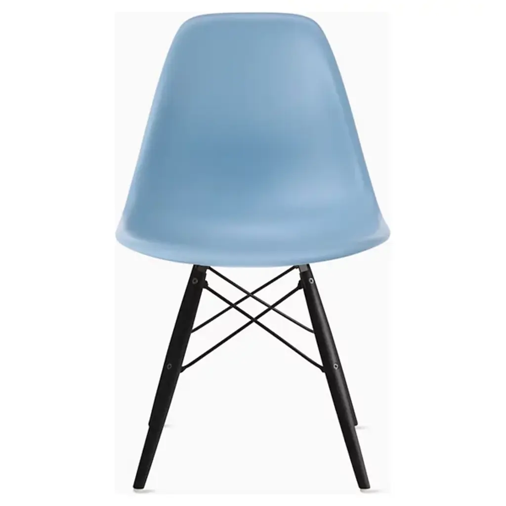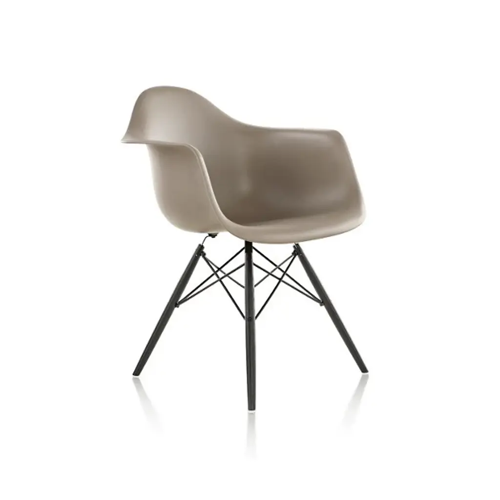 The so-called Eiffel Tower base of the DSR chair (Dining Height Side Chair Rod Base), an intricate and graceful construction made of steel wire, combines light, elegant forms with structural strength. The organically shaped plastic seat shell allows this distinctive classic by Charles and Ray Eames to be adapted to a wide range of individual needs and preferences.Colour of seat shell: pebbleBase colour: Coated, basic darkBase on: glides basic dark