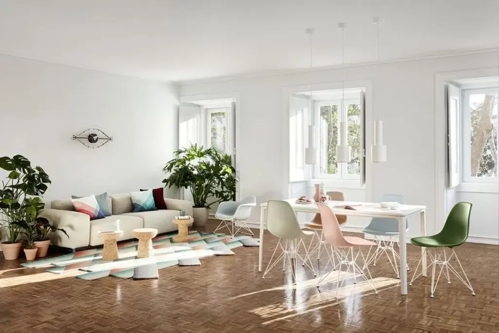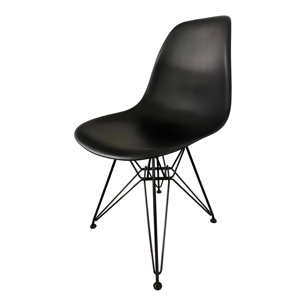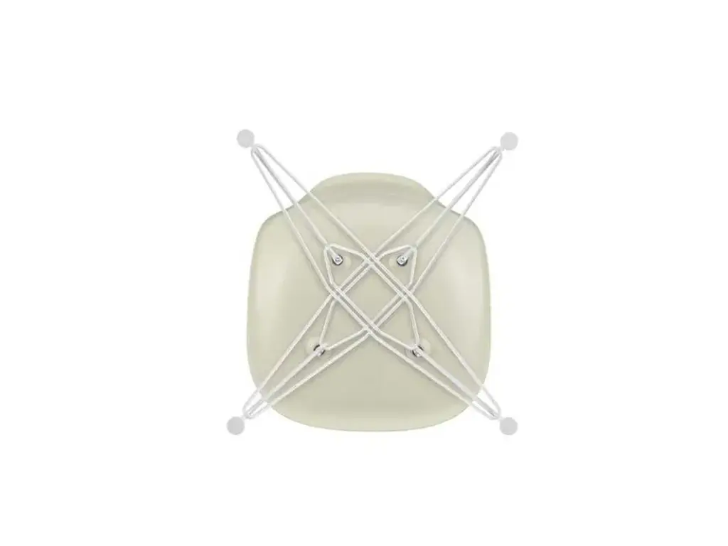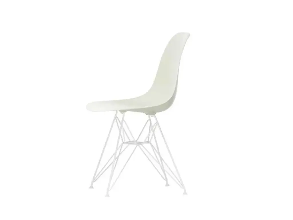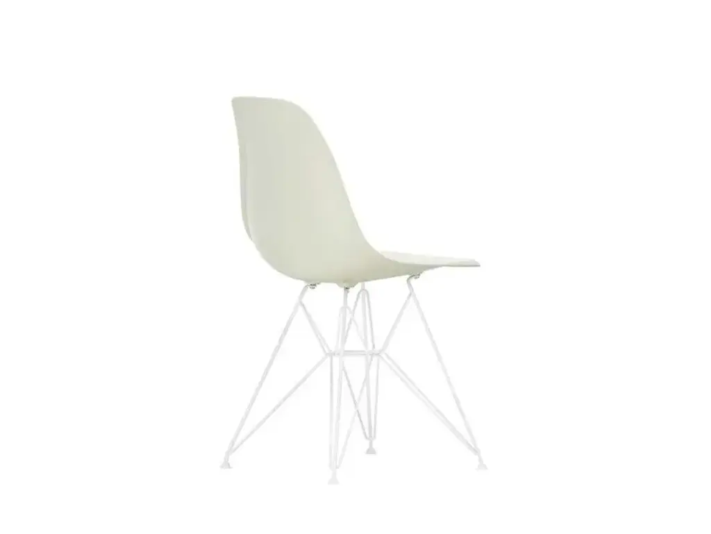 The so-called Eiffel Tower base of the DSR chair (Dining Height Side Chair Rod Base), an intricate and graceful construction made of steel wire, combines light, elegant forms with structural strength. The organically shaped plastic seat shell allows this distinctive classic by Charles and Ray Eames to be adapted to a wide range of individual needs and preferences.From January 2024 the shells of the Eames Plastic Chairs from Vitra are now made of recycled post-consumer plastic. These chairs are known as Eames Plastic Chairs RE. The recycling material stems from Germany's 'Yellow Bag' (Gelber Sack) collection of household waste, which primarily consists of used packaging. Utilising this recyclate instead of conventional plastic generates fewer climate-damaging emissions and significantly reduces energy consumption.Due to the composition of the recycled materials, the different colour versions of the seat shells are interspersed with tiny specks of pigment.- Seat shell: dyed-through polypropylene.- Base: non-stacking four-legged wire base with cross struts.Shell colour: PeebleBase finishing: White powder-coated (smooth)Glides / Castors: Glides - Felt glides white for hard floor