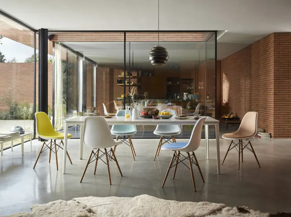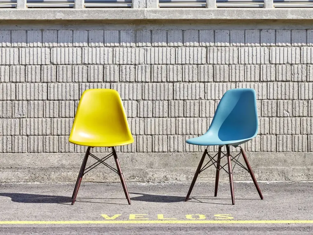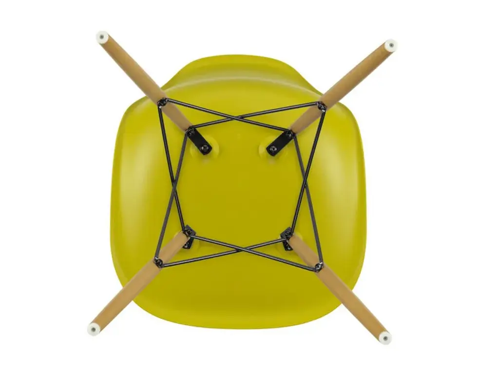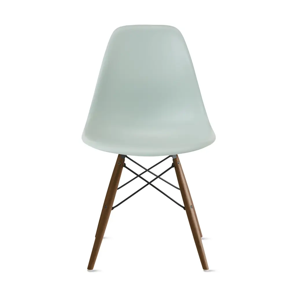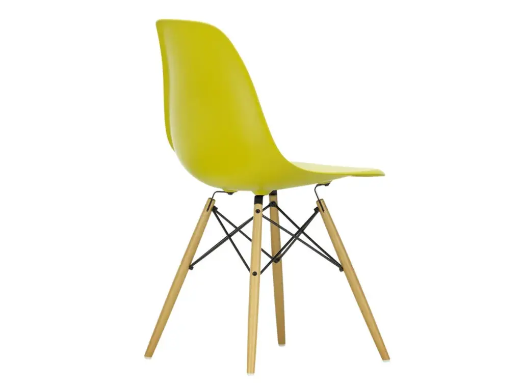 For the Dining Height Side Chair Wood Base (DSW), Charles and Ray Eames combined the organically shaped seat shell with a four-legged wooden base. This mix of plastic and wood lends the classic design a certain warmth and casual appeal. Material description- Seat shell: dyed-through polypropylene.- Base: non-stackable wooden base in maple- Basic dark felt inserts for hard floors