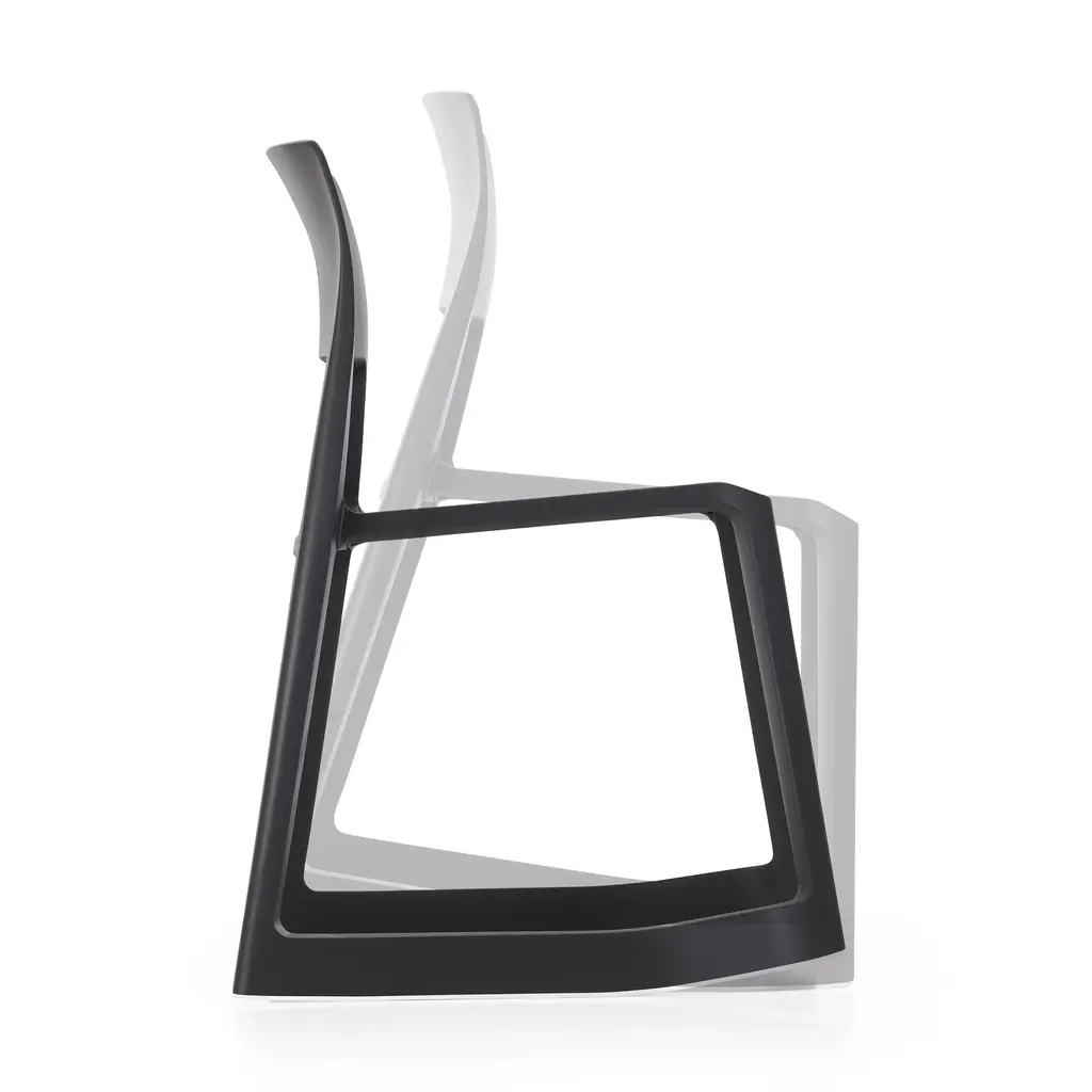 Part rocker and part stackable side chair, Edward Barber & Jay Osgerby’s design incorporates an innovative twist: A forward-canted position that encourages a more upright posture. The all-plastic design has a comfortably curved backrest and can be stacked up to four chairs high for convenient storage. Available in eight saturated colors, it’s a versatile chair for dining tables, libraries, or playrooms. 100% recyclable material. All colors except red, mustard, and cactus are suitable for outdoor use. Made in Germany by Vitra, a manufacturer of iconic modern furnishings that’s widely represented in the Museum’s collection.