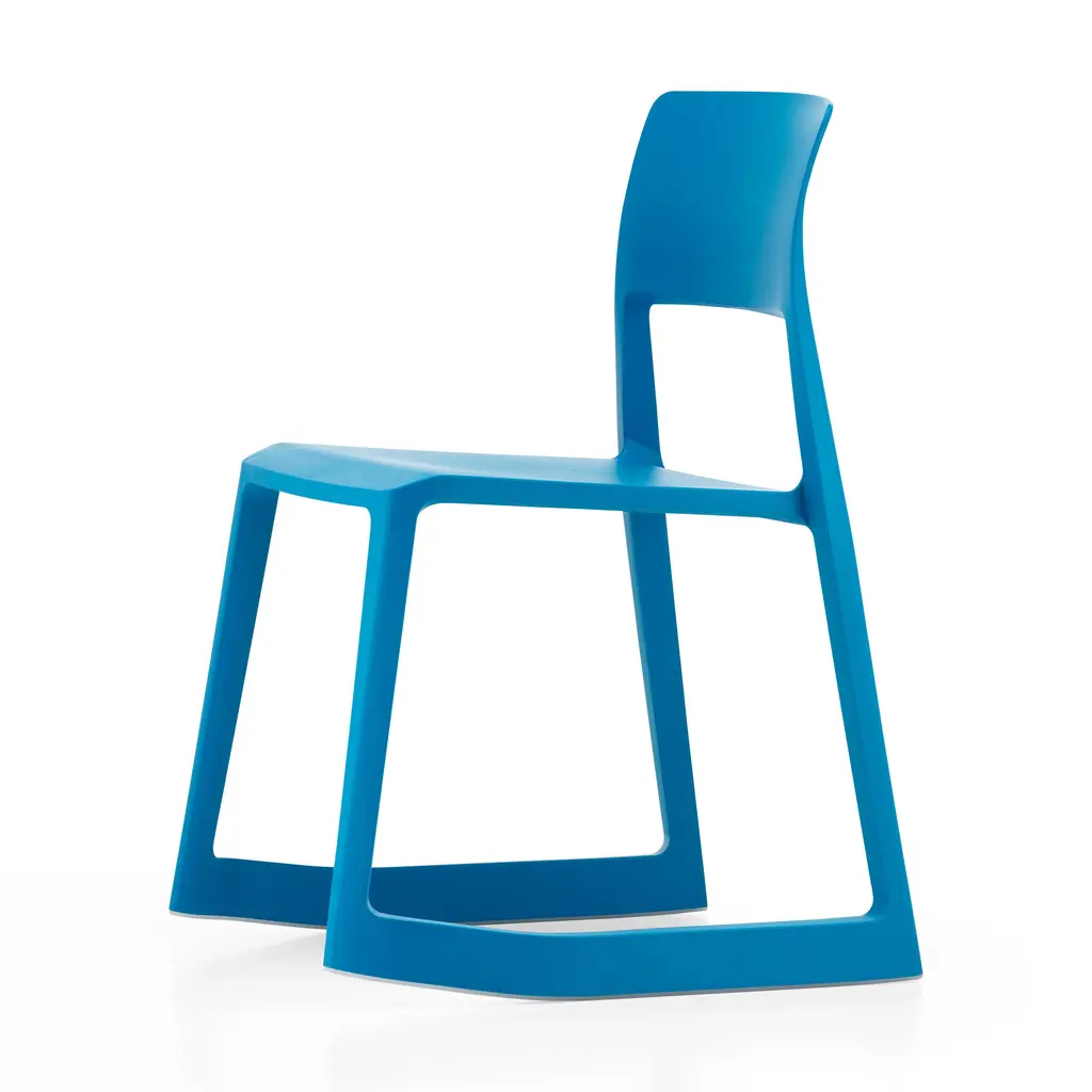 Part rocker and part stackable side chair, Edward Barber & Jay Osgerby’s design incorporates an innovative twist: A forward-canted position that encourages a more upright posture. The all-plastic design has a comfortably curved backrest and can be stacked up to four chairs high for convenient storage. Available in eight saturated colors, it’s a versatile chair for dining tables, libraries, or playrooms. 100% recyclable material. All colors except red, mustard, and cactus are suitable for outdoor use. Made in Germany by Vitra, a manufacturer of iconic modern furnishings that’s widely represented in the Museum’s collection.