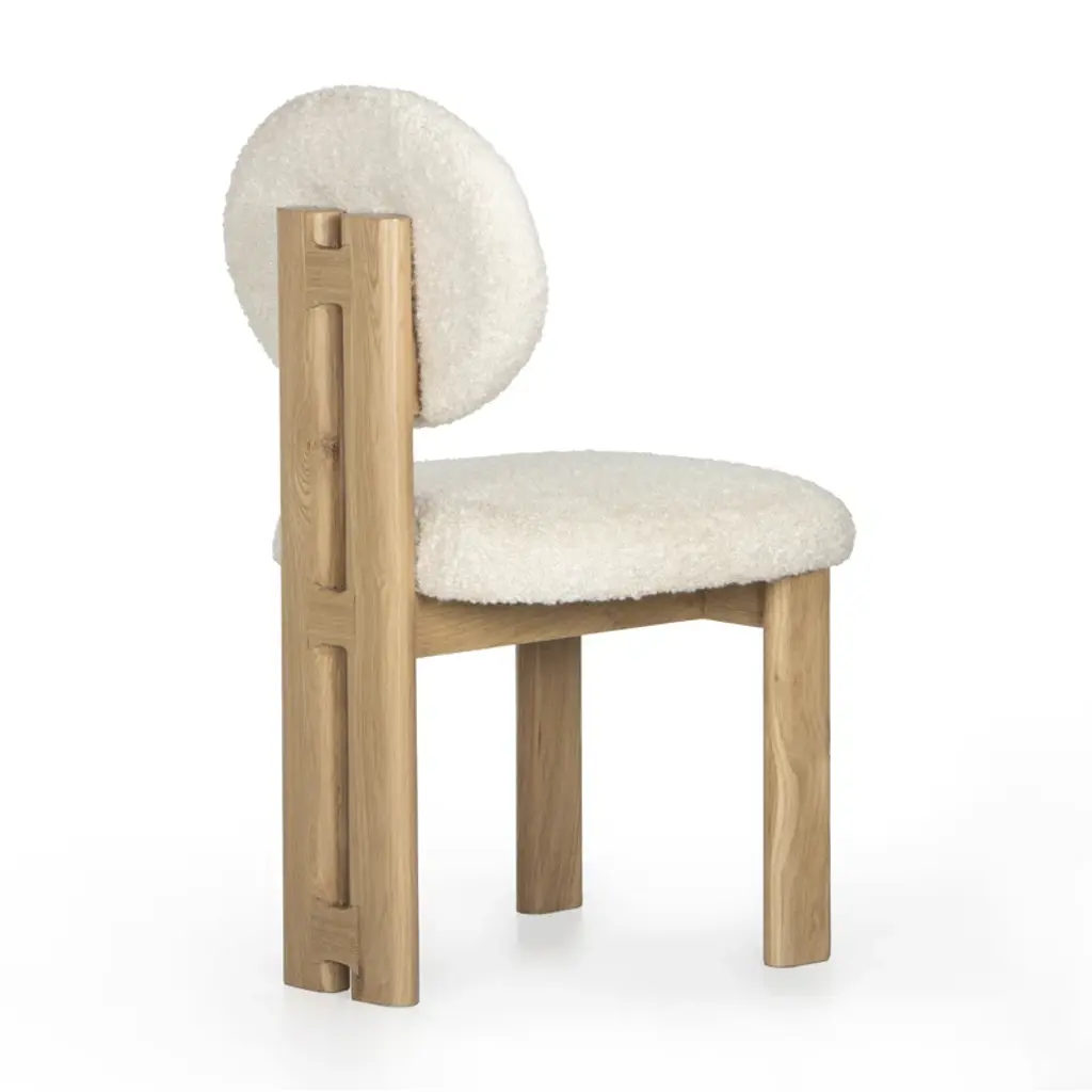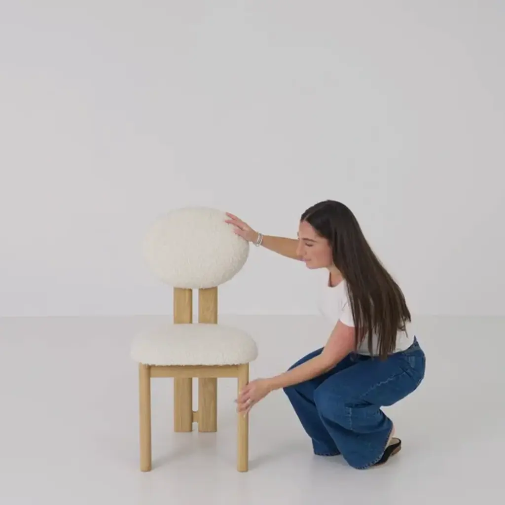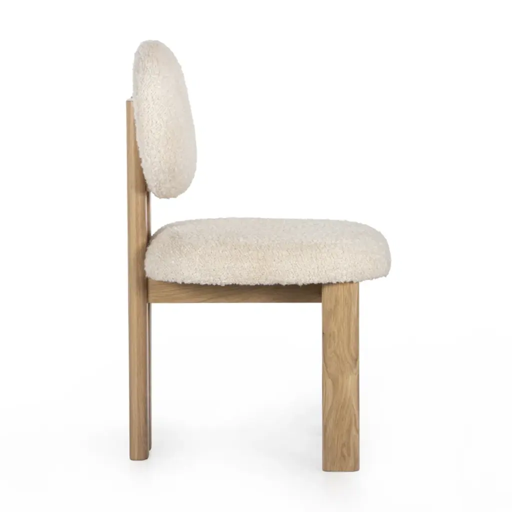 Modern meets rustic. Our side chair features FSC-certified solid oak legs connected by elegant butterfly joints, showcasing its honest construction. The sculptural seat and back are upholstered in upcycled boucle fabric, blending texture and style. Foam-filled cushions provide comfort, while the natural wood grain color variation adds an organic touch. A versatile piece that complements any space, from dining rooms to home offices. Arrives fully assembled.