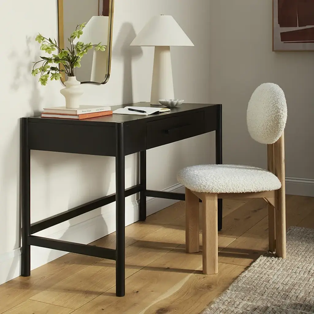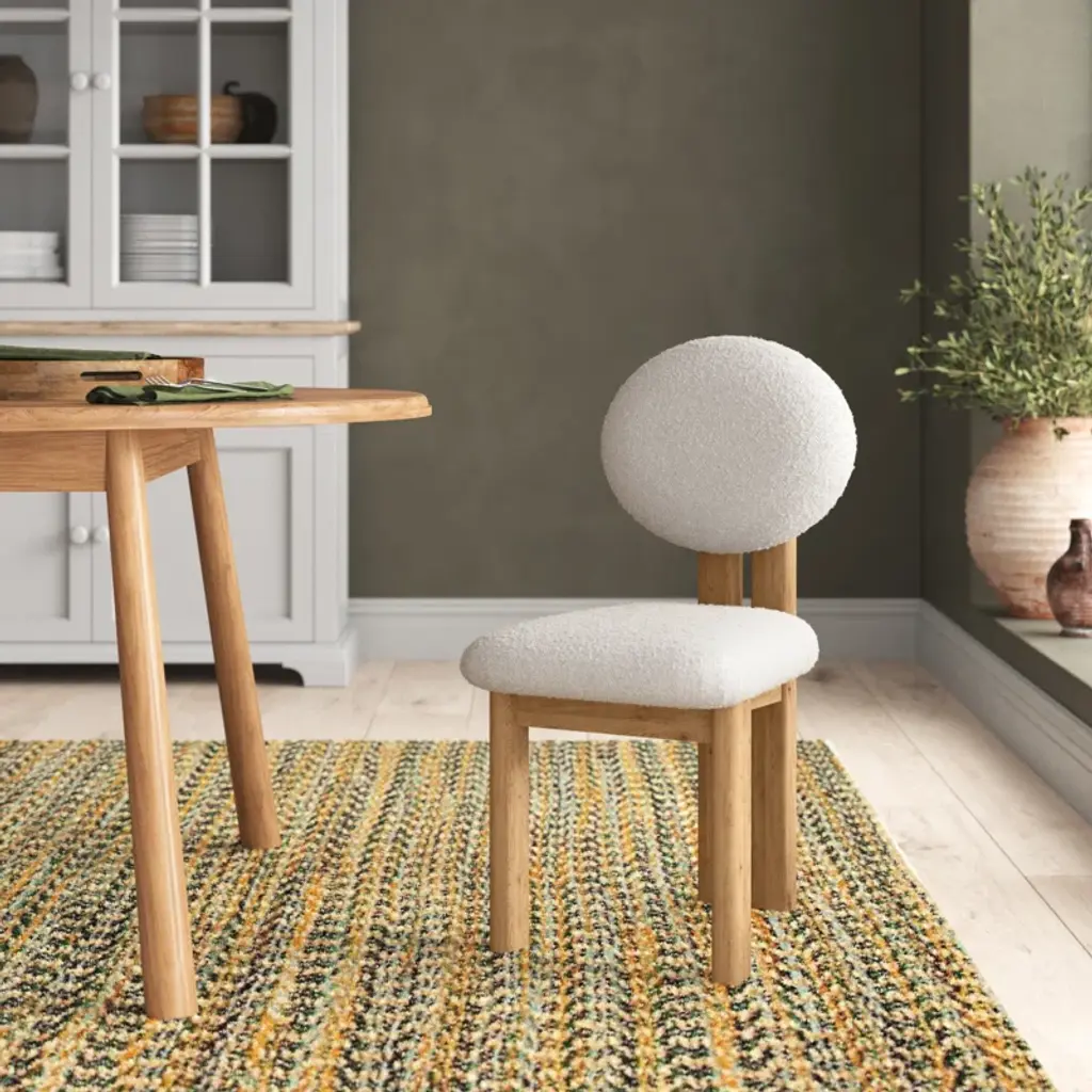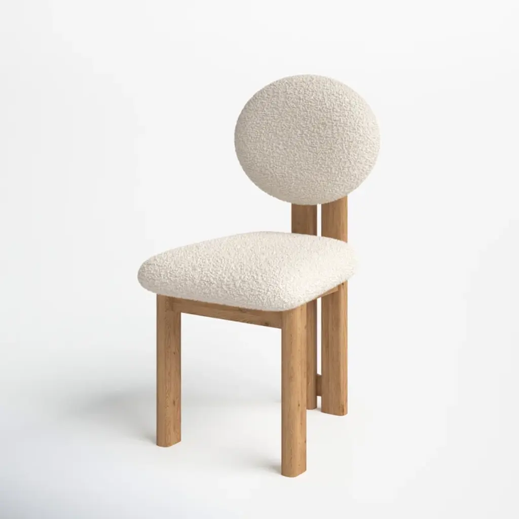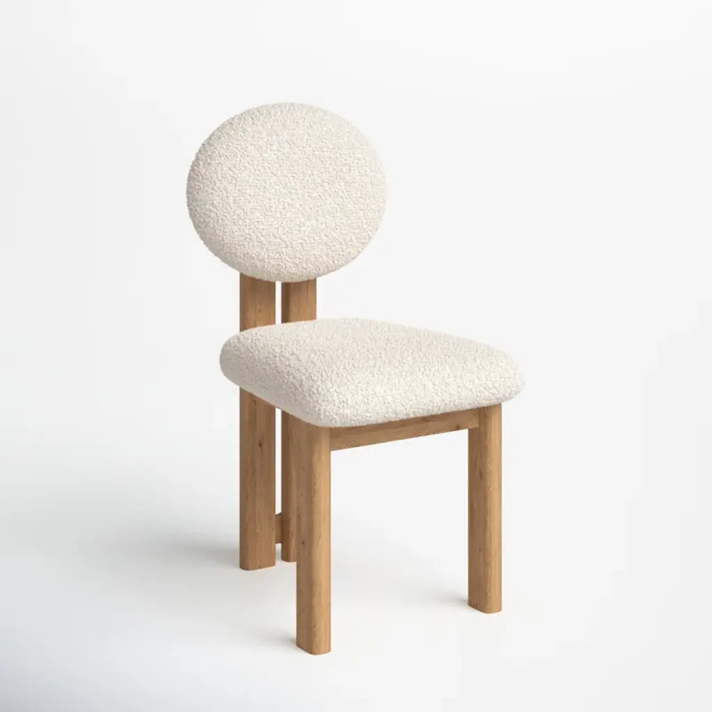Modern meets rustic. Our side chair features FSC-certified solid oak legs connected by elegant butterfly joints, showcasing its honest construction. The sculptural seat and back are upholstered in upcycled boucle fabric, blending texture and style. Foam-filled cushions provide comfort, while the natural wood grain color variation adds an organic touch. A versatile piece that complements any space, from dining rooms to home offices. Arrives fully assembled.
