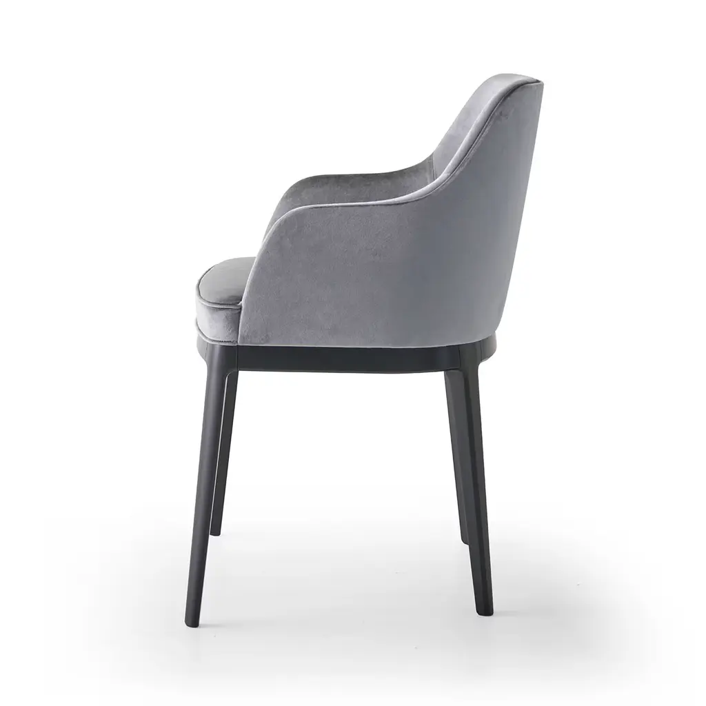 Clean lines and harmonious curves speak to this armchair's subdued elegance. Ideally gathered with twins around a contemporary dining table, it features matte-black-lacquered beech legs that sustain the seat covered in elegant gray-hued velvet. Long-lasting comfort is aided by the enveloping shell's sinuous sides and generous foam padding lined with thermo-regulated fibers and sealed by elastic belts.