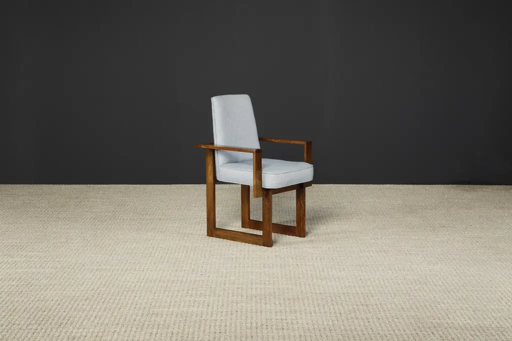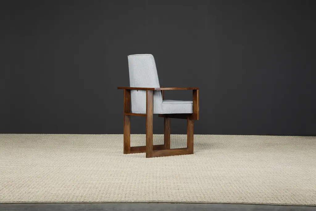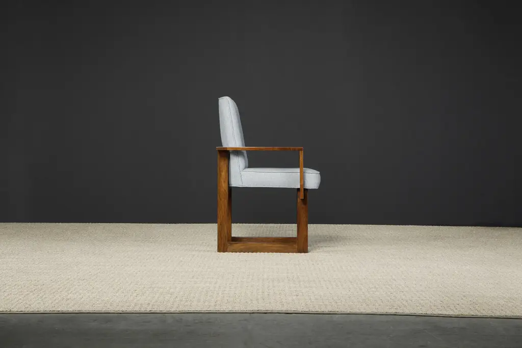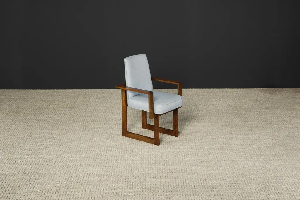 A beautiful set of Vladimir Kagan model #6724 sled based 'Cubist' chairs, circa 1967 New York. These dining armchairs feature walnut frames in an angular geometric form. *Note, we have 6 armchairs available, priced in this listing as pairs. We also have a pair of matching side chairs also available in another listing. Designed in 1967, this set presumably very early examples as they have the rare slightly rounded scalloped back vs the flat ones commonly found. It's worth noting that documentation suggests these chairs may have served as prototypes, further enhancing their historical significance. Additionally, they are famously associated with the 'Nobu' nickname, stemming from their prominent use by architect Michael Gabellini at Giorgio Armani's Nobu restaurant in Milan. This opulent pair of 6724 Sled Based Cubis dining arm chairs by Vladimir Kagan would look amazing in a Postmodern, Memphis, Art Deco, Mid-Century Modern, Contemporary, Traditional, Transitional, Neoclassical, Hollywood Regency, or Mixed Style home or office. This beautiful set of side chairs can be used together or individually throughout the home in locations such as a dining room, living room, den, games room, office space, entryway or bedroom. They would also be perfect in a hospitality or corporate location, such as a boutique hotel lobby, cocktail bar, members club, workspace studio, executive office or in a luxe clothing emporium. PROVENANCE: The Estate of Marvin Oleshansky MEASUREMENTS: H 35.5" x W 23" x D 22.5" Seat Height: 19" Seat Depth: 19" Arm Height: 25" CONDITION: Good vintage condition with light wear and patina. Light scratches and minor scuffs to wood. Fabric with light fading and wear. Can be refinished and reupholstered or used immediately in vintage condition.