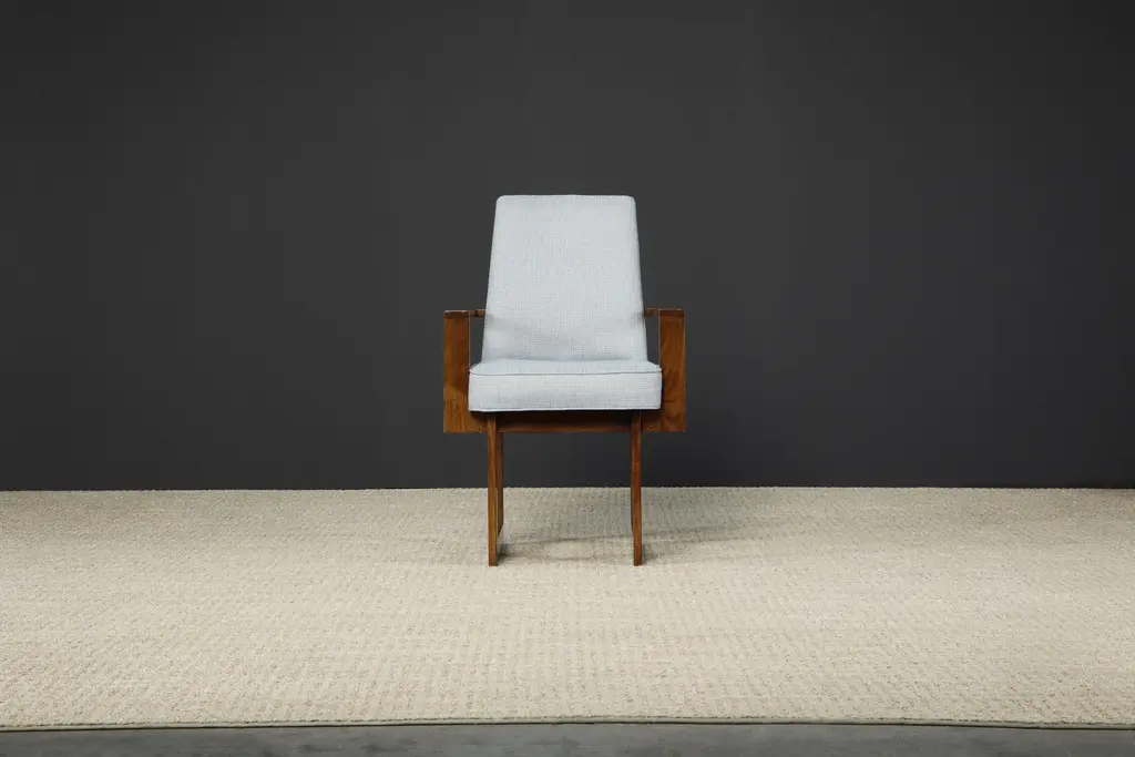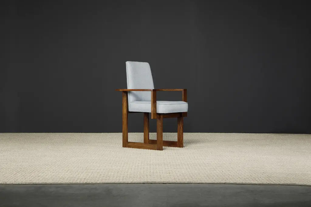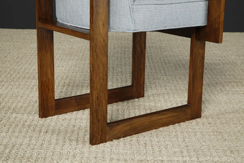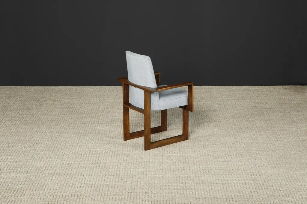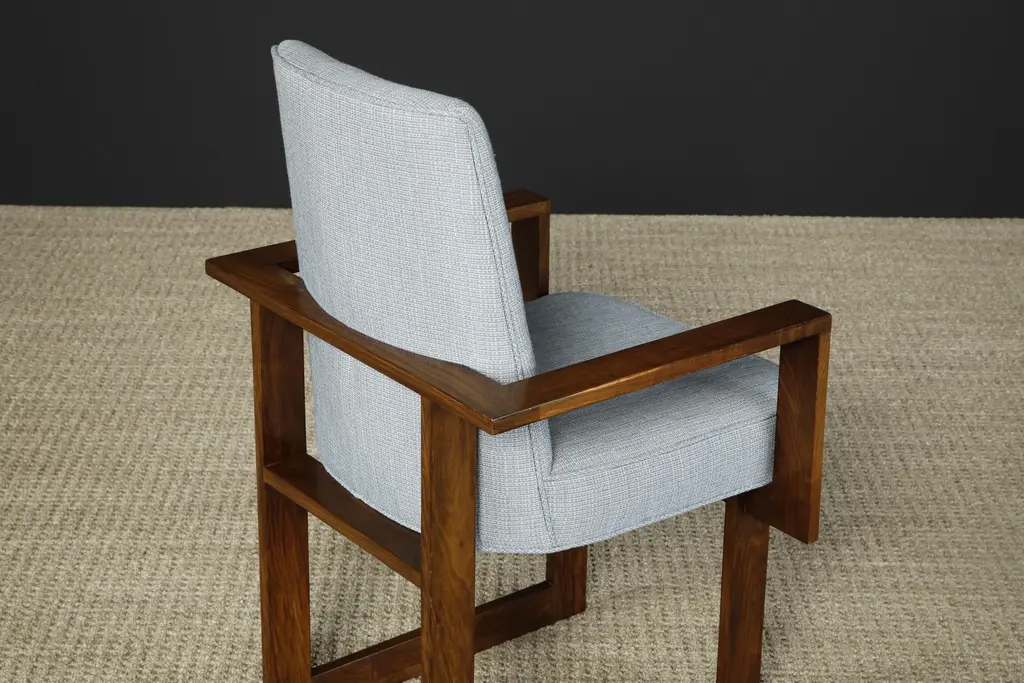A beautiful set of Vladimir Kagan model #6724 sled based 'Cubist' chairs, circa 1967 New York. These dining armchairs feature walnut frames in an angular geometric form. *Note, we have 6 armchairs available, priced in this listing as pairs. We also have a pair of matching side chairs also available in another listing. Designed in 1967, this set presumably very early examples as they have the rare slightly rounded scalloped back vs the flat ones commonly found. It's worth noting that documentation suggests these chairs may have served as prototypes, further enhancing their historical significance. Additionally, they are famously associated with the 'Nobu' nickname, stemming from their prominent use by architect Michael Gabellini at Giorgio Armani's Nobu restaurant in Milan. This opulent pair of 6724 Sled Based Cubis dining arm chairs by Vladimir Kagan would look amazing in a Postmodern, Memphis, Art Deco, Mid-Century Modern, Contemporary, Traditional, Transitional, Neoclassical, Hollywood Regency, or Mixed Style home or office. This beautiful set of side chairs can be used together or individually throughout the home in locations such as a dining room, living room, den, games room, office space, entryway or bedroom. They would also be perfect in a hospitality or corporate location, such as a boutique hotel lobby, cocktail bar, members club, workspace studio, executive office or in a luxe clothing emporium. PROVENANCE: The Estate of Marvin Oleshansky MEASUREMENTS: H 35.5" x W 23" x D 22.5" Seat Height: 19" Seat Depth: 19" Arm Height: 25" CONDITION: Good vintage condition with light wear and patina. Light scratches and minor scuffs to wood. Fabric with light fading and wear. Can be refinished and reupholstered or used immediately in vintage condition.
