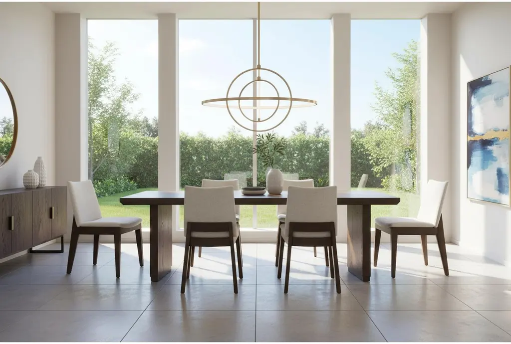 The Voyage Brown Wood Trestle Dining Set for 6 by Nate Berkus + Jeremiah Brent offers a modern touch to your dining room or kitchen. Constructed from solid hardwood and featuring cathedral oak veneers, this 94" rectangular table is complemented by upholstered dining chairs in a chic new brown and white color scheme. Perfect for family meals or entertaining guests, this 7-piece set combines style and functionality effortlessly.