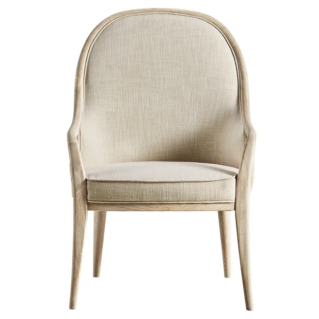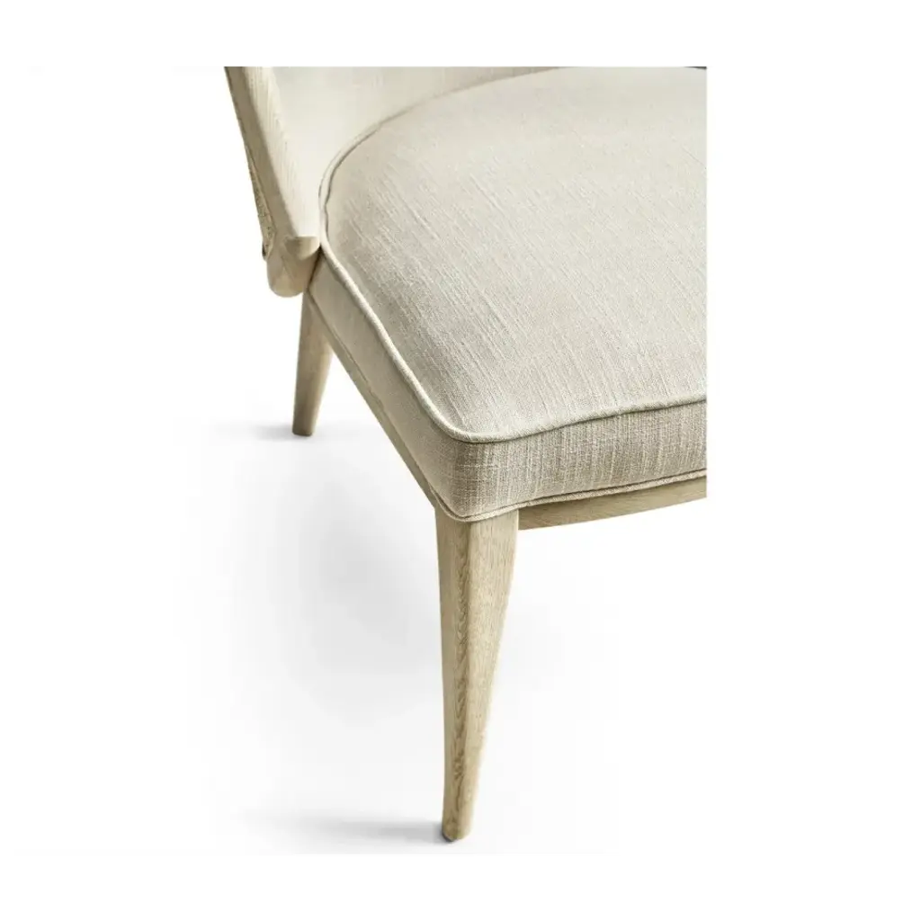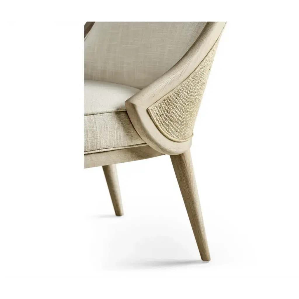 001-2-132-WWO Comfortable and elegant, this Jonathan Charles Dining Arm Chair embodies the beauty of simplicity with organic forms and clean lines for a contemporary aesthetic. The creamy texture of the fabric instills wonder and a deep sense of connection to the natural world. Inspired by the deep wells where water rests and stills, this chair, solidified with an Oak frame in White Washed Oak, provides the perfect luxuriating dining experience for modern coastal interiors.