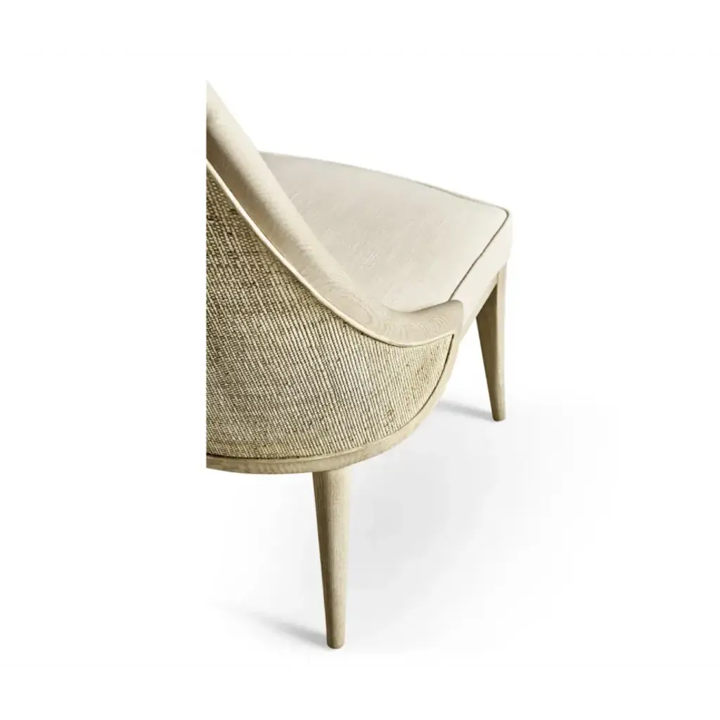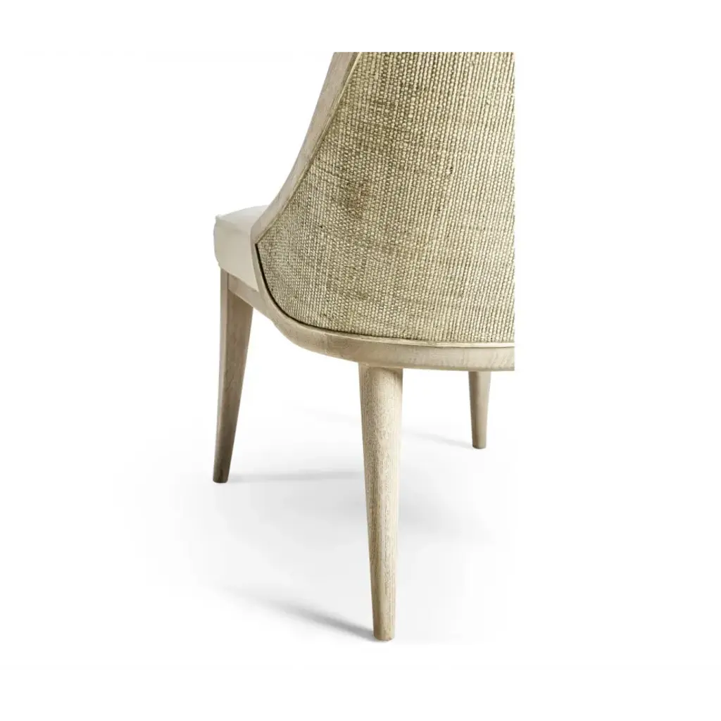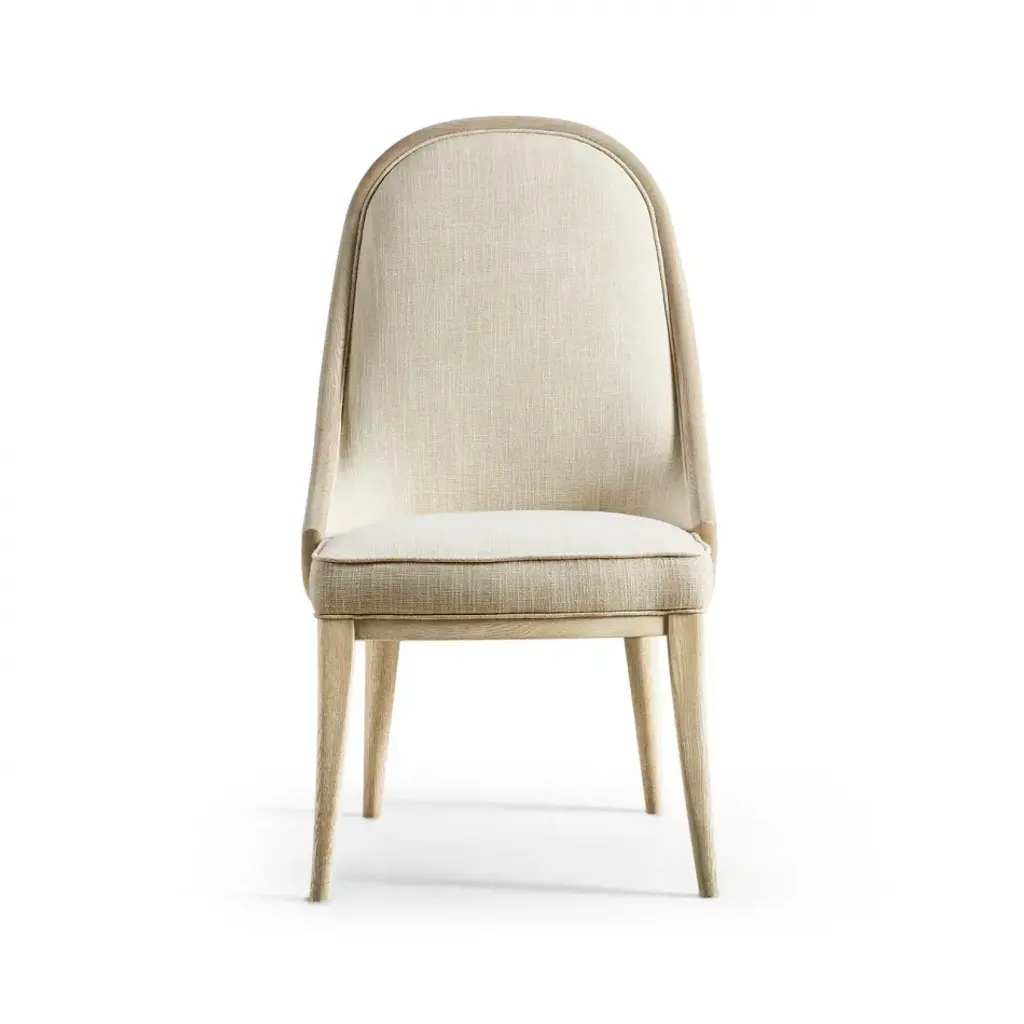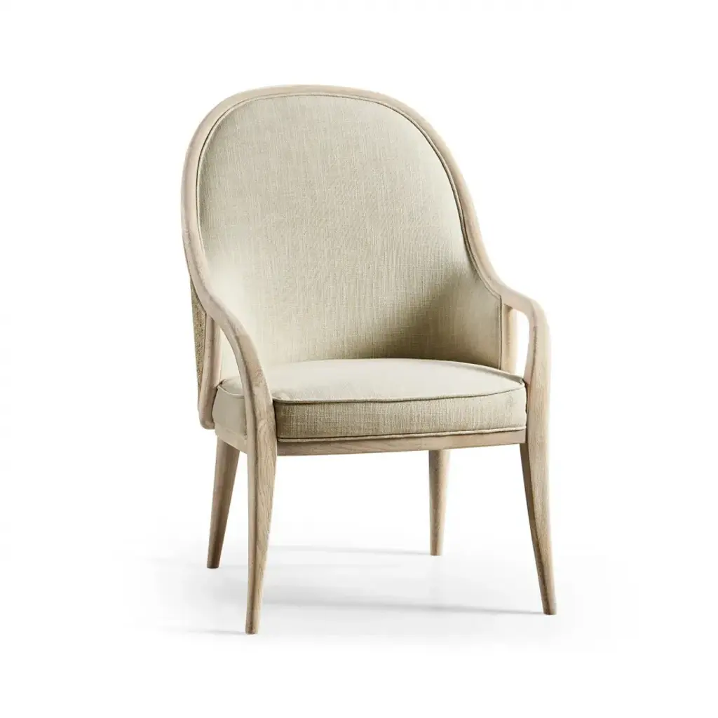 001-2-132-WWO Comfortable and elegant, this Jonathan Charles Dining Arm Chair embodies the beauty of simplicity with organic forms and clean lines for a contemporary aesthetic. The creamy texture of the fabric instills wonder and a deep sense of connection to the natural world. Inspired by the deep wells where water rests and stills, this chair, solidified with an Oak frame in White Washed Oak, provides the perfect luxuriating dining experience for modern coastal interiors.