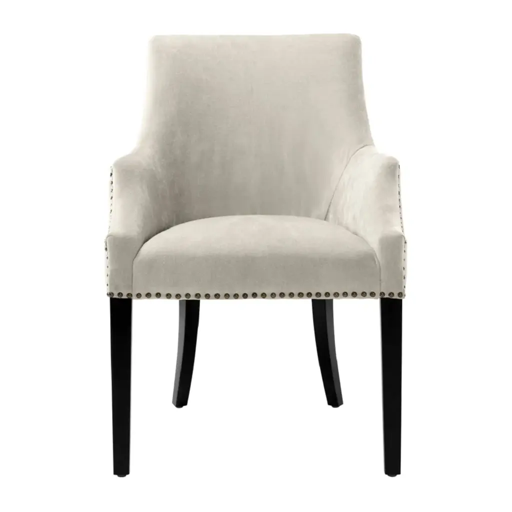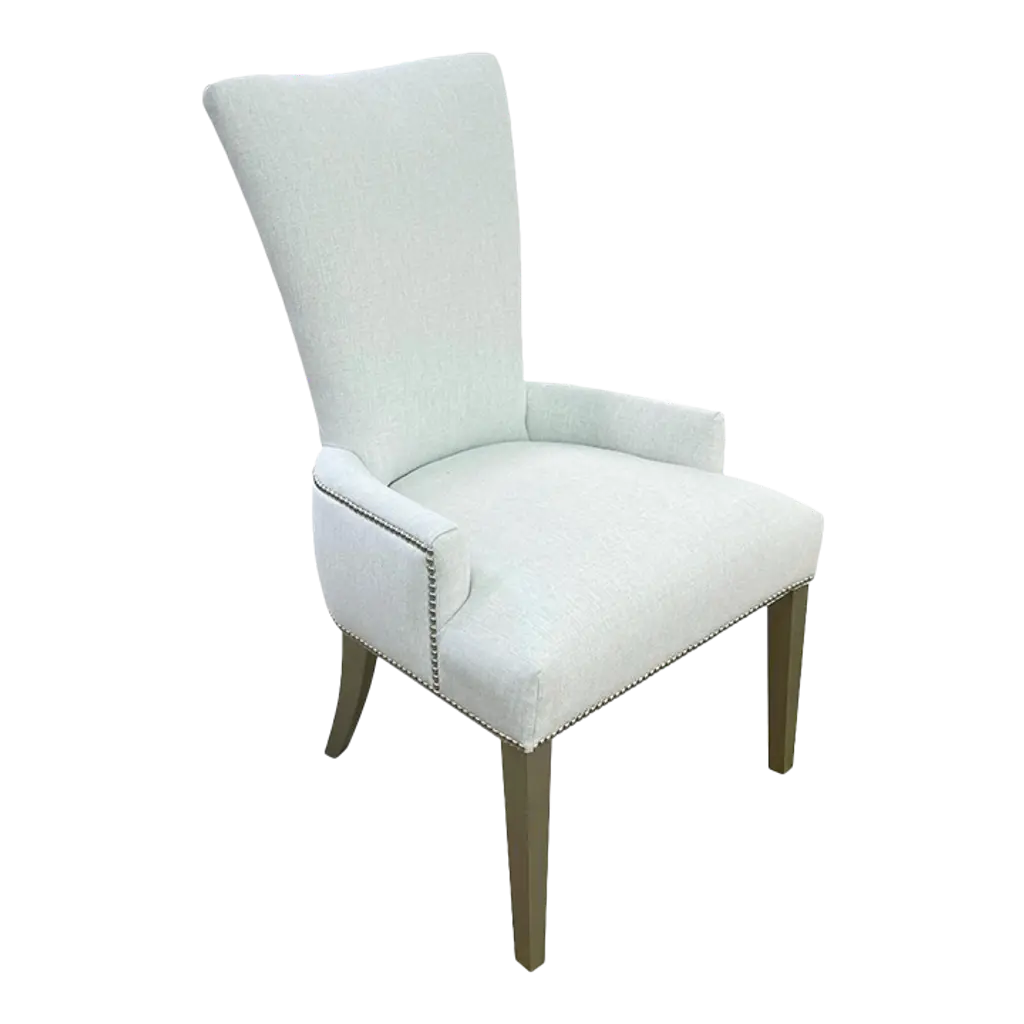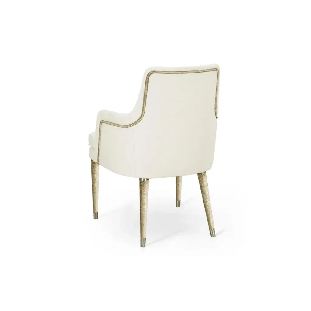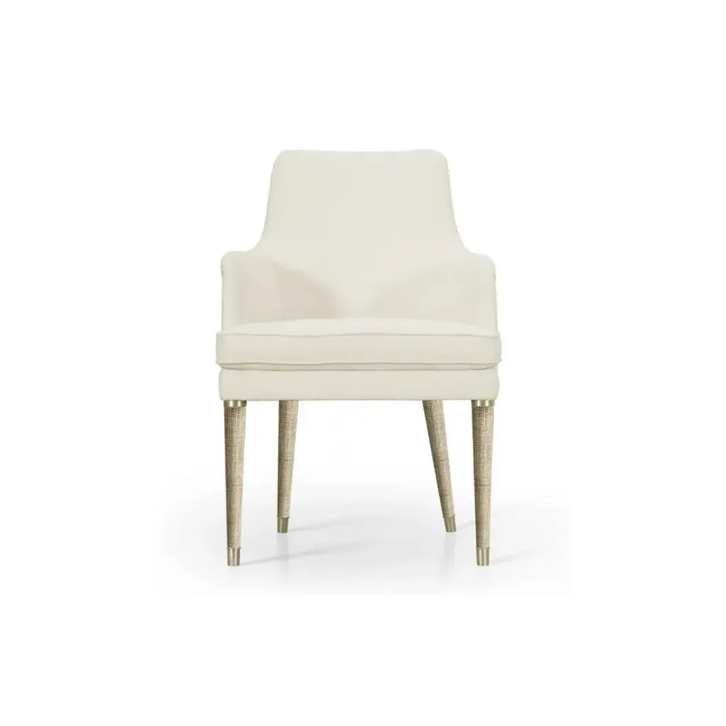 001-2-030-LOW Uninhibited focus on timeless design, tested durability and supreme comfort is at the root of Jonathan Charles' Shoal Linen & Grasscloth Host Chair. Upholstered in a performance Linen with Grasscloth welt, this dining chair is supported by stylish legs wrapped in Grasscloth with Stainless Steel collar and ferrules in Satin White Brass Finish. Perfect luxuriating dining experiences in modern tropical interiors.