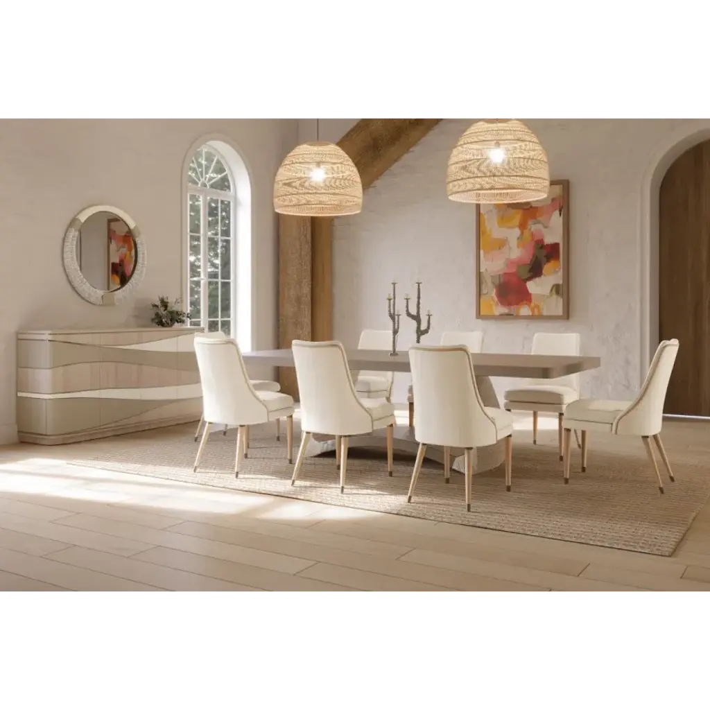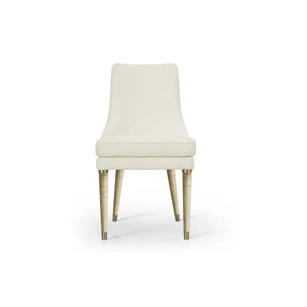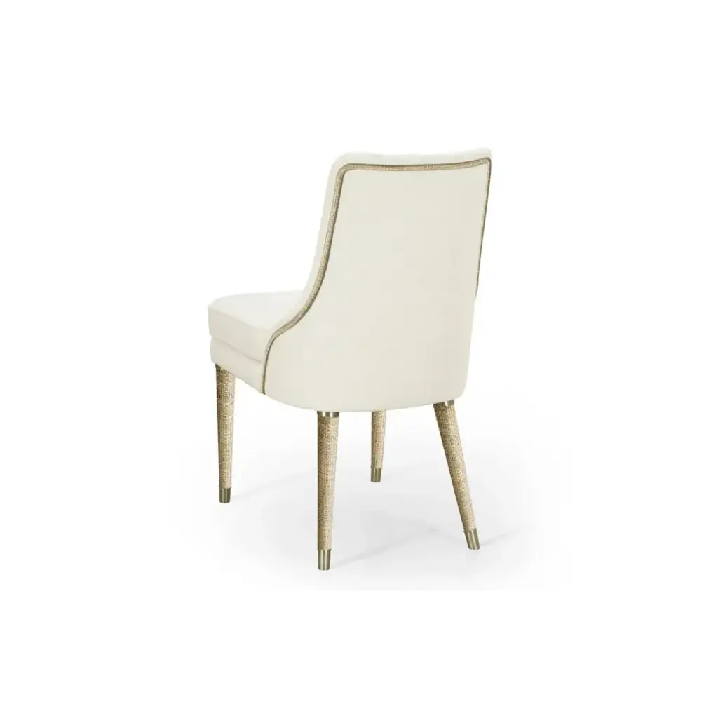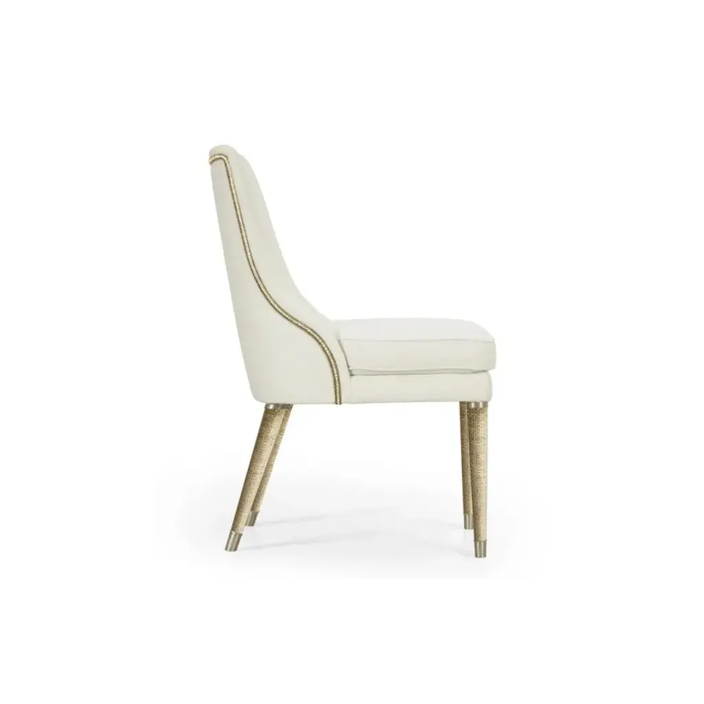 001-2-131-LOW Uninhibited focus on timeless design, tested durability and supreme comfort is at the root of Jonathan Charles' Shoal Linen & Grasscloth Side Chair. Upholstered in a performance Linen with Grasscloth welt, this dining chair is supported by stylish legs wrapped in Grasscloth with Stainless Steel collar and ferrules in Satin White Brass Finish. Perfect luxuriating dining experiences in modern tropical interiors.