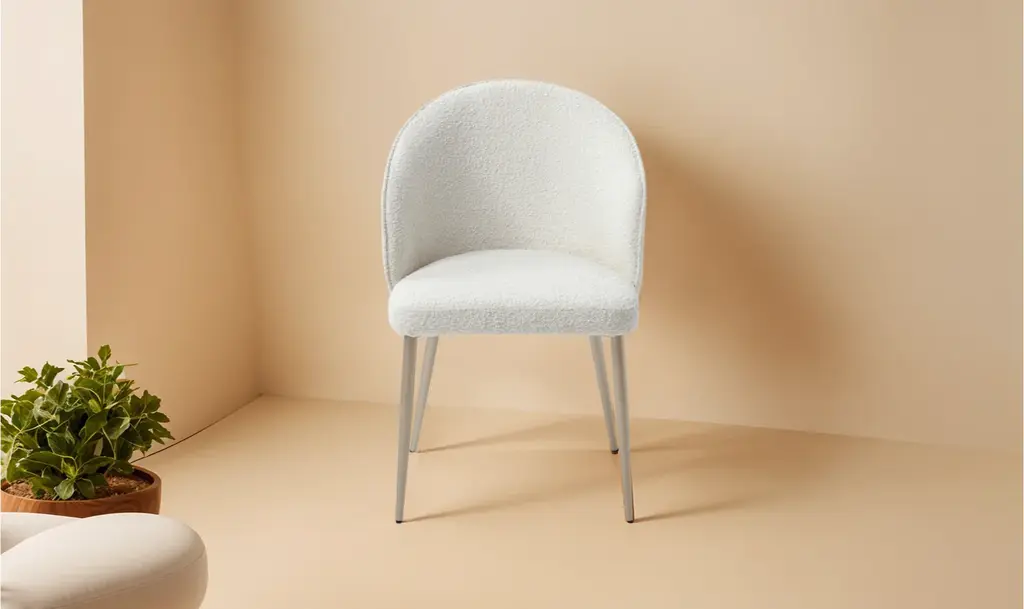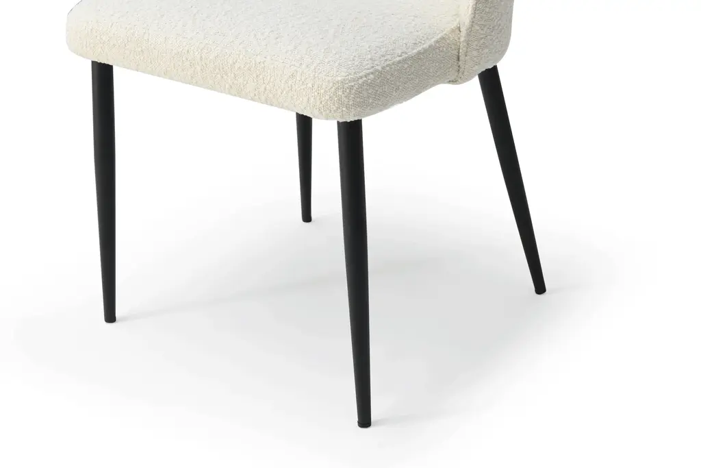 Wave Dining Chair, which features matching Black sanding painted legs, the overall dining set exudes a cohesive and luxurious look. The combination of the white marble tabletop, black sanding legs, and comfortable seating of the dining chairs creates a sophisticated and inviting atmosphere for dining and entertaining.Dining chairs:Fabric: Lamb Wool FabricLegs: Black sanding powder coating