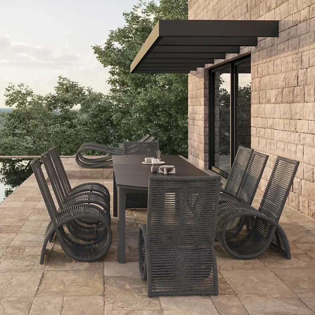 The Wave Outdoor Dining Chair, Set of 2 from Azzurro Living elevates the act of dining into an encounter with sculptural artistry. Its body-conscious curves flow in one unbroken gesture, where tightly woven textelene rope creates a linear texture against the chair's undulating aluminum frame. The design captures the essence of natural wave motion through calculated proportions and rhythmic material application, creating fluid geometry that adds kinetic energy to outdoor dining arrangements.