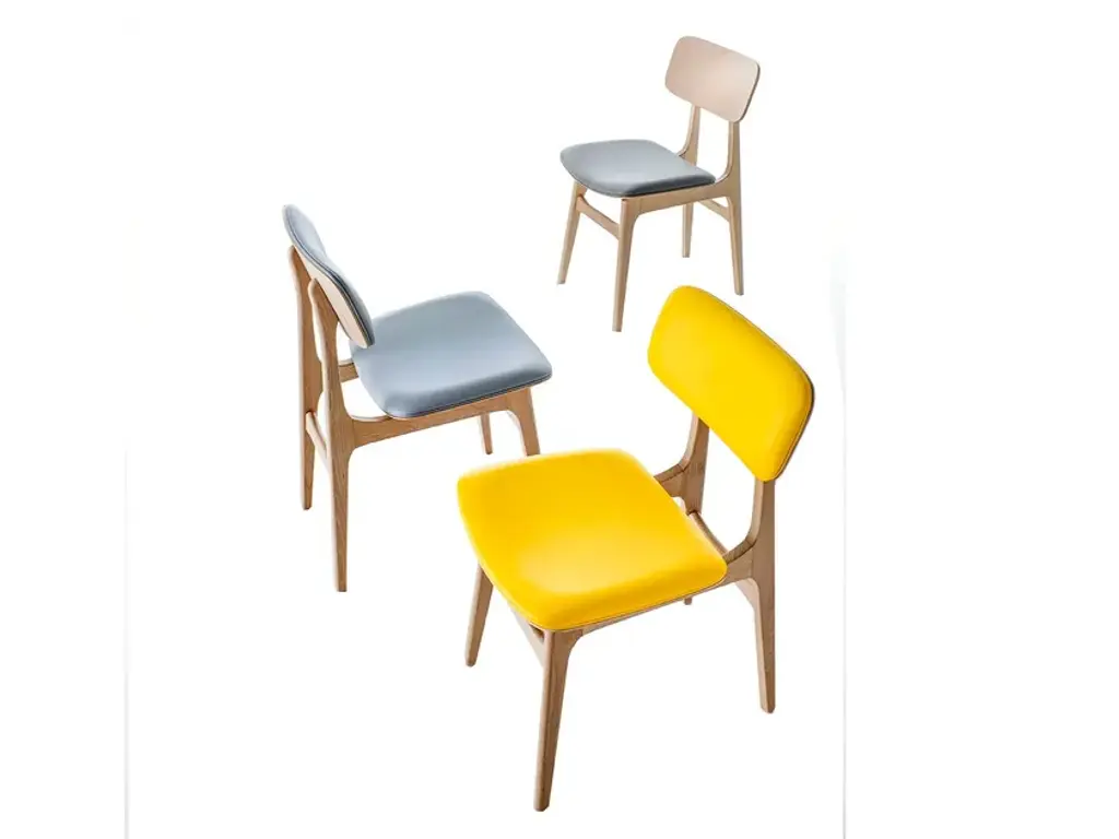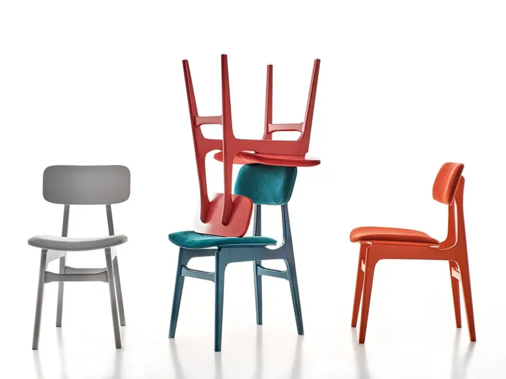 Dining chair with solid beech-wood frame with veneered plywoodseat and backrest natural varnished or stained with upholstered seat.The reinterpretation of the 50s design together with a skilfull woodworking originates an unique value project. Declined in multiple variants it foresee many solutions of padding of backrest and seat according to different furnishing needs of the private or public room to which it is destined.