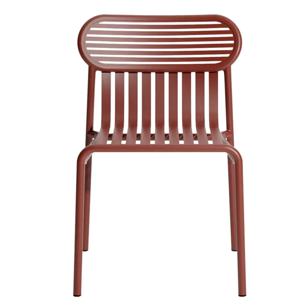 The Week-end chair is part of Petite Friture’s collection of aluminum outdoor furniture. The Week-end chair is characterized by oval shapes and both horizontal and vertical slats on the backrest. All the chairs of the Week-end range are stackable. This clean-lined dining chair, specifically crafted for outdoor use, pairs seamlessly with the tables from the same series. Created by the design duo BrichetZiegler, Petite Friture’s Week-end outdoor furniture combines different geometrical shapes with functional, contemporary design. The aluminum structure makes the pieces lightweight and hardwearing at the same time, and the epoxy-coated matt surface can easily stand any weather. The Week-end range consists of chairs, benches and tables in many colors and sizes, and is thus suitable for large gardens and small balconies alike. Thanks to the sleek design, the pieces can also be used indoors.