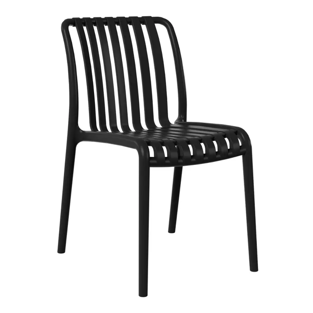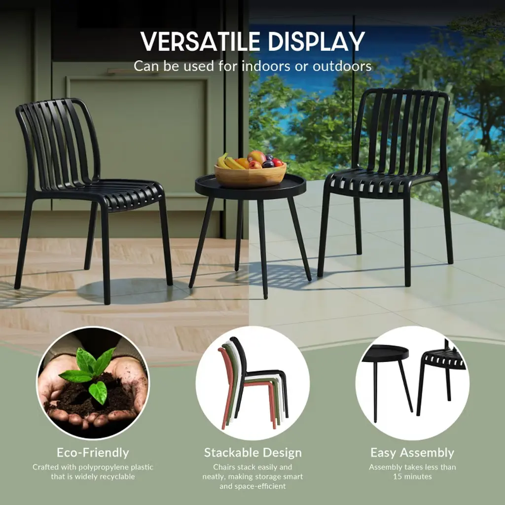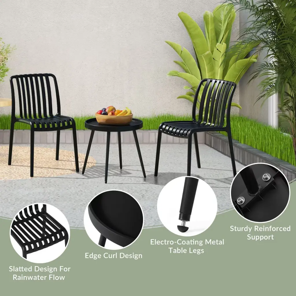 Elevate your patio with this contemporary 3-piece dining set, designed for both form and function. The 18.5" round side table features a sleek polypropylene top and is grounded by an iron frame with durable, rust-resistant e-coating to ensure added protection against the outdoors. Adjustable leveling feet on the table ensure stability on any surface, while its raised edges help contain spills and prevent water from dripping onto your floors or carpet for easier cleanup. Complementing the table are two stackable patio chairs crafted from UV- and fade-resistant polypropylene resin. Their slatted design promotes airflow, keeping you comfortable on warm days, and allows water to drain, preventing puddling on the seat. Rubber foot pads on the chairs protect your floors while adding stability. The clean lines and vibrant hues of this set bring a touch of modern sophistication to your outdoor space, making this the perfect balcony furniture set for apartments.While we strive to accurately represent product colors, please be aware that actual colors may vary slightly due to individual screen settings and lighting conditions. FeaturesSet Includes: Two (2) Plastic Resin Patio Side Chairs and One (1) 18.5" Round Patio Side TableDurable Construction: Table With A Strong Iron Frame And Polypropylene Resin Top; Chairs Crafted From Long-Lasting Polypropylene (PP).E-Coating Finish Provides Rust and Fade Resistance To The Iron Frame, Ensuring Longevity and Weather Resistance In Outdoor ConditionsStackable Patio Dining Chairs To Help Maximize Storage SpaceSide Table Equipped With Adjustable Leveling Feet Enhancing Stability On Uneven Surfaces, Helps Reduce WobblingEffortless Setup: Chairs Arrive Fully Assembled, Table Requires Simple Leg Assembly For Quick AssemblyWater Easily Drains Through The Slatted Design, Keeping The Chair Dry By Preventing PuddlingDetails:Product Type: Patio Conversation SetsWhat's Included: (2) Dining Chair; (1) Side TableDining ChairDimensions: 20" W x 23.5" D x 31.5" HWeight: 10.6 lbs.Weight Capacity: 260 lbs.Table Top Width: 19.5"Table Top Depth: 19.5"Table Top Thickness: 1.5"Seat Width: 16"Seat Depth: 17"Side TableDimensions: 21.75" W x 21.75" D x 18.75" HWeight: 7.3 lbs.Table Top Width: 19.5"Table Top Depth: 19.5"Table Top Thickness: 1.5"Weight Capacity: 100 lbs.