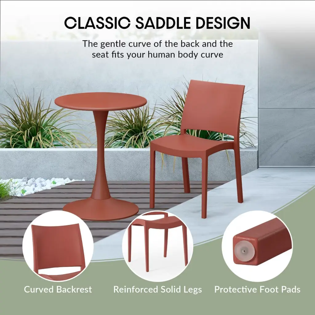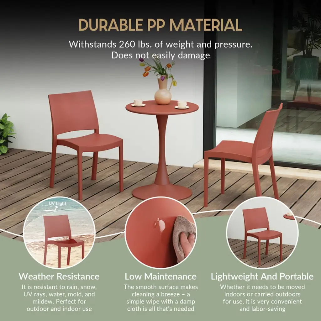 Create an intimate outdoor dining moment with our stackable resin dining chairs. Their streamlined silhouette, crafted from all-weather polypropylene, brings a modern touch to your balcony or patio. These lightweight chairs offer both enduring style and effortless mobility. The contoured seat and backrest offer plenty of comfort to your pressure points, ideal for sun-drenched gatherings while remaining comfortable. And when not in use, they stack neatly, ensuring your space remains uncluttered and chic.While we strive to accurately represent product colors, please be aware that actual colors may vary slightly due to individual screen settings and lighting conditions. FeaturesConstructed with Durable Polypropylene (PP) Material and Designed for Sturdiness and StabilityAll-Weather Resistant Material Made to Last the Harsh OutdoorsUV-Resistant to Maintain its Vibrant Color Year-RoundCurved Backrest and Contoured Seat for Upper and Lower Body Support and Comfort with Splayed Legs for Better Stability and DurabilityModern Design with Open Back to That Allows for Fresh Air to Flow Through and Keep You Cool During Warmer DaysNo Assembly Required, Simply Unpack and Enjoy. Stackable for Easy StorageProtective Rubber Foot Pads Help Protect Your Floor From Damage, Increase Stability, and Improve Floor ContactDetails:Product Type: Patio Dining ChairsWhat's Included: (2) Dining ChairDining ChairDimensions: 17.25" W x 21.5" D x 31.5" HWeight: 10.35 lbs.Seat Width: 16.75"Seat Depth: 17"Seat Height: 17.75"Weight Capacity: 260 lbs.
