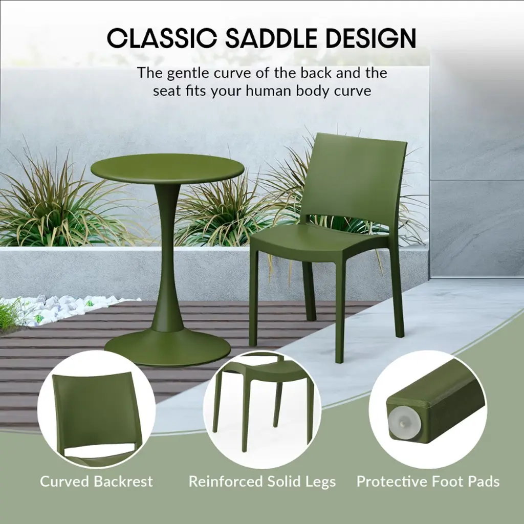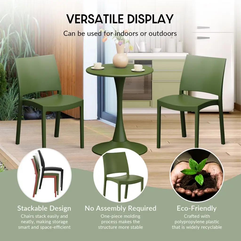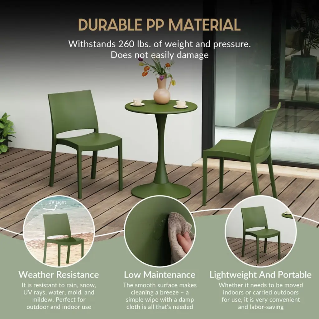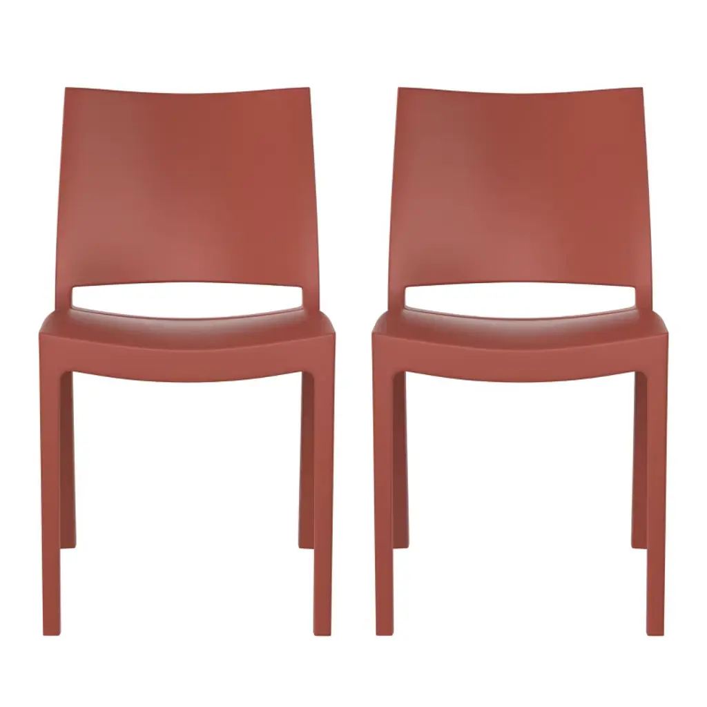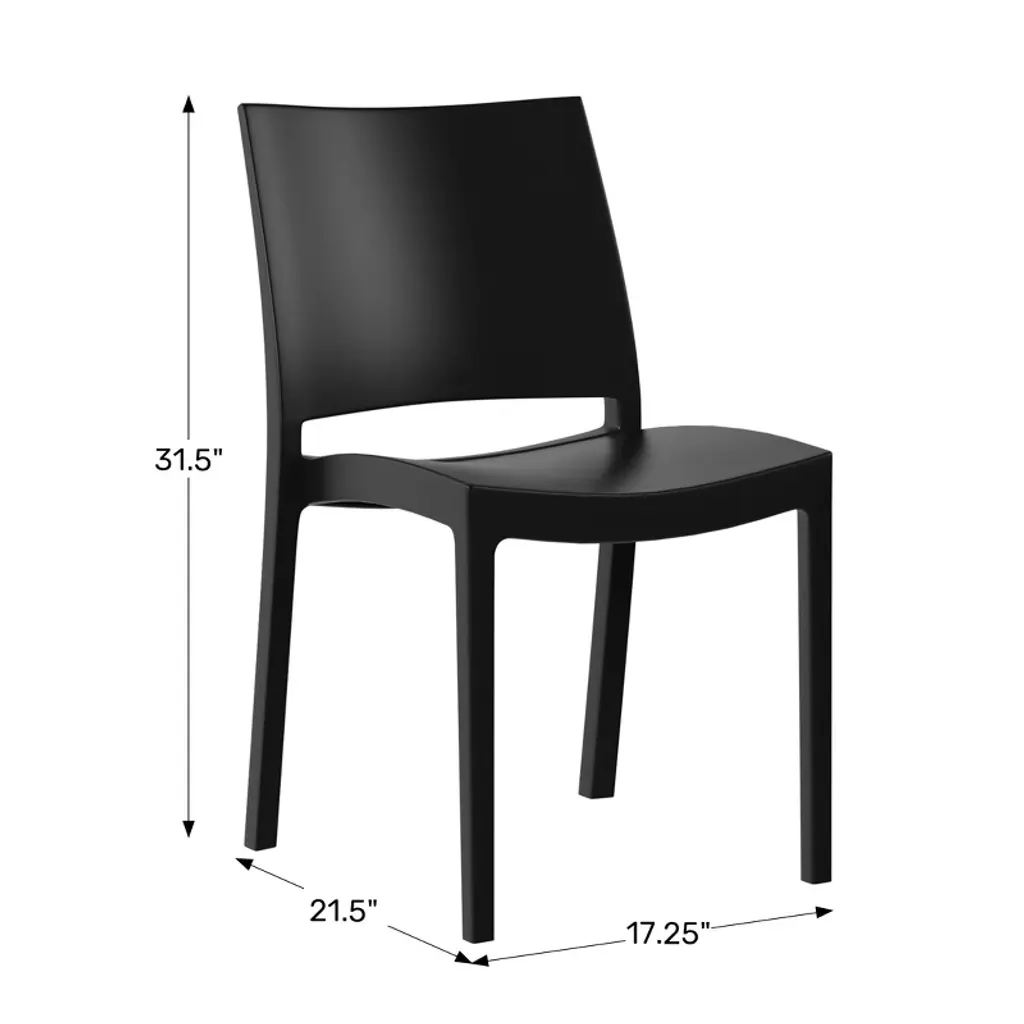 Create an intimate outdoor dining moment with our stackable resin dining chairs. Their streamlined silhouette, crafted from all-weather polypropylene, brings a modern touch to your balcony or patio. These lightweight chairs offer both enduring style and effortless mobility. The contoured seat and backrest offer plenty of comfort to your pressure points, ideal for sun-drenched gatherings while remaining comfortable. And when not in use, they stack neatly, ensuring your space remains uncluttered and chic.While we strive to accurately represent product colors, please be aware that actual colors may vary slightly due to individual screen settings and lighting conditions. FeaturesConstructed with Durable Polypropylene (PP) Material and Designed for Sturdiness and StabilityAll-Weather Resistant Material Made to Last the Harsh OutdoorsUV-Resistant to Maintain its Vibrant Color Year-RoundCurved Backrest and Contoured Seat for Upper and Lower Body Support and Comfort with Splayed Legs for Better Stability and DurabilityModern Design with Open Back to That Allows for Fresh Air to Flow Through and Keep You Cool During Warmer DaysNo Assembly Required, Simply Unpack and Enjoy. Stackable for Easy StorageProtective Rubber Foot Pads Help Protect Your Floor From Damage, Increase Stability, and Improve Floor ContactDetails:Product Type: Patio Dining ChairsWhat's Included: (2) Dining ChairDining ChairDimensions: 17.25" W x 21.5" D x 31.5" HWeight: 10.35 lbs.Seat Width: 16.75"Seat Depth: 17"Seat Height: 17.75"Weight Capacity: 260 lbs.