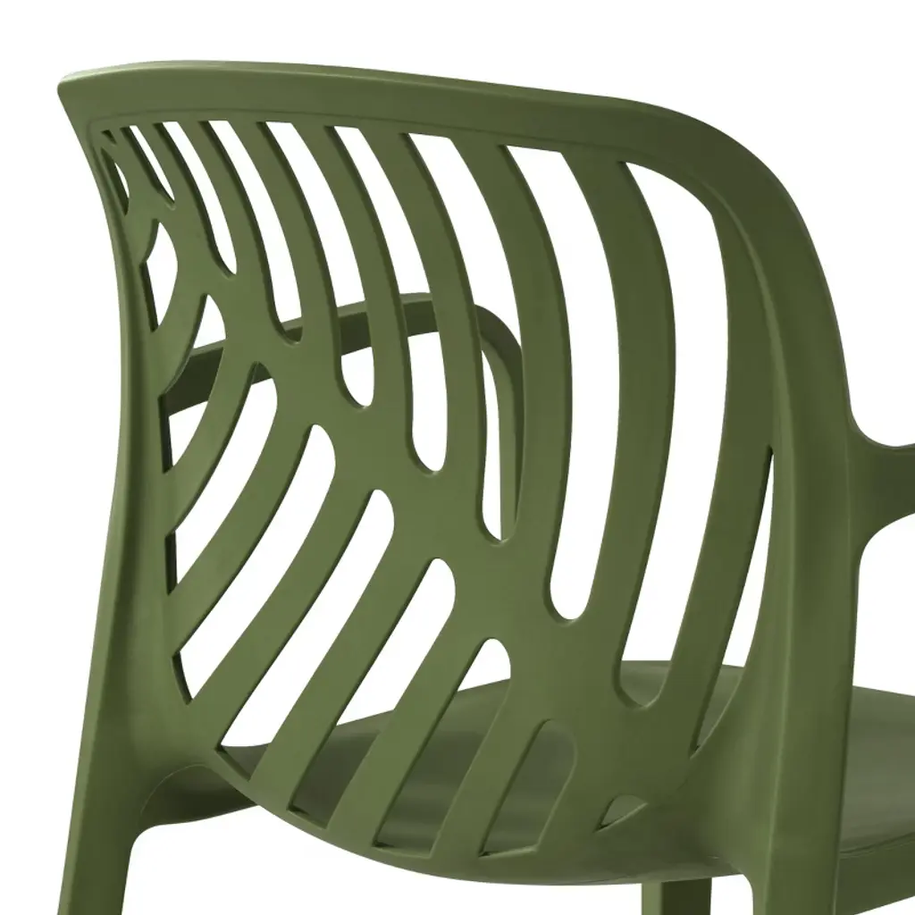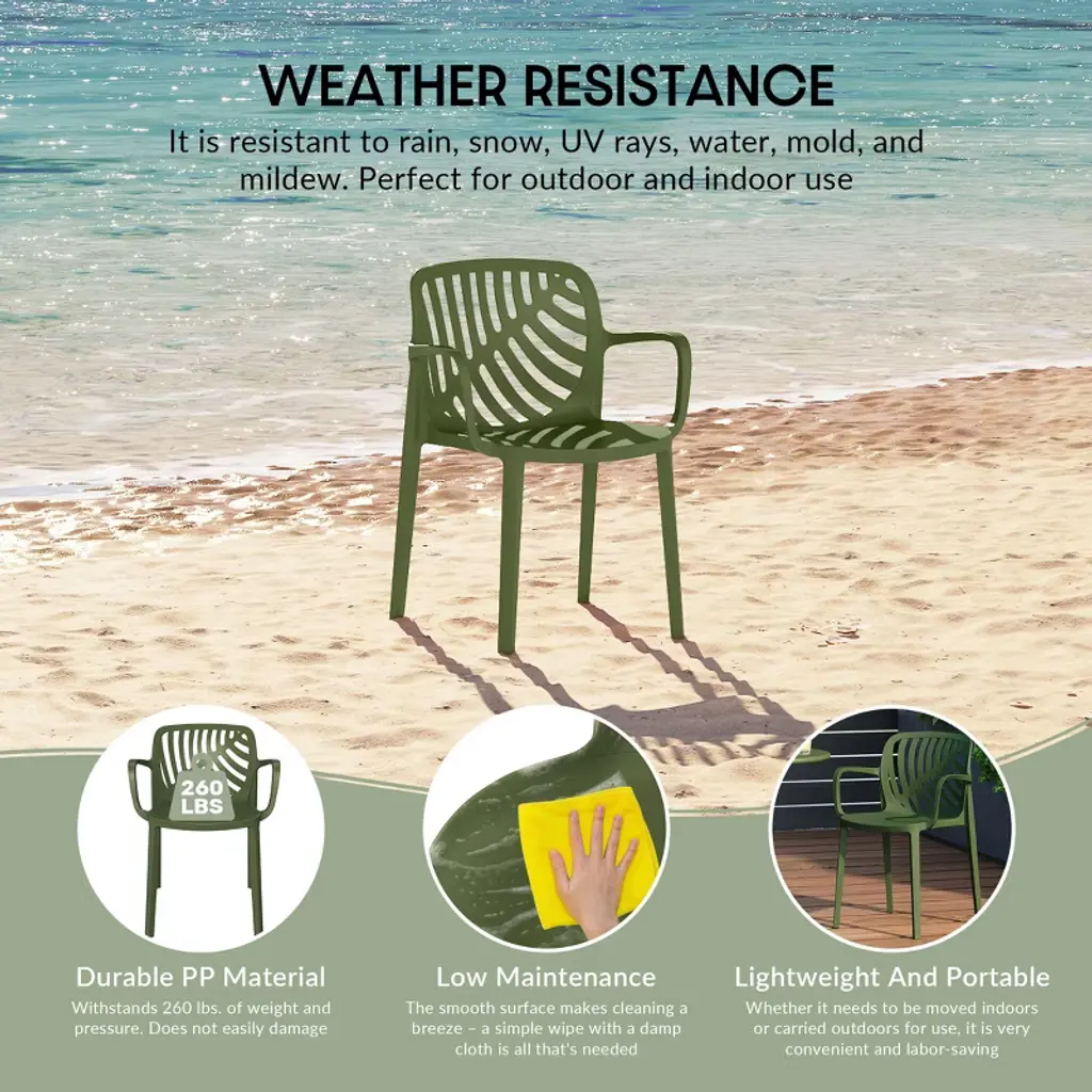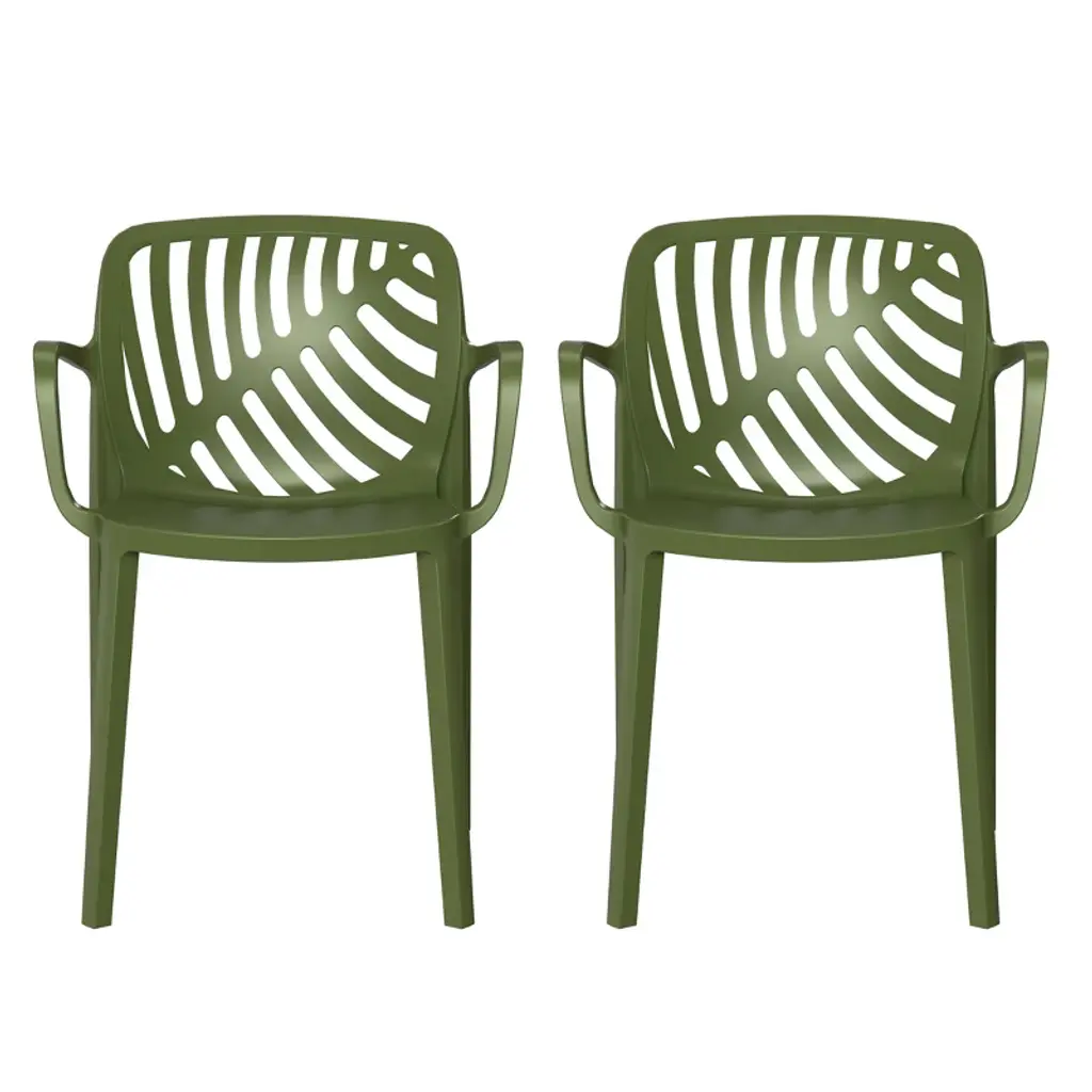 Gather with friends or family for a quick brunch on your balcony with our outdoor stackable resin dining arm chairs. Crafted from durable, all-weather PP resin, prepared to withstand the elements while retaining their vibrant color year-round thanks to their UV and fade-resistant properties. Lightweight and simple to move, they are perfect for creating a flexible dining area on even the smallest balconies or patios. Designed with comfort in mind, featuring smooth armrest and a ventilated backrest to keep you cool on warm summer evenings. And when not in use, they stack neatly for easy storage.While we strive to accurately represent product colors, please be aware that actual colors may vary slightly due to individual screen settings and lighting conditions. FeaturesConstructed with Durable Polypropylene (PP) Material and Designed for Sturdiness and StabilityAll-Weather Resistant Material Made to Last the Harsh OutdoorsUV and Fade Resistant to Maintain its Vibrant Color Year-RoundCurved Backrest for Upper Body Support and Comfort with Rounded and Smooth ArmrestModern, Ventilated Backrest for Enhanced Airflow and Cooling Comfort with Charming Palm Leaf DesignNo Assembly Required, Simply Unpack and Enjoy. Stackable for Easy StorageProtective Rubber Foot Pads Help Protect Your Floor From Damage, Increase Stability, and Improve Floor ContactDetails:Product Type: Patio Dining ChairsWhat's Included: (2) Dining ChairDining ChairDimensions: 21.5" W x 21" D x 31.25" HWeight: 9.5 lbs.Seat Width: 16.25"Seat Depth: 17.25"Seat Height: 17.75"Weight Capacity: 260 lbs.