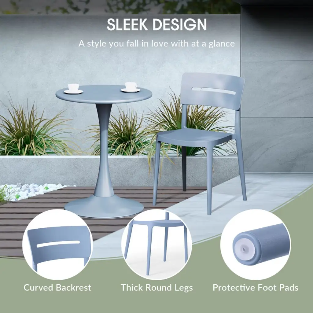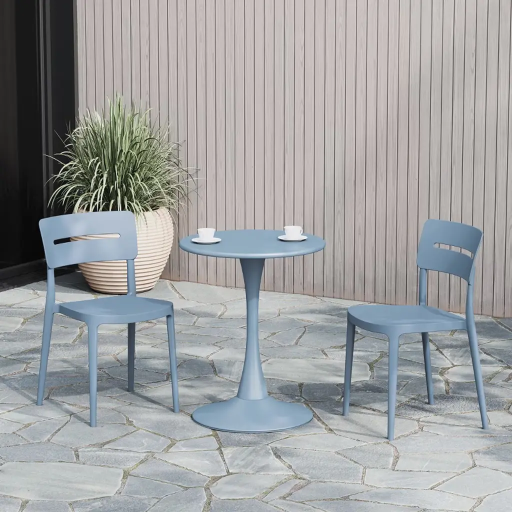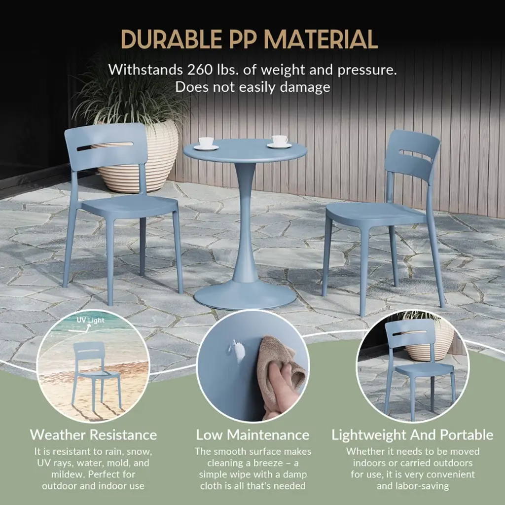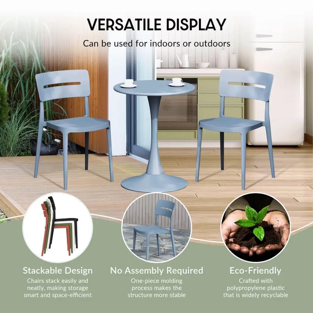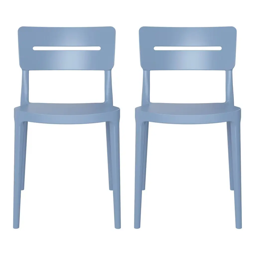 Gather with friends or family for a quick brunch on your balcony with our outdoor stackable resin dining chairs. Crafted from durable, all-weather PP resin, prepared to withstand the elements while retaining their vibrant color year-round thanks to their UV and fade-resistant properties. Lightweight and simple to move, they are perfect for creating a flexible dining area on even the smallest balconies or patios. Designed with comfort in mind, featuring a ventilated backrest to keep you cool on warm summer evenings. And when not in use, they stack neatly for easy storage.While we strive to accurately represent product colors, please be aware that actual colors may vary slightly due to individual screen settings and lighting conditions. FeaturesConstructed with Durable Polypropylene (PP) Material and Designed for Sturdiness and StabilityAll-Weather Resistant Material Made to Last the Harsh OutdoorsUV and Fade Resistant to Maintain its Vibrant Color Year-RoundContoured Backrest to Provide Better Support and ComfortModern, Open Backrest for Enhanced Airflow and Cooling ComfortNo Assembly Required, Simply Unpack and Enjoy. Stackable for Easy StorageProtective Rubber Foot Pads Help Protect Your Floor From Damage, Increase Stability, and Improve Floor ContactDetails:Product Type: Patio Dining ChairsWhat's Included: (2) Dining ChairDining ChairDimensions: 17.75" W x 19.75" D x 31.5" HWeight: 8.25 lbs.Seat Width: 16.5"Seat Depth: 17"Seat Height: 16"Weight Capacity: 260 lbs.