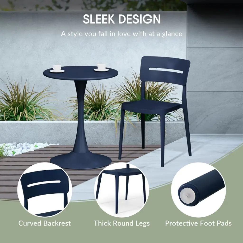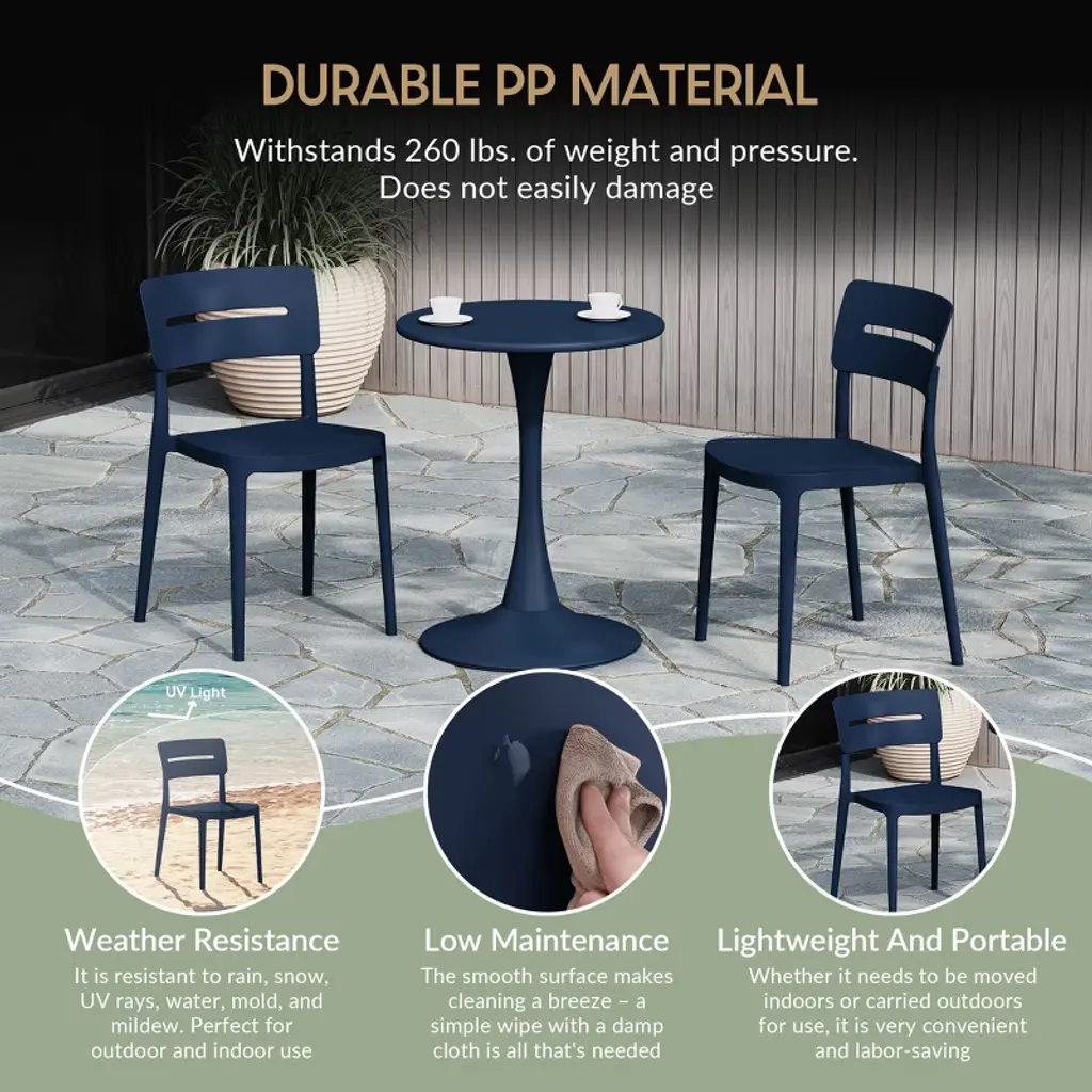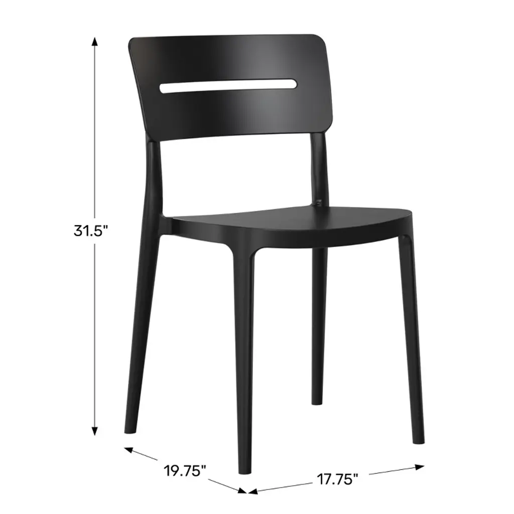 Gather with friends or family for a quick brunch on your balcony with our outdoor stackable resin dining chairs. Crafted from durable, all-weather PP resin, prepared to withstand the elements while retaining their vibrant color year-round thanks to their UV and fade-resistant properties. Lightweight and simple to move, they are perfect for creating a flexible dining area on even the smallest balconies or patios. Designed with comfort in mind, featuring a ventilated backrest to keep you cool on warm summer evenings. And when not in use, they stack neatly for easy storage.While we strive to accurately represent product colors, please be aware that actual colors may vary slightly due to individual screen settings and lighting conditions. FeaturesConstructed with Durable Polypropylene (PP) Material and Designed for Sturdiness and StabilityAll-Weather Resistant Material Made to Last the Harsh OutdoorsUV and Fade Resistant to Maintain its Vibrant Color Year-RoundContoured Backrest to Provide Better Support and ComfortModern, Open Backrest for Enhanced Airflow and Cooling ComfortNo Assembly Required, Simply Unpack and Enjoy. Stackable for Easy StorageProtective Rubber Foot Pads Help Protect Your Floor From Damage, Increase Stability, and Improve Floor ContactDetails:Product Type: Patio Dining ChairsWhat's Included: (2) Dining ChairDining ChairDimensions: 17.75" W x 19.75" D x 31.5" HWeight: 8.25 lbs.Seat Width: 16.5"Seat Depth: 17"Seat Height: 16"Weight Capacity: 260 lbs.