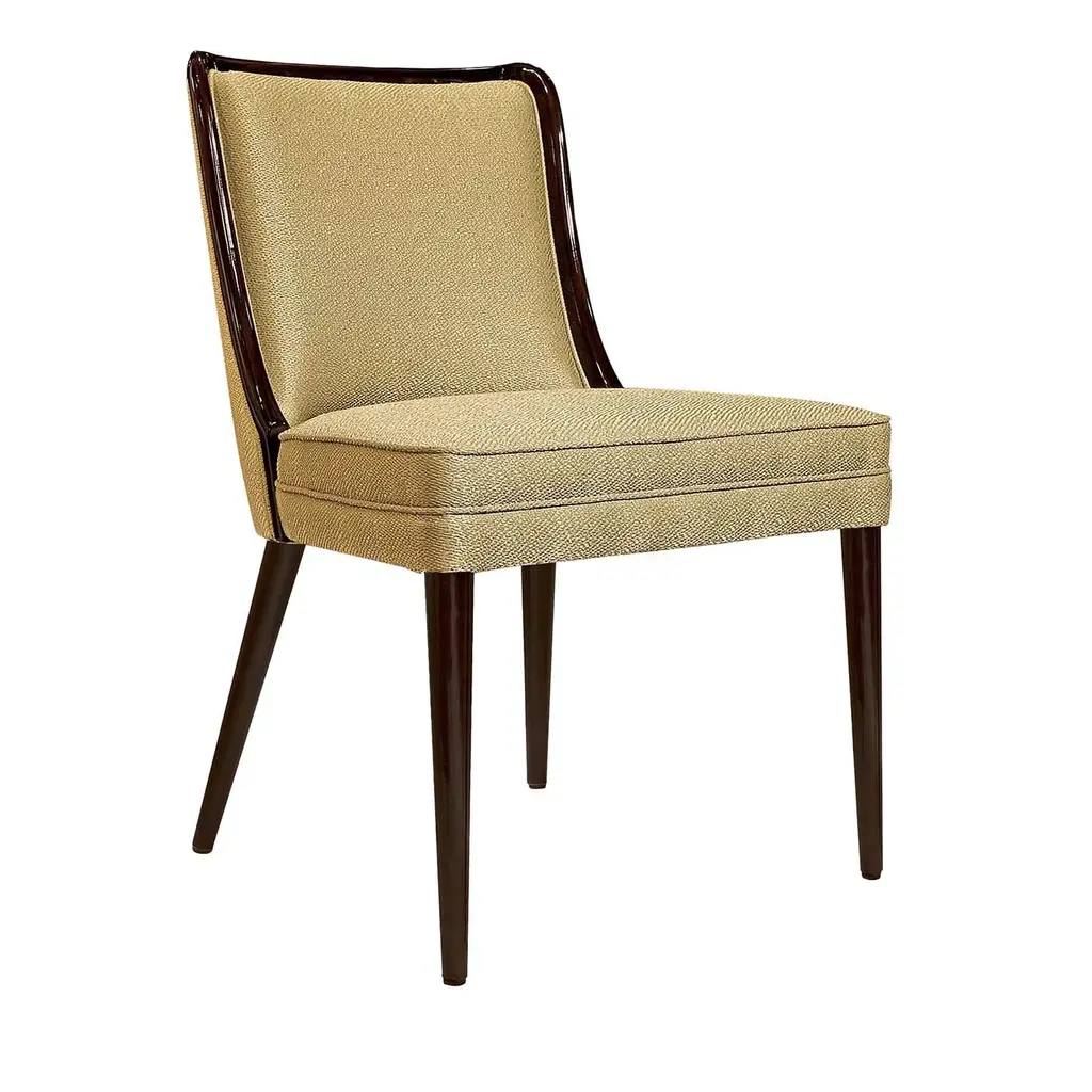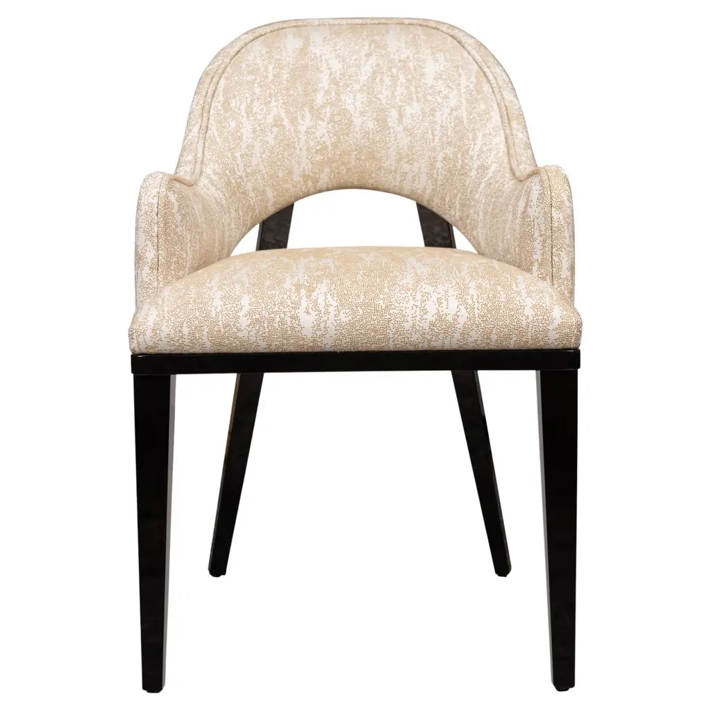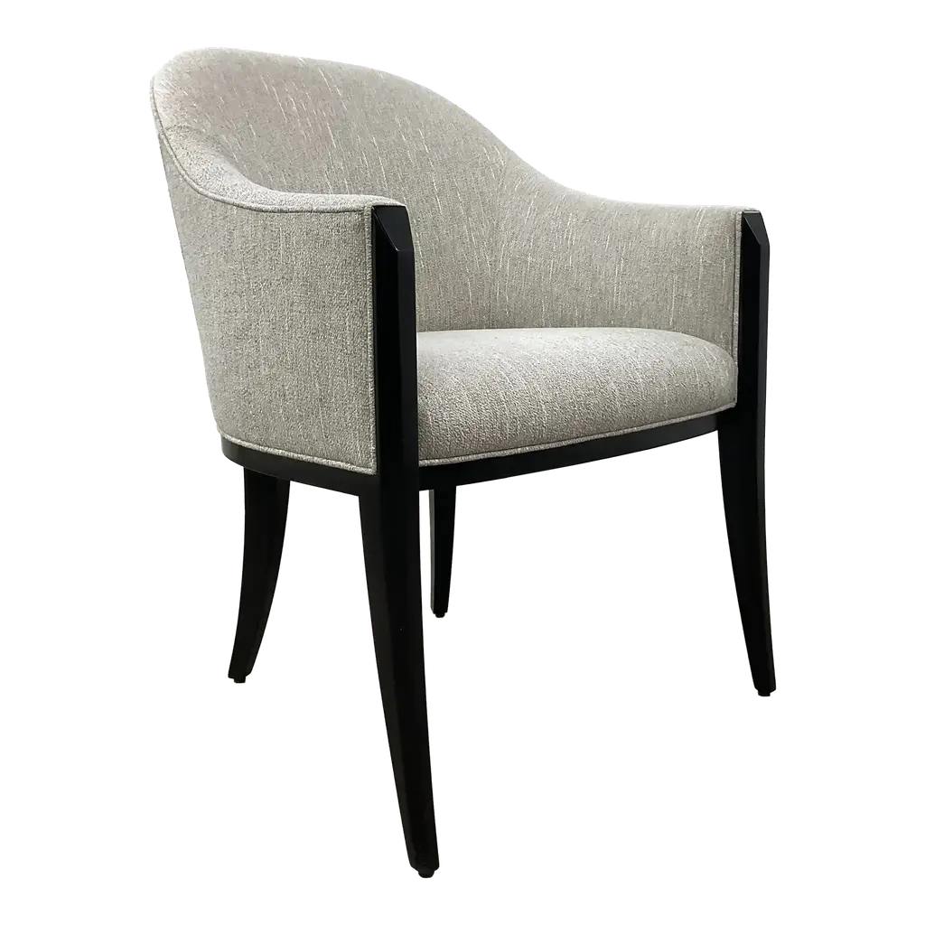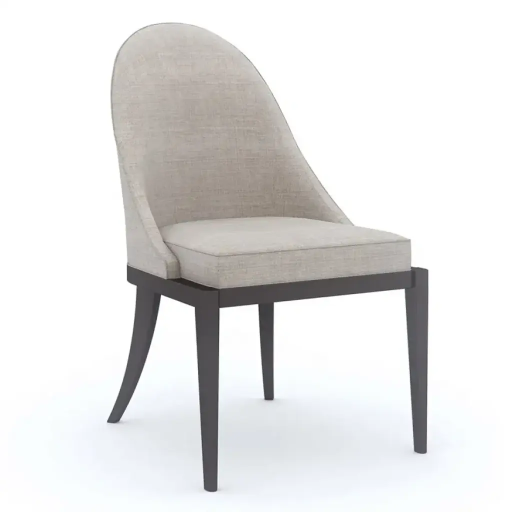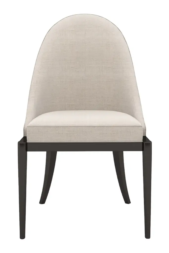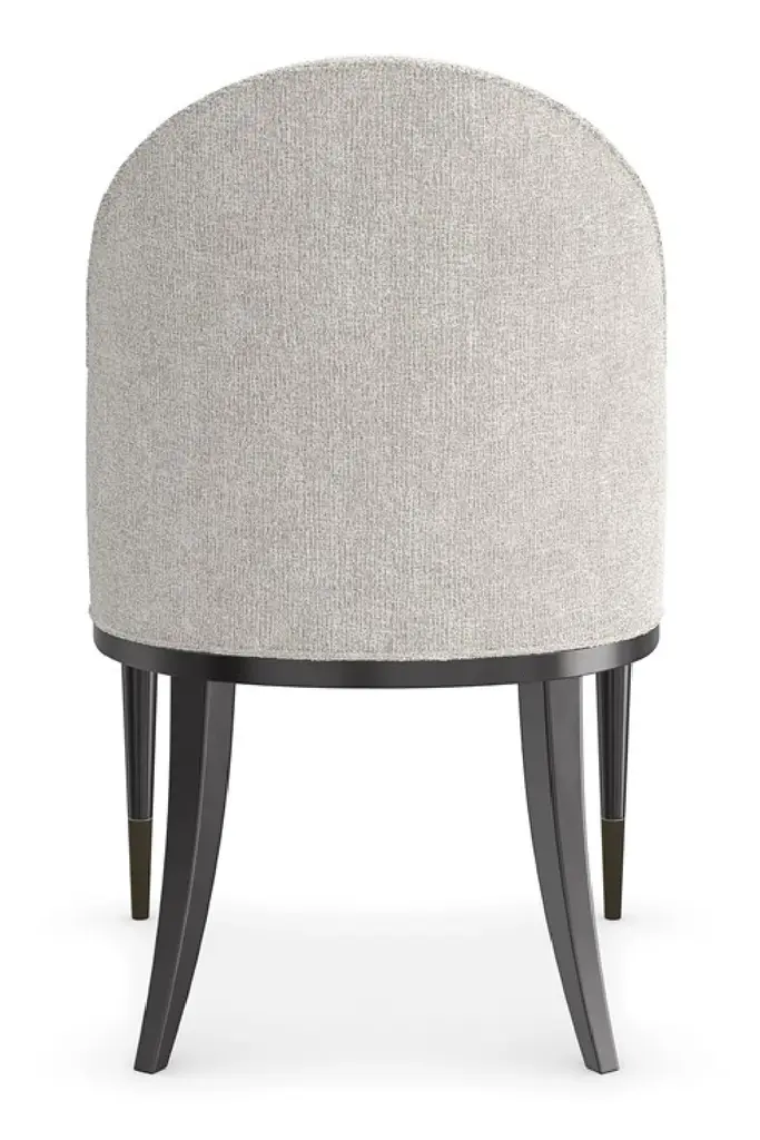 With a shapely silhouette inspired by the scalloped edge of a billowing cloud, this dining chair invites comfort and a sensory experience. Beautifully tailored in a softly textured chenille melange fabric, it's Almost Black frame lends classic contrast. Brushed Gold front metal ferrules add a sophisticated finishing touch. With a shapely silhouette inspired by the scalloped edge of a billowing cloud, this dining chair invites comfort and a sensory experience. Beautifully tailored in a softly textured chenille melange fabric, it's Almost Black frame lends classic contrast. Brushed Gold front metal ferrules add a sophisticated finishing touch.