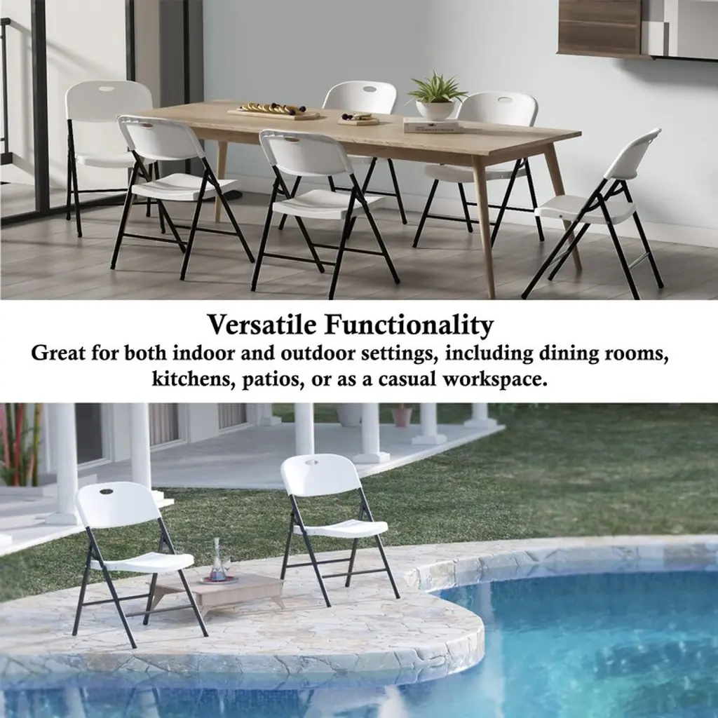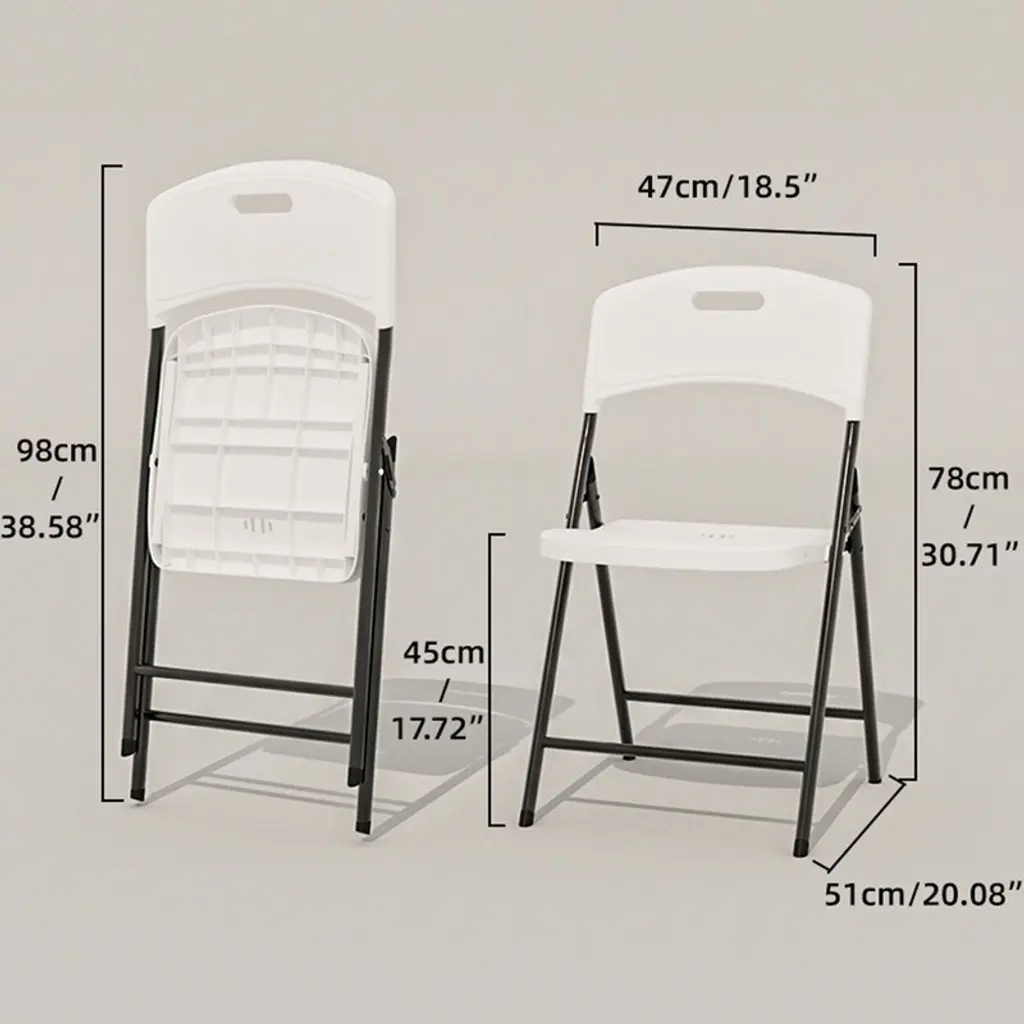 Simplify your seating solutions with the White Folding Chairs 4 Pack—a blend of practicality and comfort for any occasion! Crafted with durable PP injection molding, these lightweight yet sturdy chairs are perfect for indoor gatherings, outdoor parties, dining setups, or event venues. Effortlessly foldable and ready to use in seconds, they’re your ultimate space-saving companion for hosting hassle-free!Features:● 4-Pack Convenience: Includes four foldable chairs—ideal for parties, picnics, weddings, or everyday use.● Premium Durability: High-quality PP injection construction ensures long-lasting strength and resistance to wear.● Comfortable Design: Smooth, contoured seating surface provides ergonomic support for extended use.● Quick Storage: Fold flat in seconds to save space—perfect for closets, car trunks, or tight storage areas.● Versatile Utility: Suitable for homes, cafes, event halls, camping trips, or temporary seating needs.● No Assembly Required: Fully pre-assembled—unfold and enjoy instantly!Specifications:● Color: White● Material: PP (Polypropylene)● Dimensions: 51 cm L x 47 cm W x 78 cm H (20" L x 18.5" W x 30.7" H)● Folded Size: Ultra-slim profile for compact storage.● Weight Capacity: Sturdy design supports everyday seating needs.● Country of Origin: ChinaWhether you’re hosting a backyard BBQ, organizing a banquet, or need extra seating for guests, these White Folding Chairs deliver reliability, comfort, and effortless convenience.