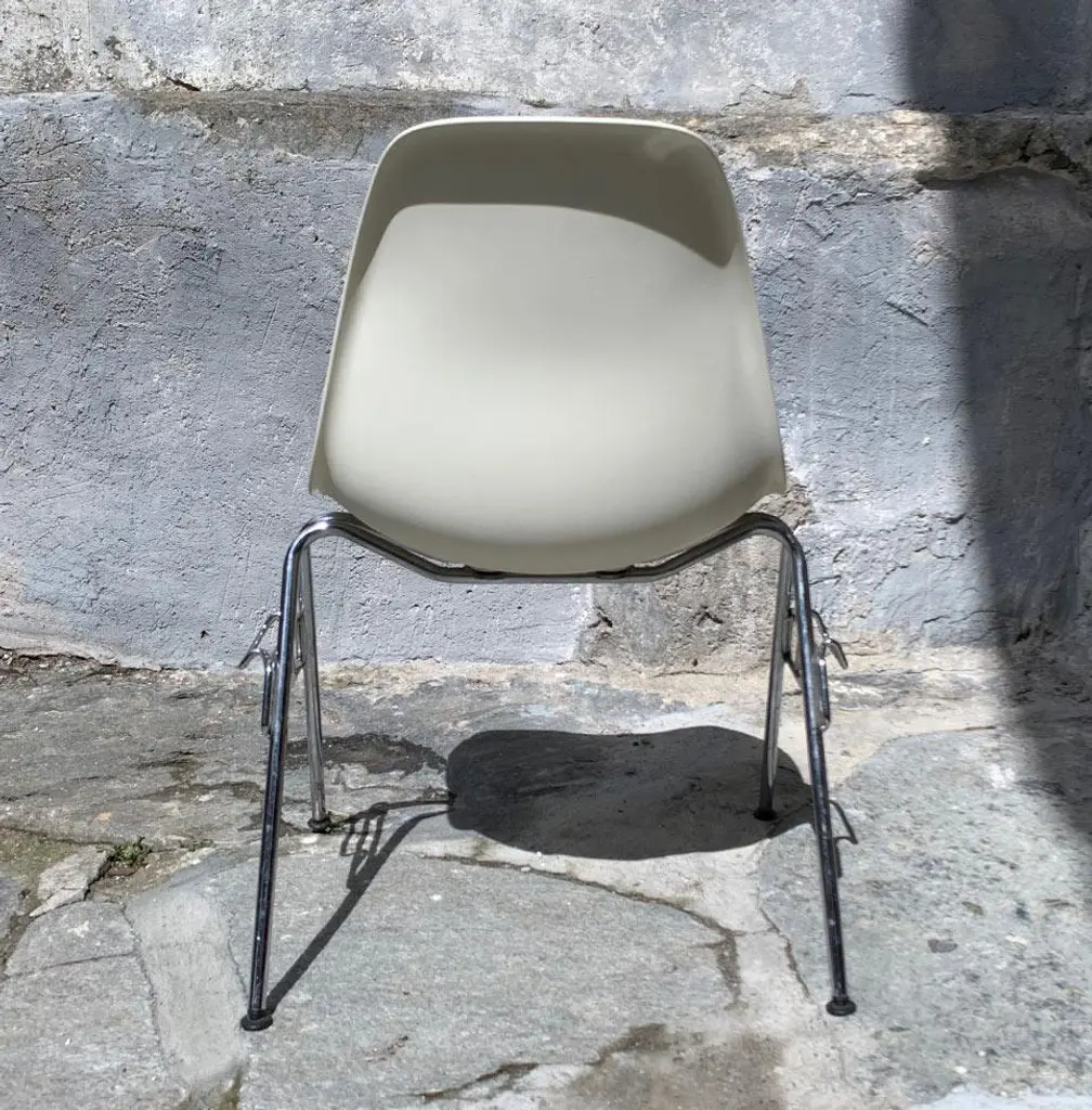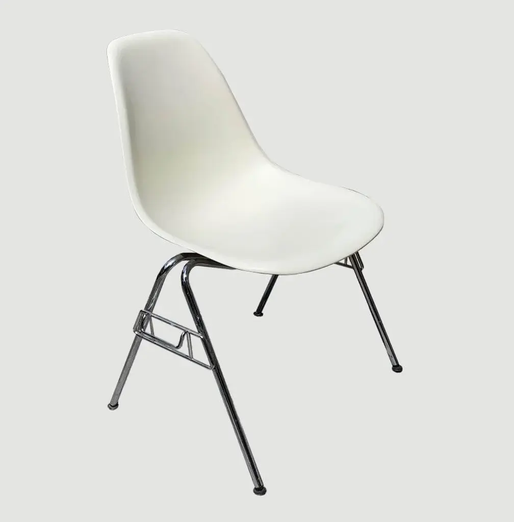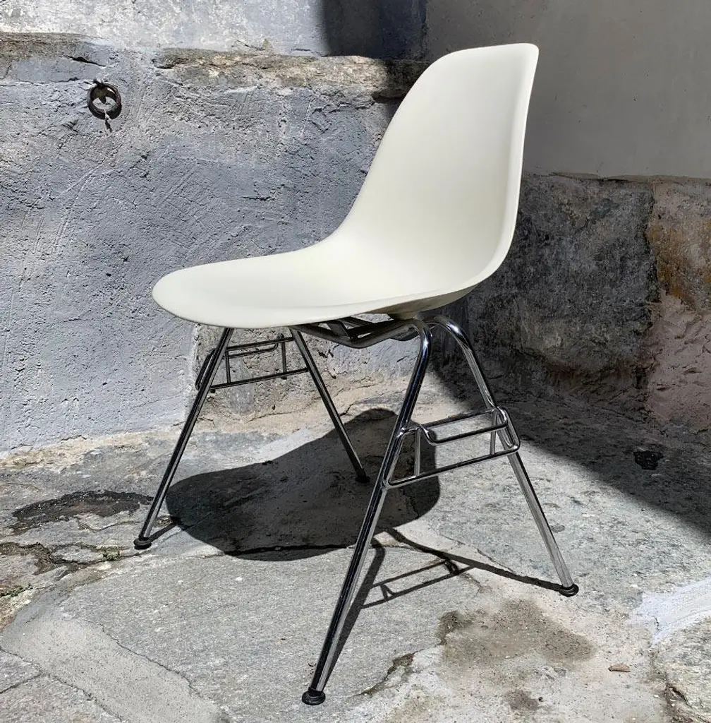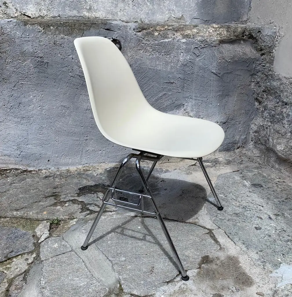 Two original Eames DSS chairs (Dining Height Side Chair Stacking Base). Dyed-through polypropylene seat shell in white. Tubular steel base. These chairs can be stacked or linked together with ganging brackets. Black hard floor feet. Classic Vitra quality. This piece has an attribution mark, I am sure that it is completely authentic and take full responsibility for any authenticity issues arising from misattribution