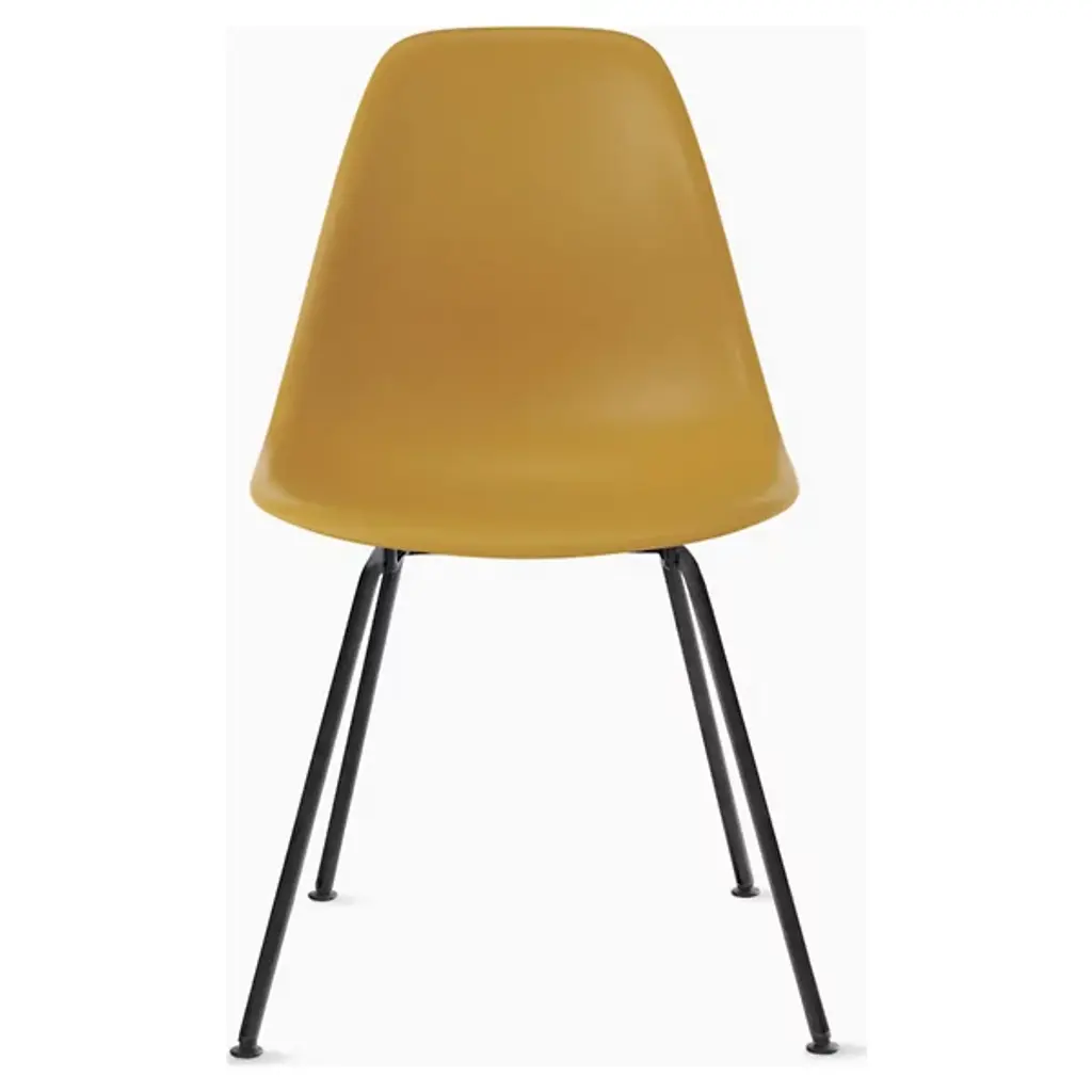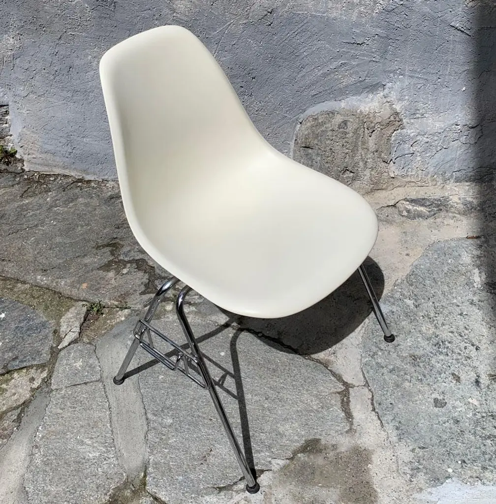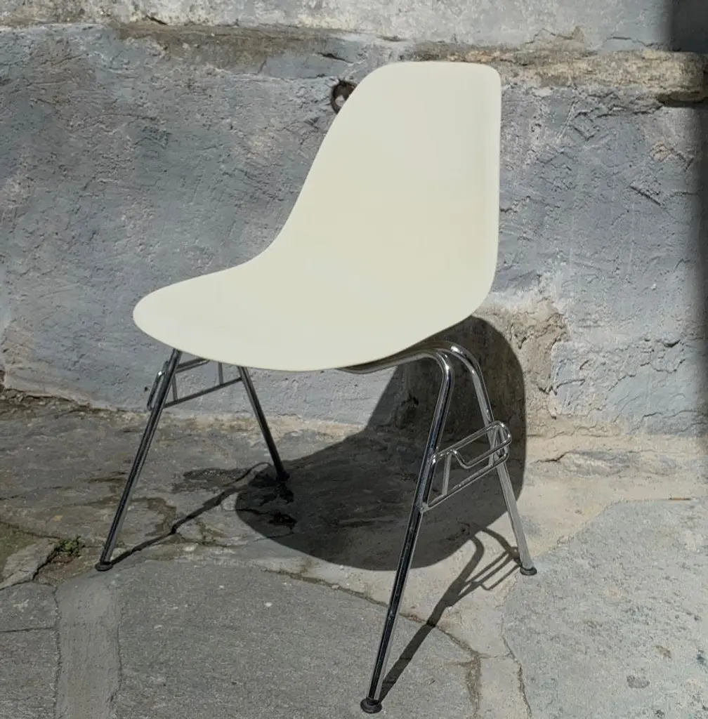 Two original Eames DSS chairs (Dining Height Side Chair Stacking Base). Dyed-through polypropylene seat shell in white. Tubular steel base. These chairs can be stacked or linked together with ganging brackets. Black hard floor feet. Classic Vitra quality. This piece has an attribution mark, I am sure that it is completely authentic and take full responsibility for any authenticity issues arising from misattribution