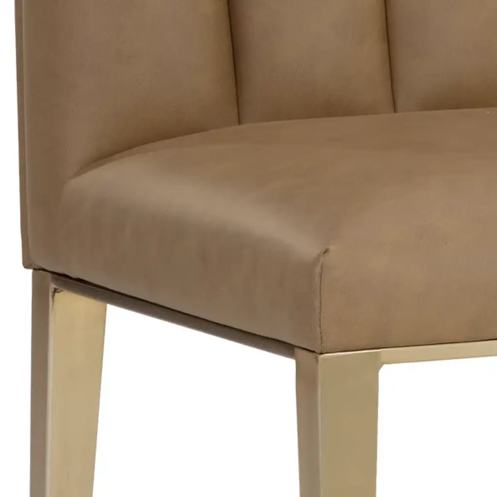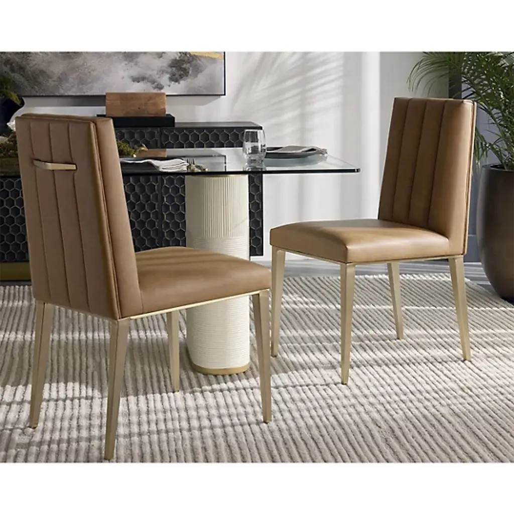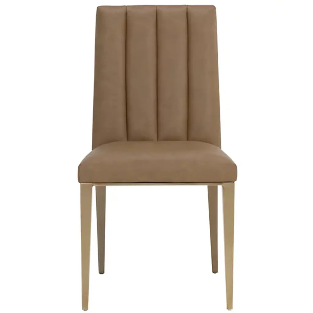 The Wilbur Dining Side Chair from Sunpan masterfully balances understated design with sophisticated details. Four tapering legs support a seat back with faux leather upholstery featuring elegant vertical channeling. The design develops a distinct character through carefully crafted variations, while The antique brass-finished steel frame and powder-coated integrated handle combine refined aesthetics with practical functionality. This glamorous, strong design brings an elevated touch of sophistication to any dining or gathering space.