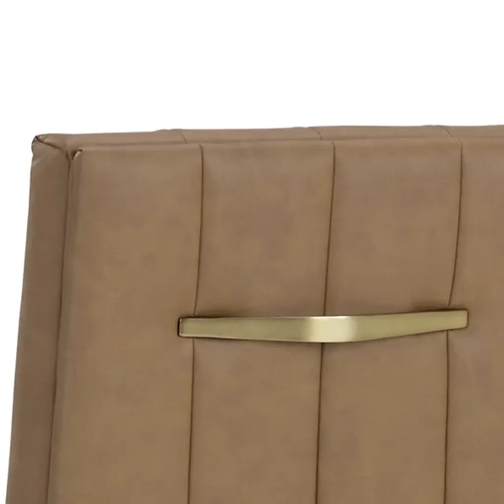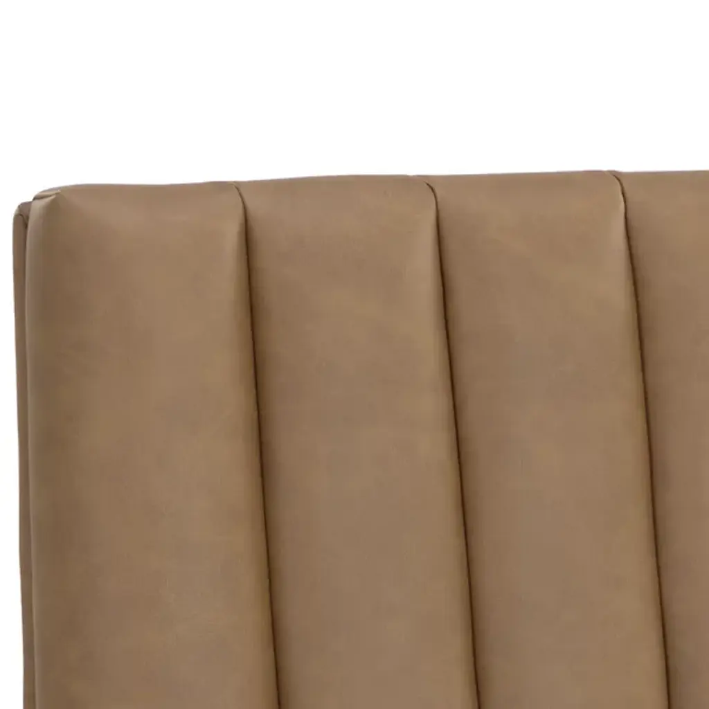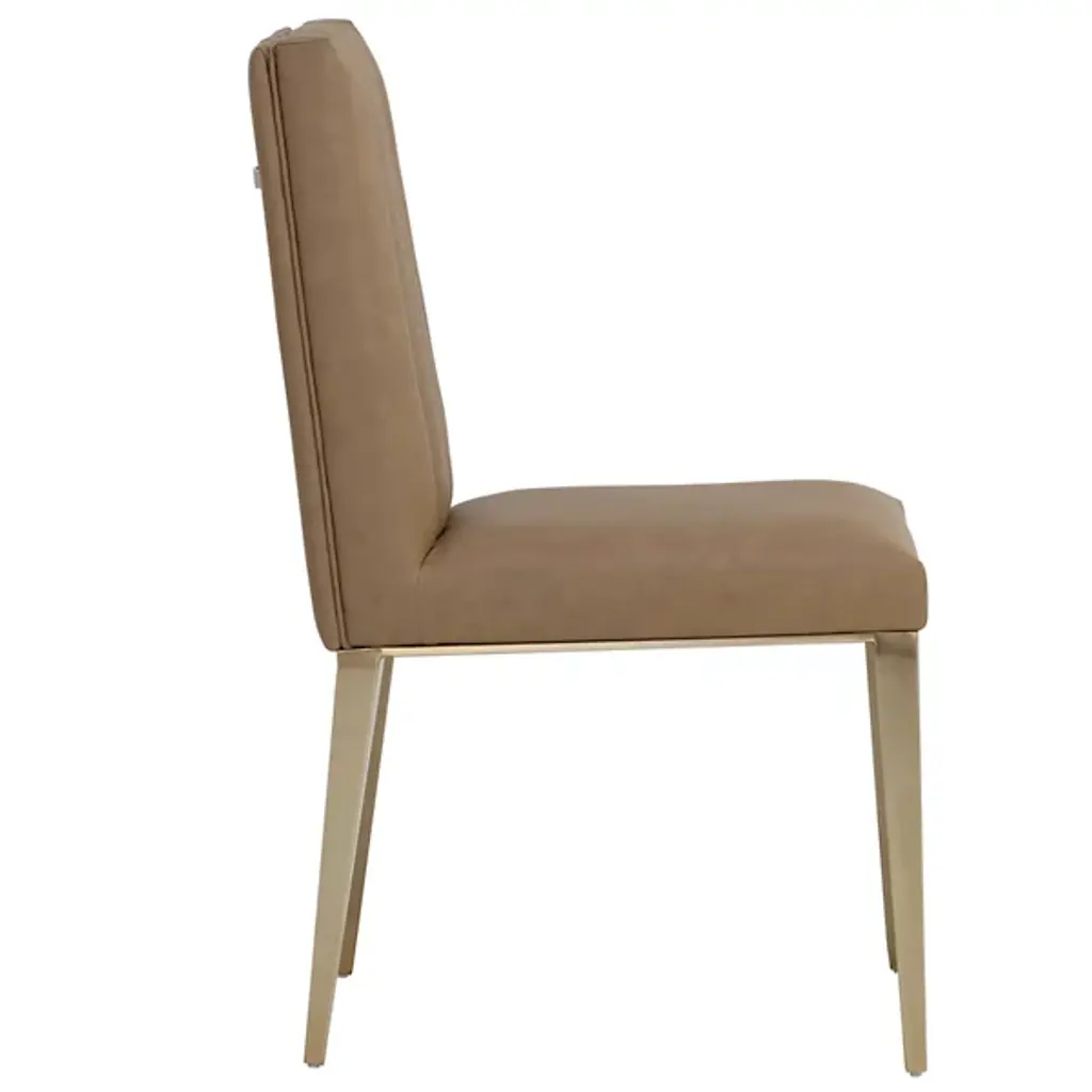 The Wilbur Dining Side Chair from Sunpan masterfully balances understated design with sophisticated details. Four tapering legs support a seat back with faux leather upholstery featuring elegant vertical channeling. The design develops a distinct character through carefully crafted variations, while The antique brass-finished steel frame and powder-coated integrated handle combine refined aesthetics with practical functionality. This glamorous, strong design brings an elevated touch of sophistication to any dining or gathering space.