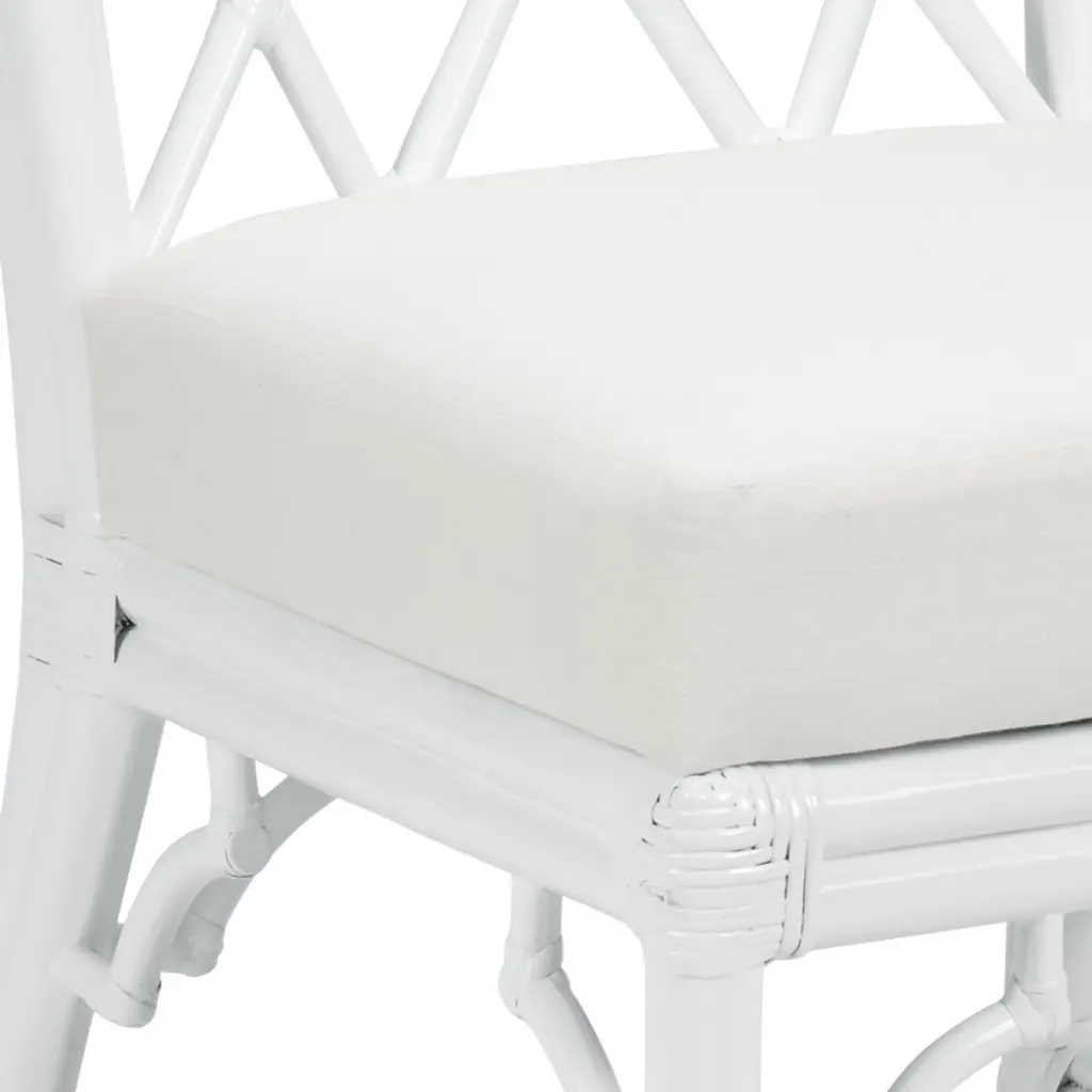 White Finish On Rattan Fretwork Side Chair With Attached Off White Fabric Cushion.