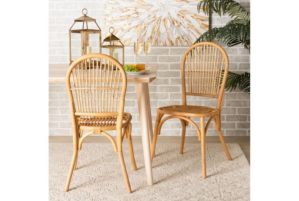 The Wina Modern Bohemian Natural Brown Rattan Dining Chair Set of 2 brings a touch of natural beauty to your dining room. These armless chairs are designed with a woven pattern, adding a modern bohemian flair to any space. Made from natural rattan, they are both durable and lightweight, making them easy to move and rearrange as needed.
