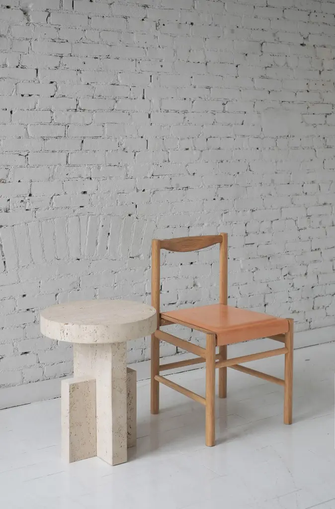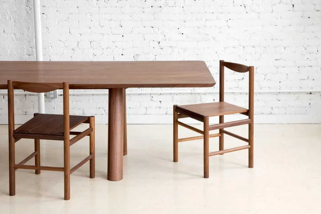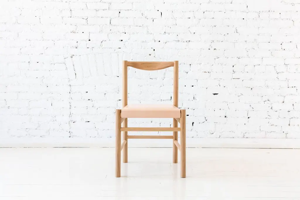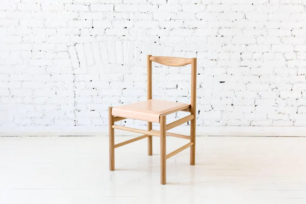 Shaker inspired wood side chair with comfortable contoured backrest. Option for a plain wooden seat pan or a seat pan with a low profile leather or shearling pad. This chair's simplicity makes it versatile to work perfectly in many different environments. Shown here:- Walnut chair with shearling seat- Walnut chair and black leather seat- Walnut chair and plain wooden seat pan- White oak chair and vegetable tanned leather seat