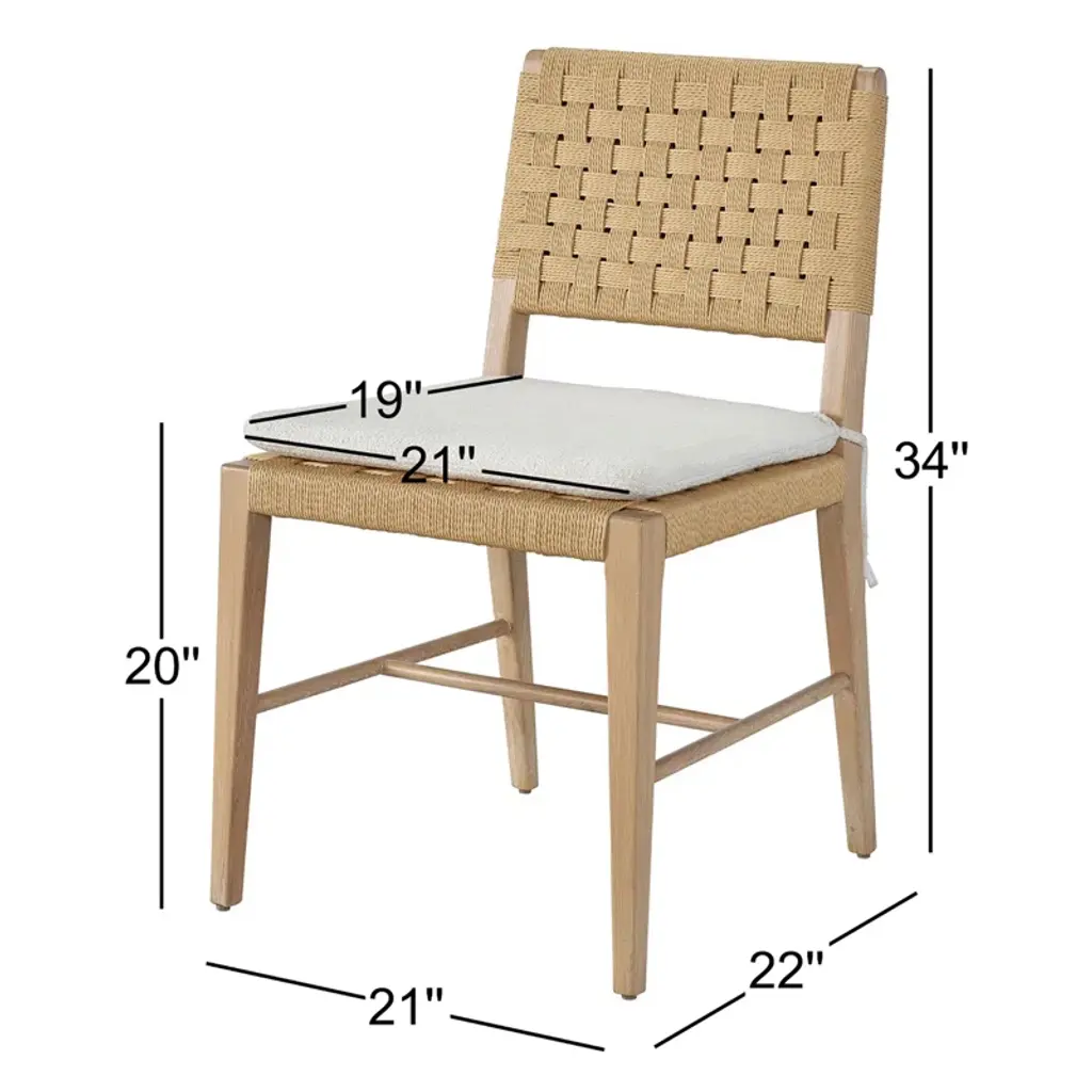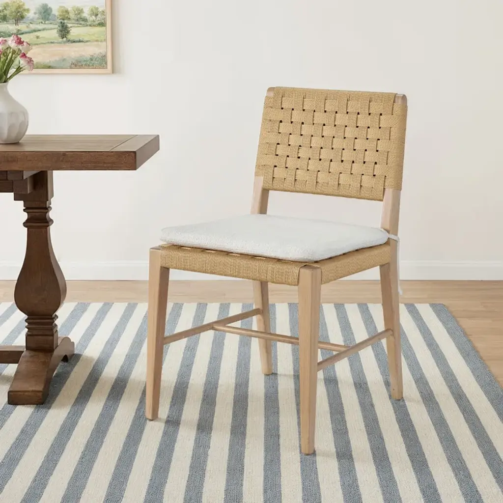 The lighthearted woven side chair fuses a woven Danish cord back, oak-finished legs, and a plush white seat cushion, making for a delightfully modern seat.