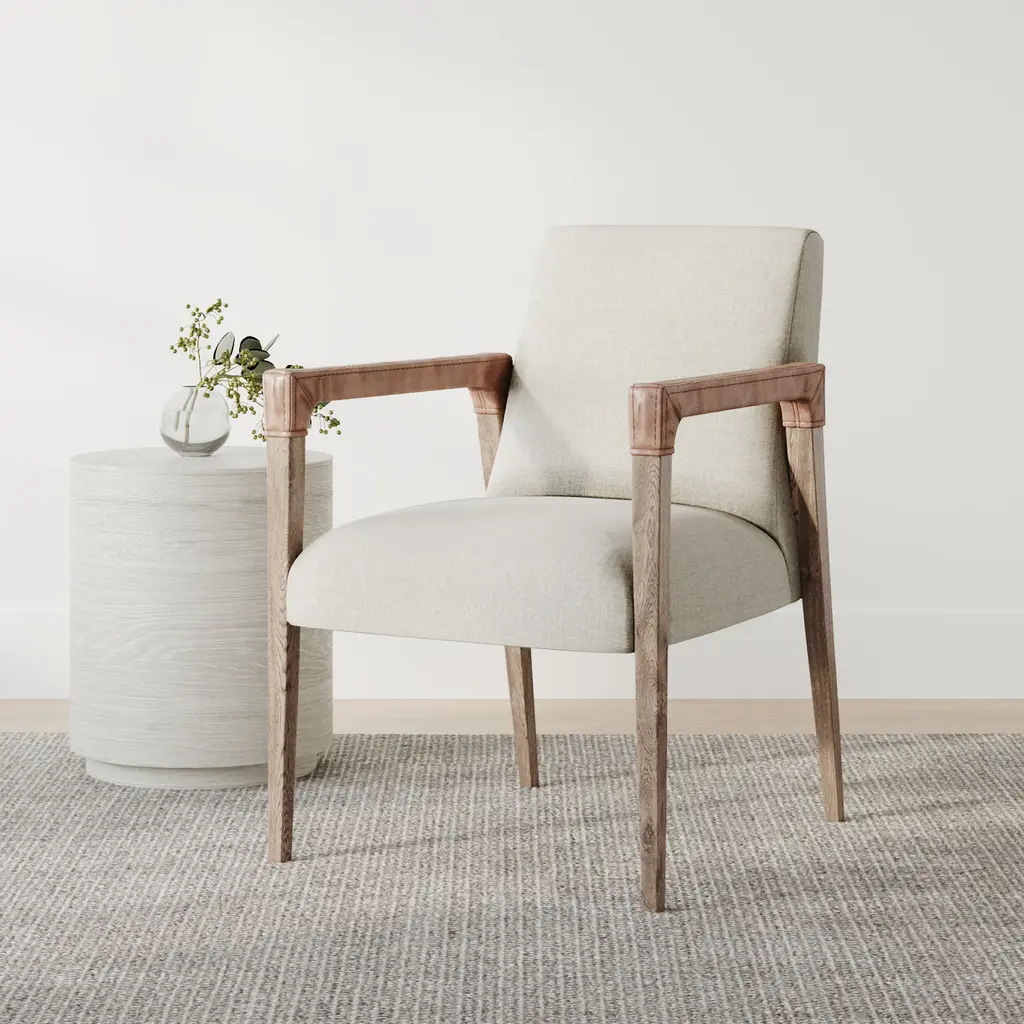 A classic chair with details that set it apart from the rest. Its slim, tapered oak wood frame. The comfy upholstered seat and arms wrapped in long-lasting vintage leather. Sure to make a statement in any room.