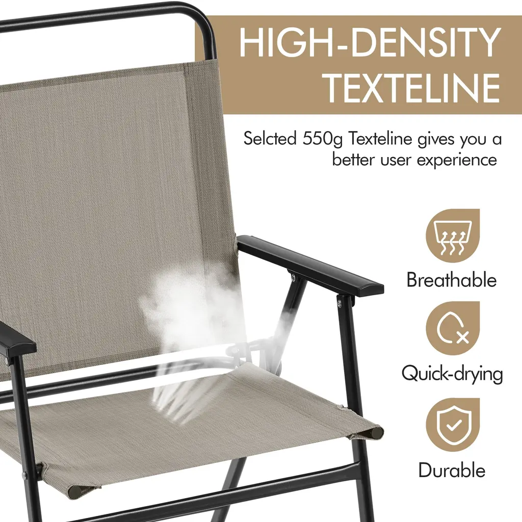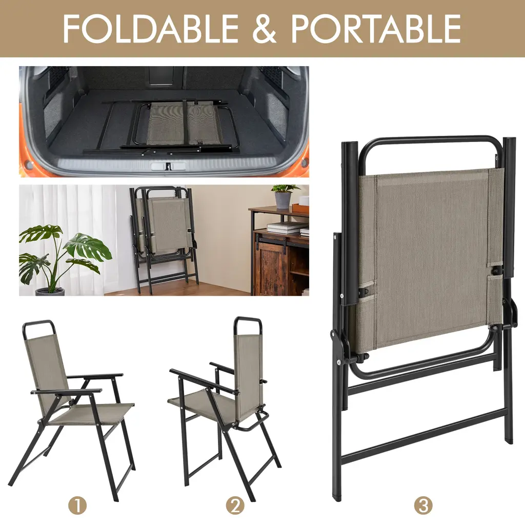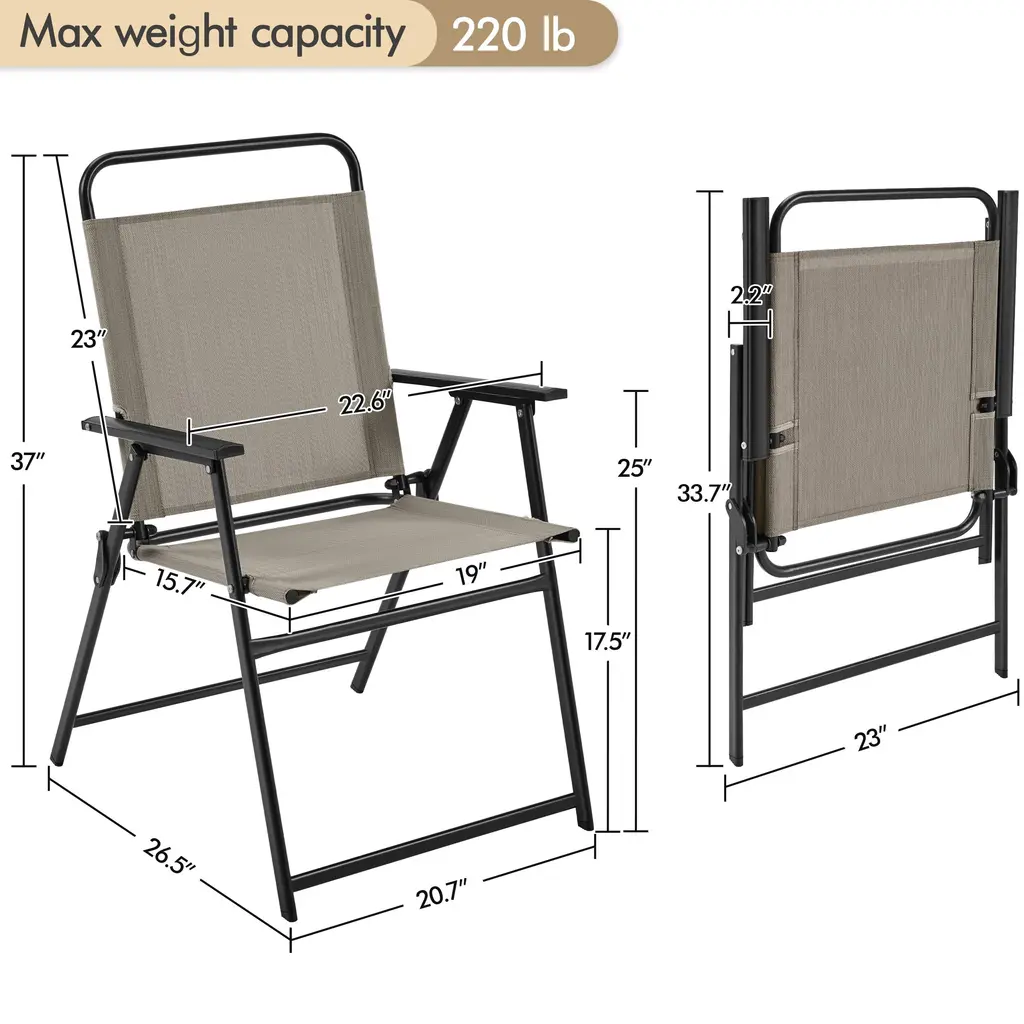 Crafted with durable Texteline material, this Outdoor Foldable Dining Chair set is designed to withstand the elements while exuding classic elegance. Whether you're hosting a party or enjoying a quiet garden dinner, these chairs offer a cozy, space-saving and weather-resistant seating solution. Features: 1.【All-weather Dining Chairs】We've combined outdoor material Texteline with classic and elegant dining chairs to create the perfect seating for your outdoor activities. Whether you're hosting a party, gathering with family, or having a garden dinner, these chairs are cozy, durable, weather-resistant, and elegant. 2.【Foldable Design】When you want to store or move this patio dining chair, you can fold it into a piece of 35″ L × 23″ W × 2.5″ Thickness piece to keep in your garage or on your storage shelf. If you have limited outdoor space, this dining chair is also your perfect solution to save valuable space. 3.【Cozy to Sit】The seat provides ample space for your body, measuring 15.7″ in depth and 19″ in width, and has a 23″ high backrest. Its design encourages a natural, slightly reclined sitting posture with an angle greater than 90° between the backrest and seat. The armrests are ergonomically curved at a suitable height to support your arms and wrists while seated. 4.【Robust Frame】The robust construction of this folding lawn chair is achieved through the utilization of 550g Texteline, known for its weather and wear-resistance, in combination with a sturdy iron frame designed in a reinforced triangle structure. This design ensures excellent weight capacity, enabling the chair to support up to 220 lb. 5.【Effortless Movement】For higher mobility, this foldable dining chair is equipped with a convenient handle located at the top of the backrest, allowing for a secure grip when relocating the chair from one spot to another.Specifications: Quantity: 2 Color: Black, Brown, Navy Blue, Gray Material: 550g Texteline, Steel Dimension: Unfolded: 26.5″ W × 23″ D × 37″ H Folded: 35″ L × 23″ W × 2.5″ Thickness Seat: 15.7″ D × 19″ W Backrest Height: 23″ Max Weight Capacity: 220 lb Item Weight: 19.1 lb Shipping Weight: 22.3 lb
