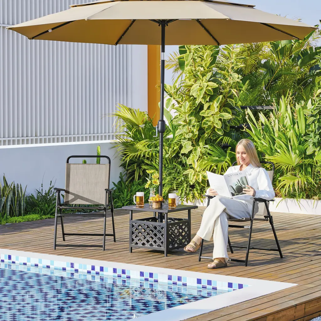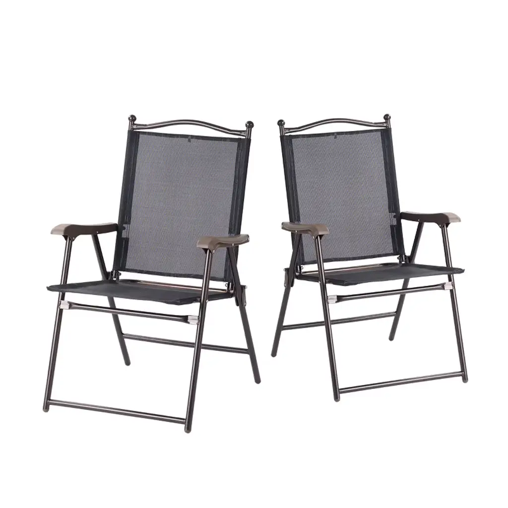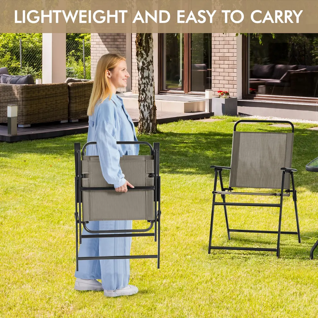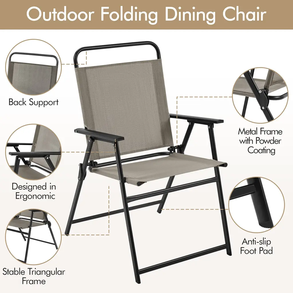Crafted with durable Texteline material, this Outdoor Foldable Dining Chair set is designed to withstand the elements while exuding classic elegance. Whether you're hosting a party or enjoying a quiet garden dinner, these chairs offer a cozy, space-saving and weather-resistant seating solution. Features: 1.【All-weather Dining Chairs】We've combined outdoor material Texteline with classic and elegant dining chairs to create the perfect seating for your outdoor activities. Whether you're hosting a party, gathering with family, or having a garden dinner, these chairs are cozy, durable, weather-resistant, and elegant. 2.【Foldable Design】When you want to store or move this patio dining chair, you can fold it into a piece of 35″ L × 23″ W × 2.5″ Thickness piece to keep in your garage or on your storage shelf. If you have limited outdoor space, this dining chair is also your perfect solution to save valuable space. 3.【Cozy to Sit】The seat provides ample space for your body, measuring 15.7″ in depth and 19″ in width, and has a 23″ high backrest. Its design encourages a natural, slightly reclined sitting posture with an angle greater than 90° between the backrest and seat. The armrests are ergonomically curved at a suitable height to support your arms and wrists while seated. 4.【Robust Frame】The robust construction of this folding lawn chair is achieved through the utilization of 550g Texteline, known for its weather and wear-resistance, in combination with a sturdy iron frame designed in a reinforced triangle structure. This design ensures excellent weight capacity, enabling the chair to support up to 220 lb. 5.【Effortless Movement】For higher mobility, this foldable dining chair is equipped with a convenient handle located at the top of the backrest, allowing for a secure grip when relocating the chair from one spot to another.Specifications: Quantity: 2 Color: Black, Brown, Navy Blue, Gray Material: 550g Texteline, Steel Dimension: Unfolded: 26.5″ W × 23″ D × 37″ H Folded: 35″ L × 23″ W × 2.5″ Thickness Seat: 15.7″ D × 19″ W Backrest Height: 23″ Max Weight Capacity: 220 lb Item Weight: 19.1 lb Shipping Weight: 22.3 lb