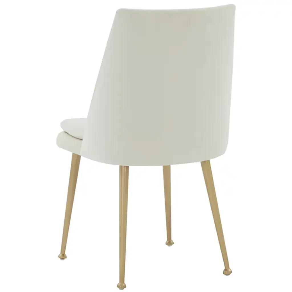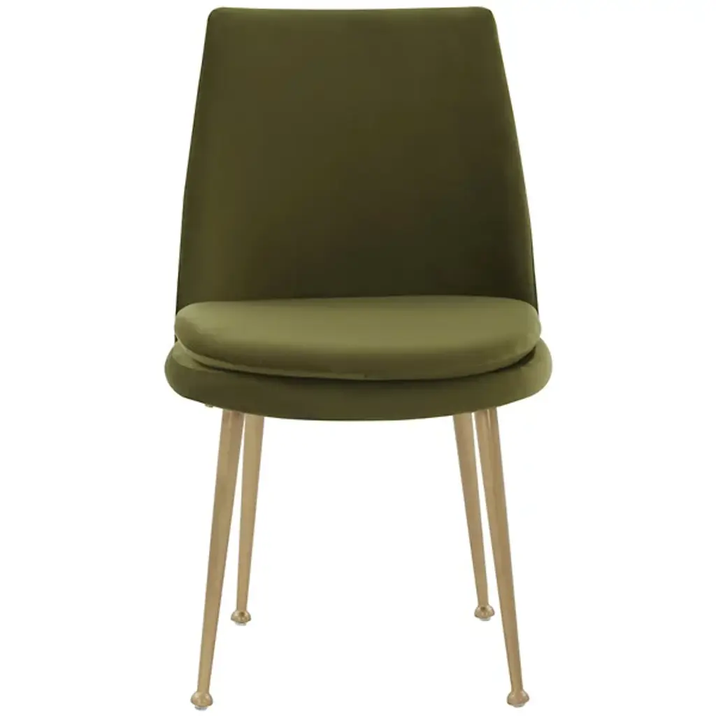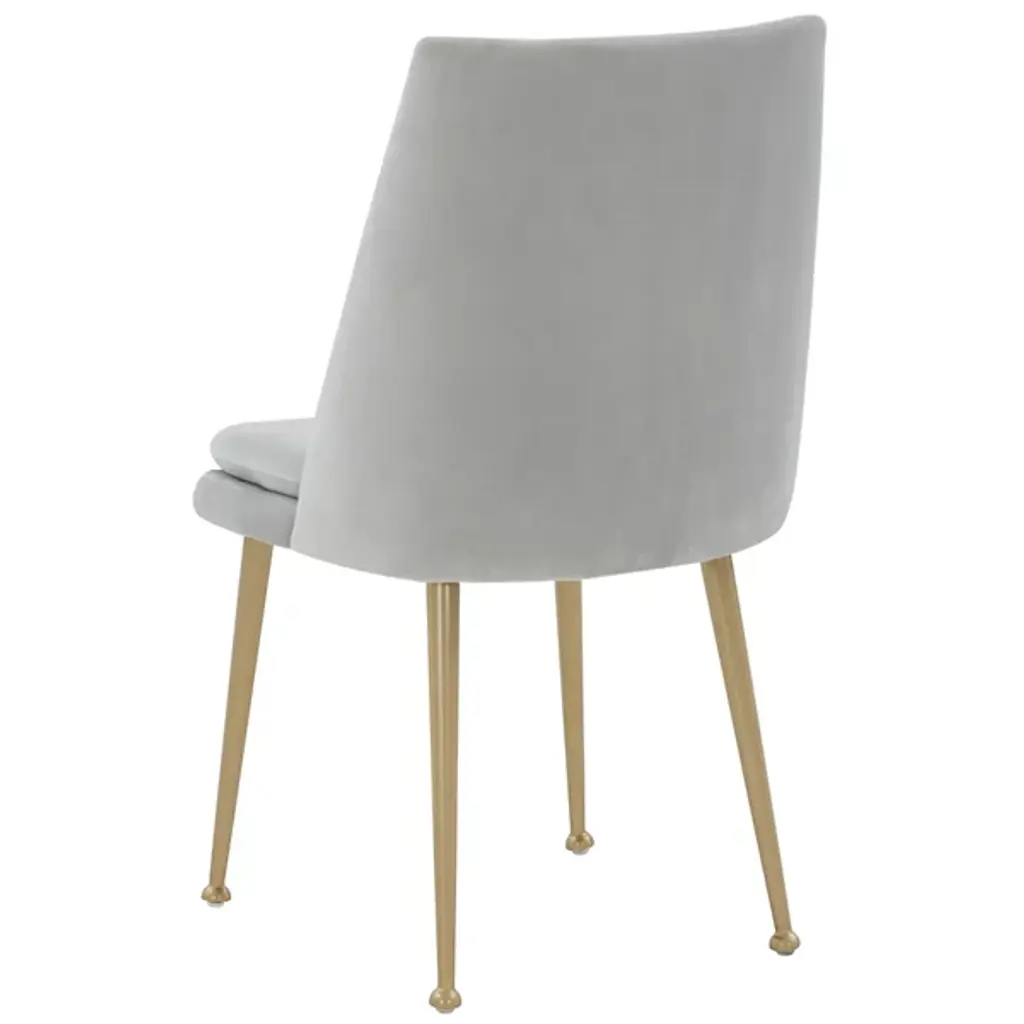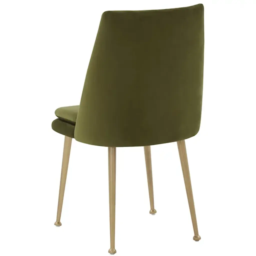 The Yair Dining Chair is presented by Alder & Ore. It is a perfect blend of minimalism and modern sophistication. This chair showcases a clean design that easily complements contemporary dining spaces and beyond. The plush and generously padded back subtly curves and reclines, offering optimal comfort and support. The soft velvety upholstery adds a touch of luxury, inviting you to indulge in a cozy seating experience. The chair stands on elegant gold tapered legs, which not only provide stability but also add a touch of glamour and refinement.