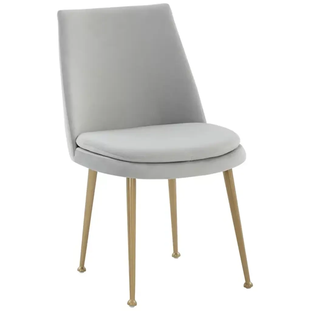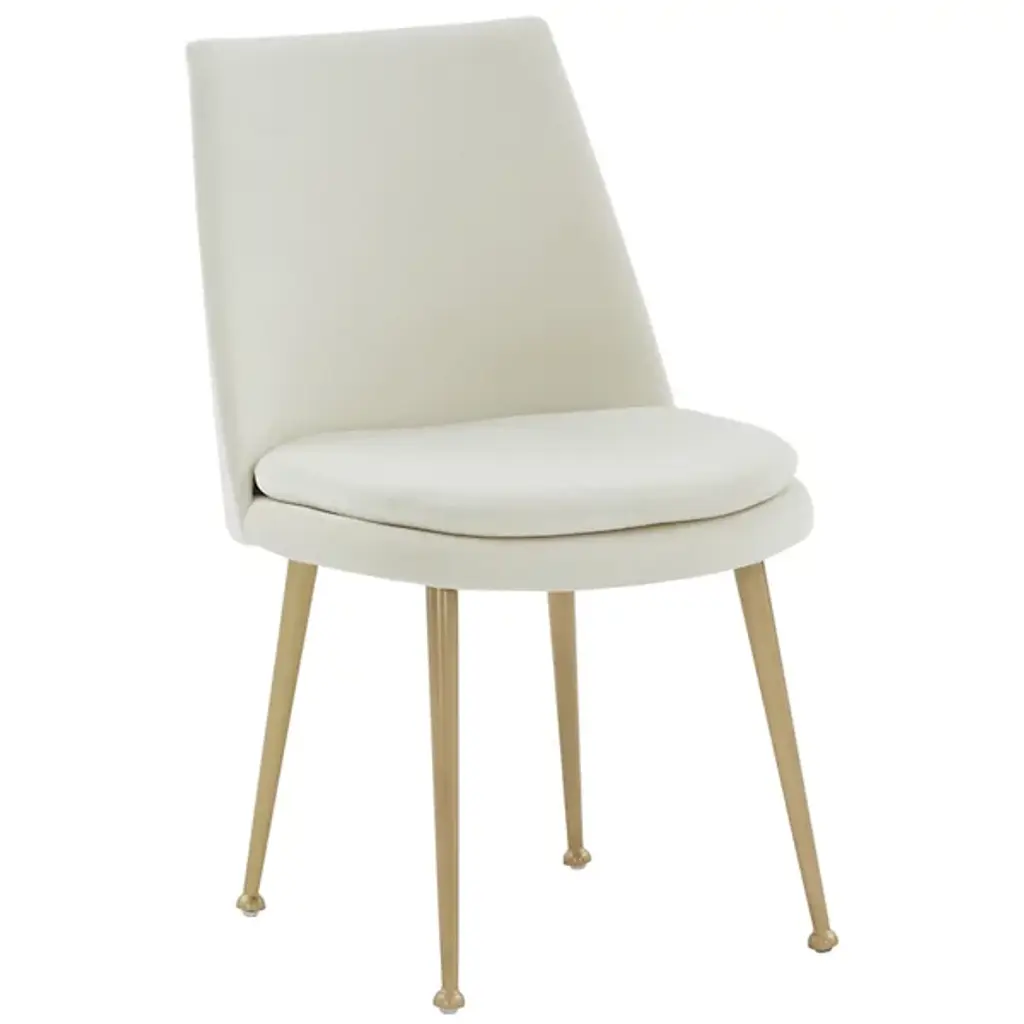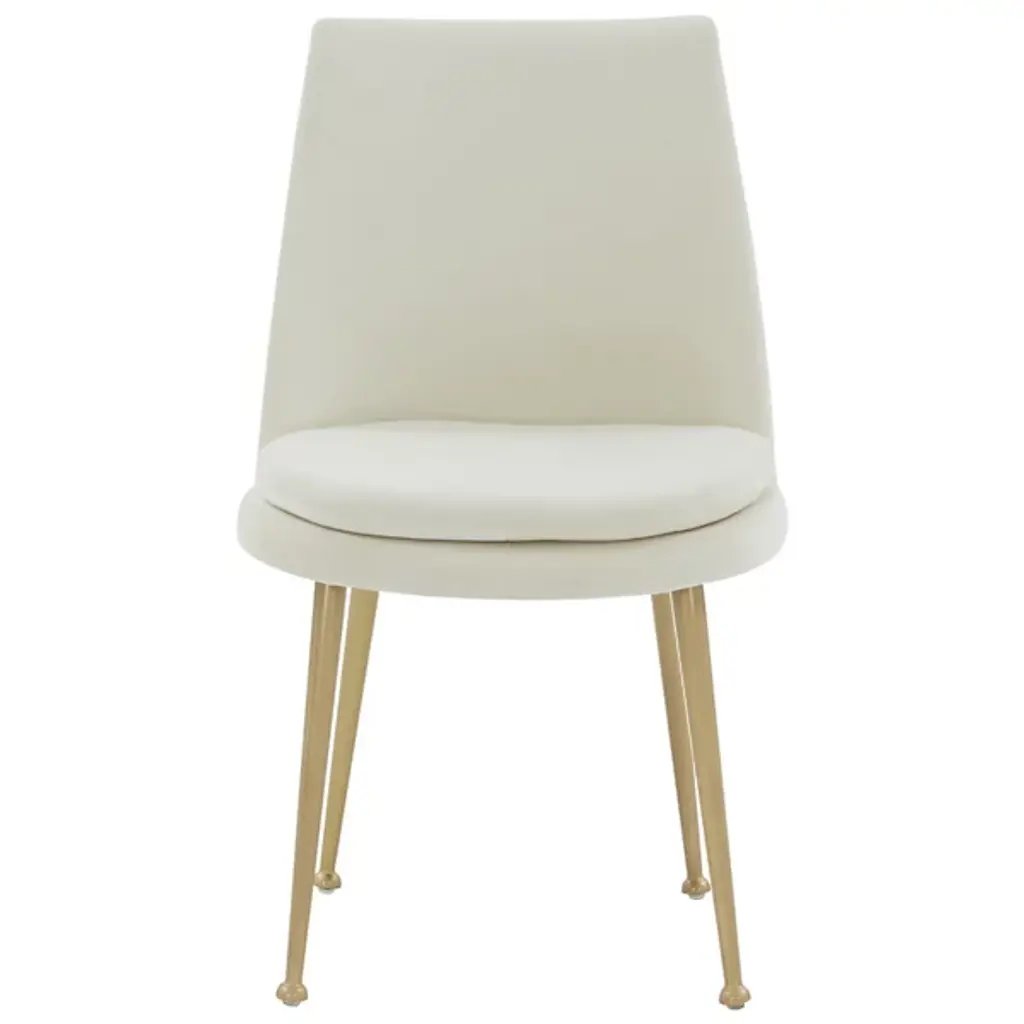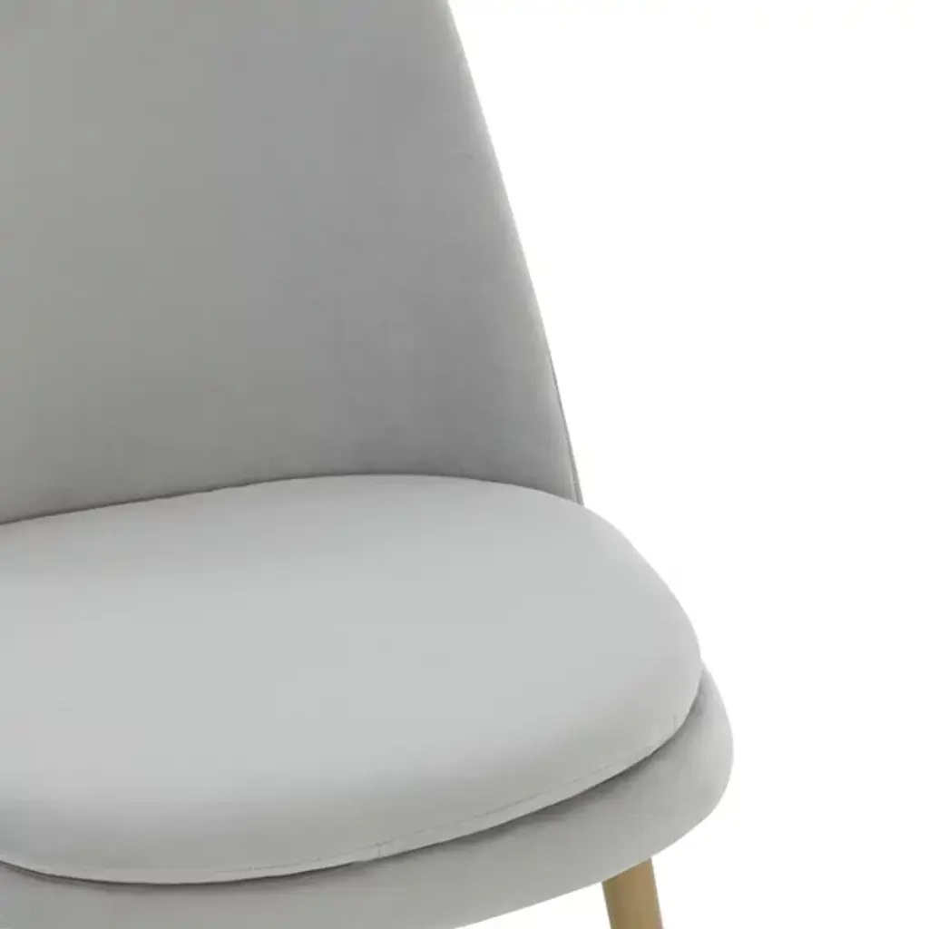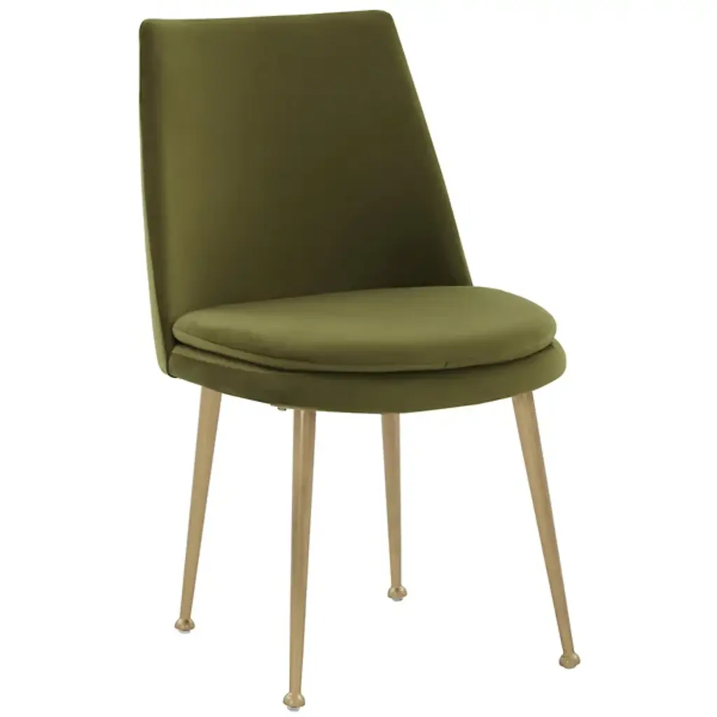 The Yair Dining Chair is presented by Alder & Ore. It is a perfect blend of minimalism and modern sophistication. This chair showcases a clean design that easily complements contemporary dining spaces and beyond. The plush and generously padded back subtly curves and reclines, offering optimal comfort and support. The soft velvety upholstery adds a touch of luxury, inviting you to indulge in a cozy seating experience. The chair stands on elegant gold tapered legs, which not only provide stability but also add a touch of glamour and refinement.