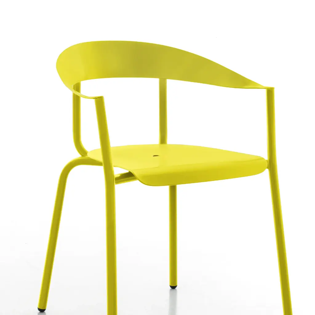 This highly versatile, stackable chair with armrests can be personalized for indoor or outdoor use. Its lightweight, 100% aluminum frame features a slot in the seat to drain away rainwater, while its seat can also be upholstered in fabric for interior settings. This comfortable chair is the perfect blend of form and function. Painted in the bright, cheerful yellow RAL 1016.