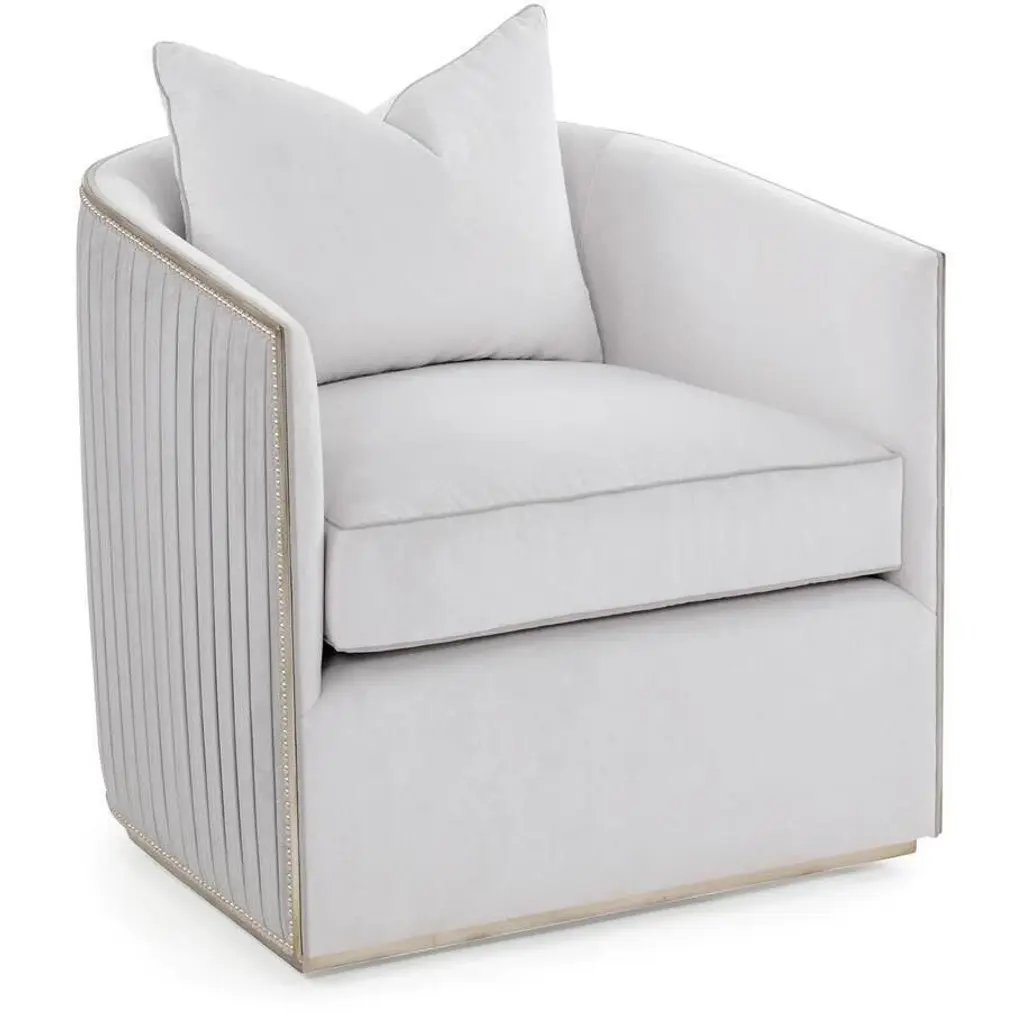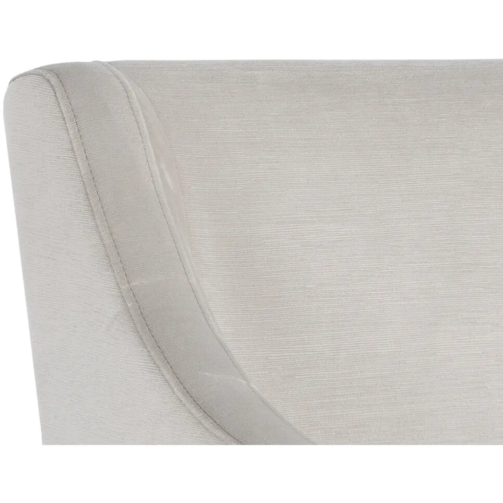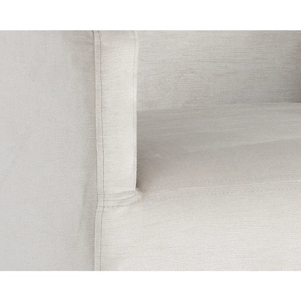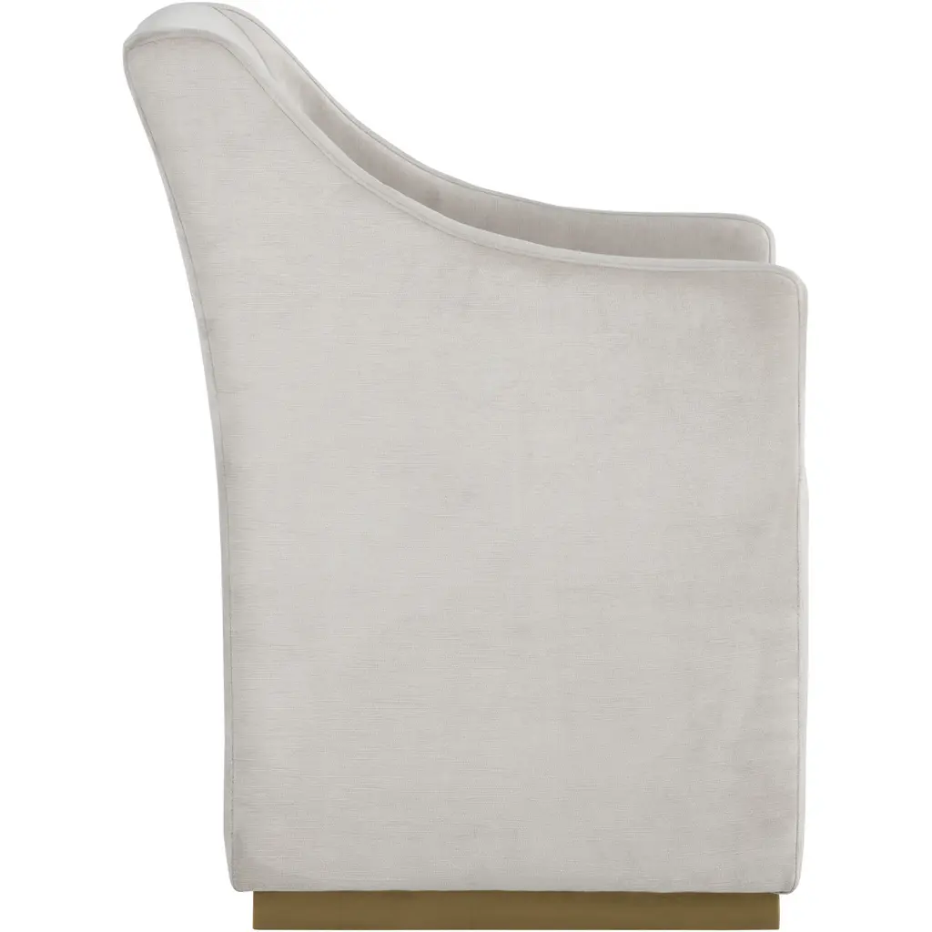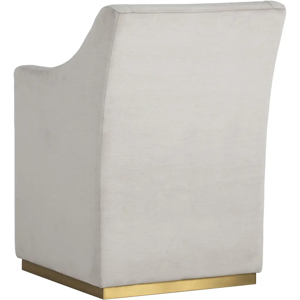 An eye-catching, ultra glamourous wheeled dining chair. Stocked in our piccolo prosecco performance fabric with a brushed brass steel frame. Sophistication and comfort fit for various dining and lounge spaces. Performance fabric is moisture repellant, durable and easy to clean.