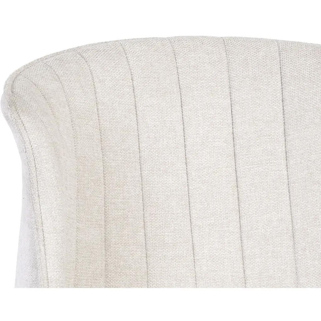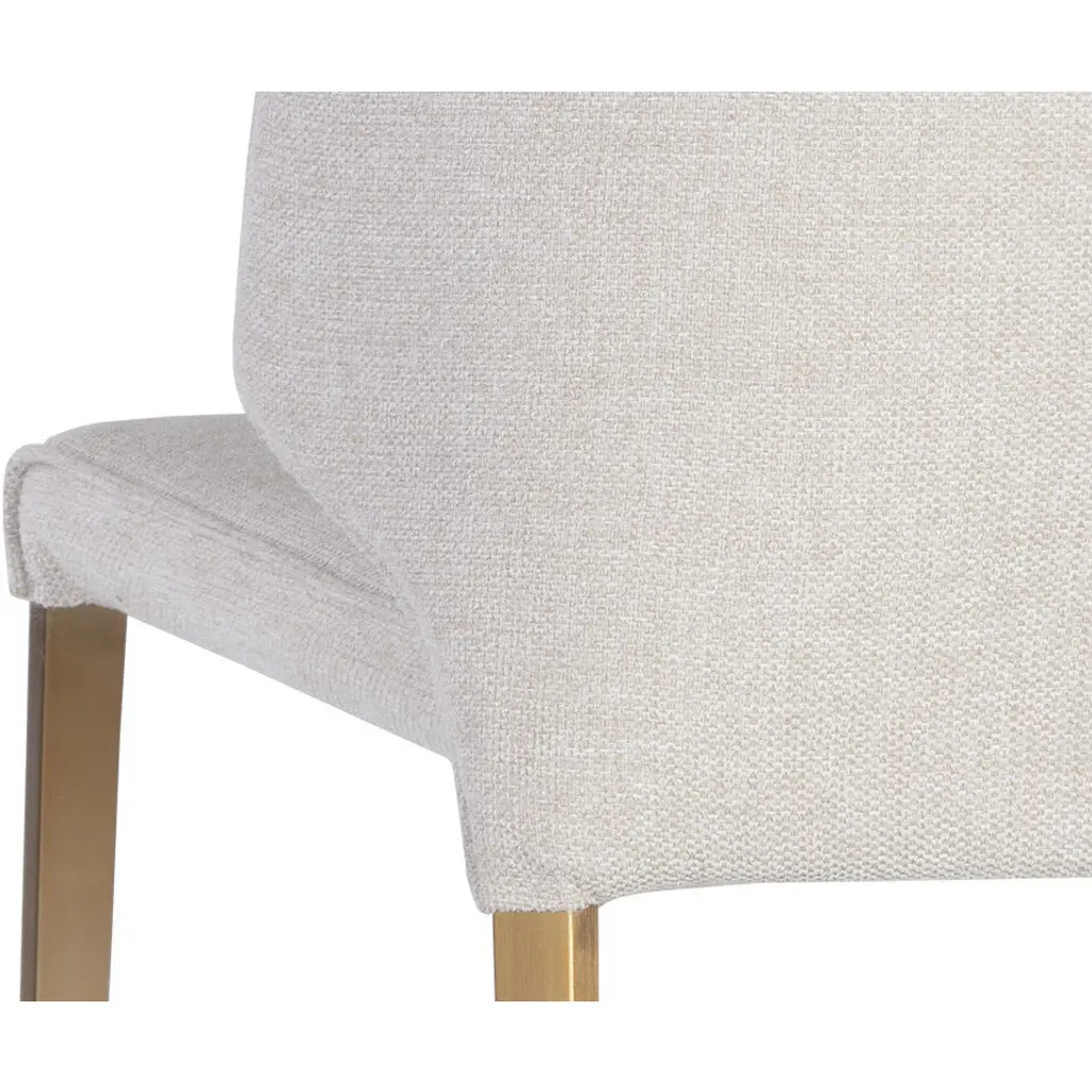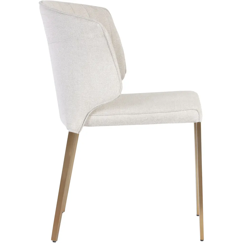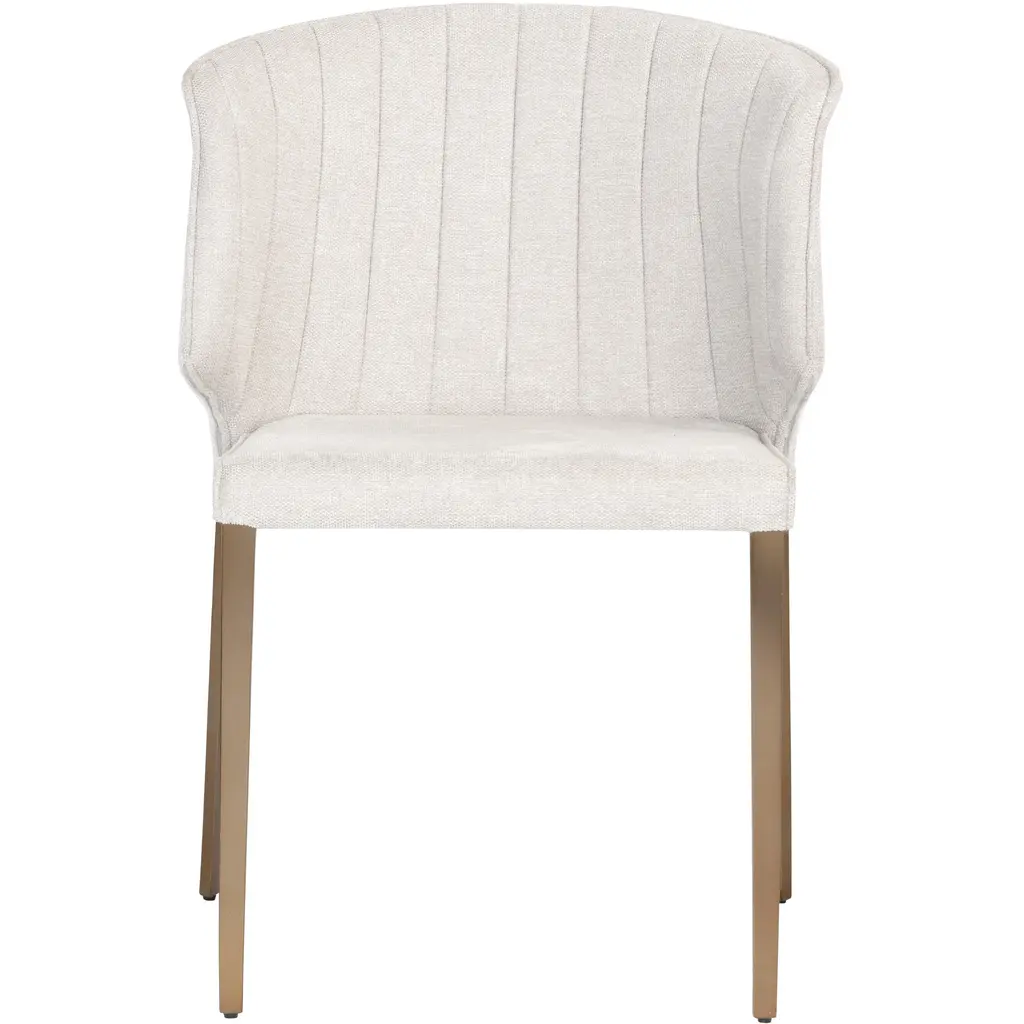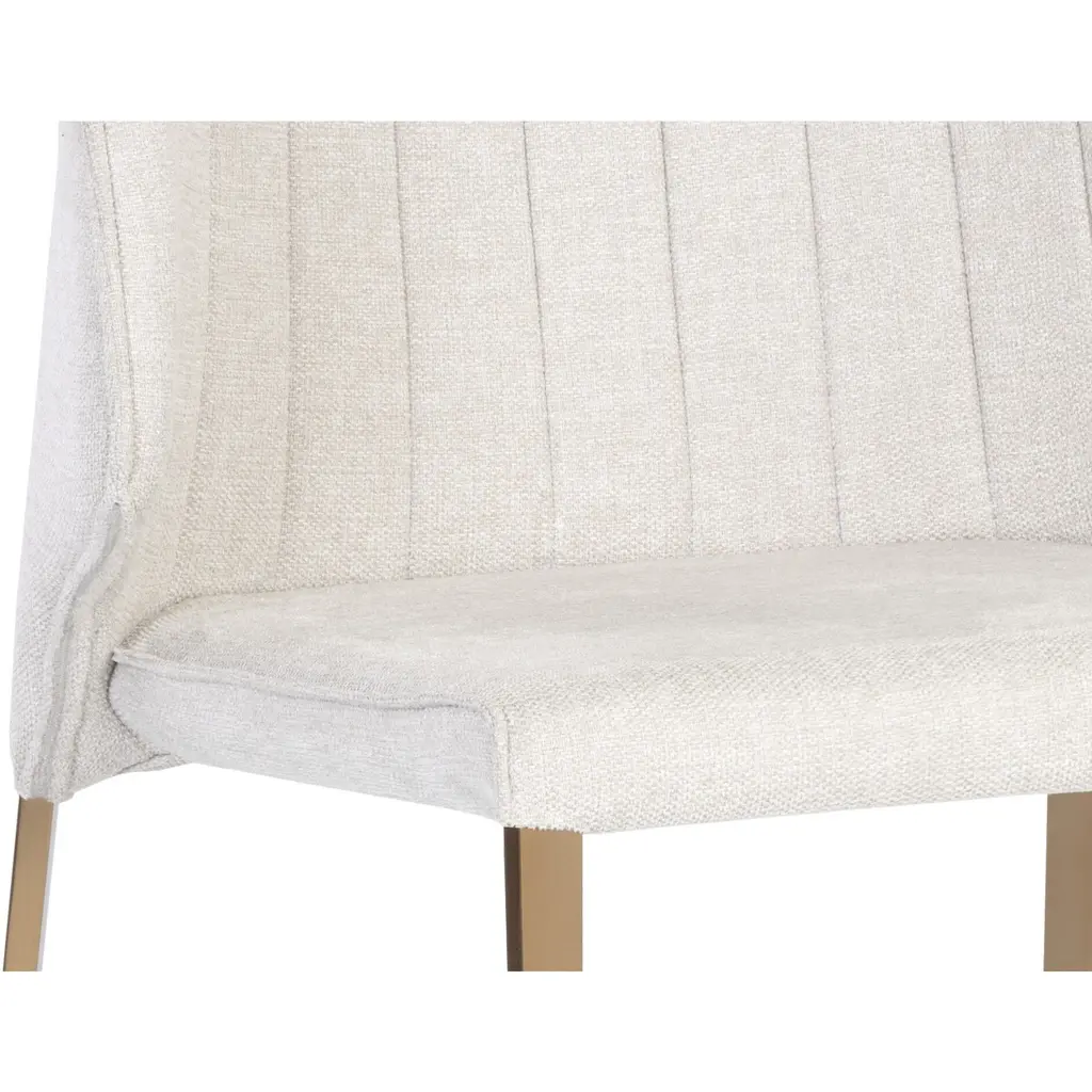 Fine and compact, this modern dining chair features a well-structured curved backrest with vertical tufting on the interior. Stocked in belfast oatmeal fabric and completed with stainless steel legs in a gold finish.