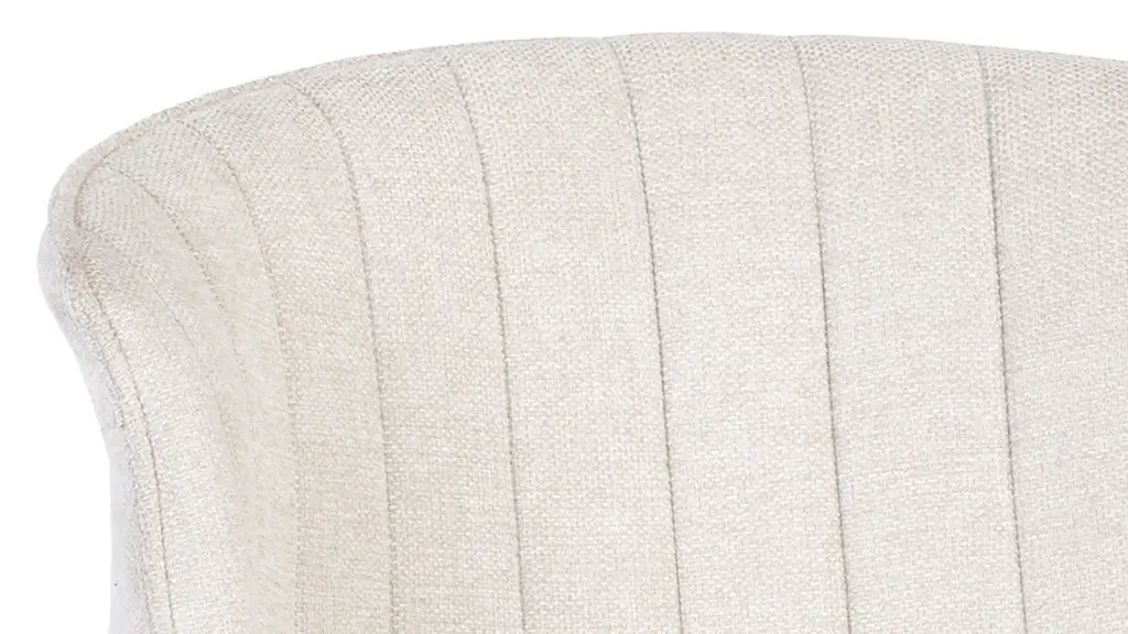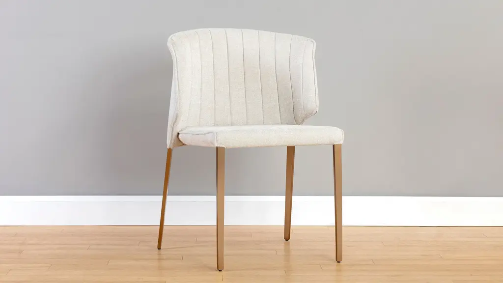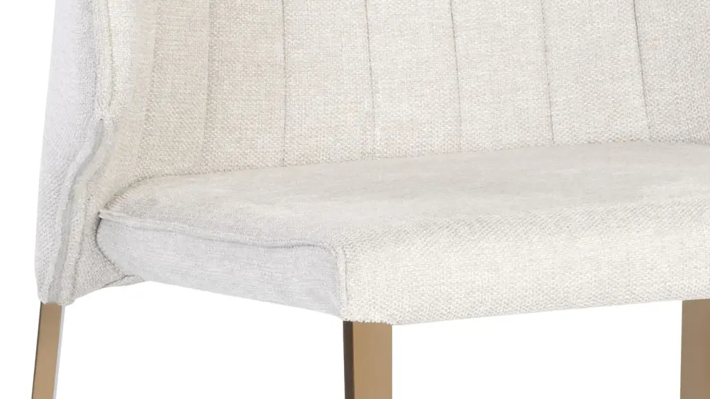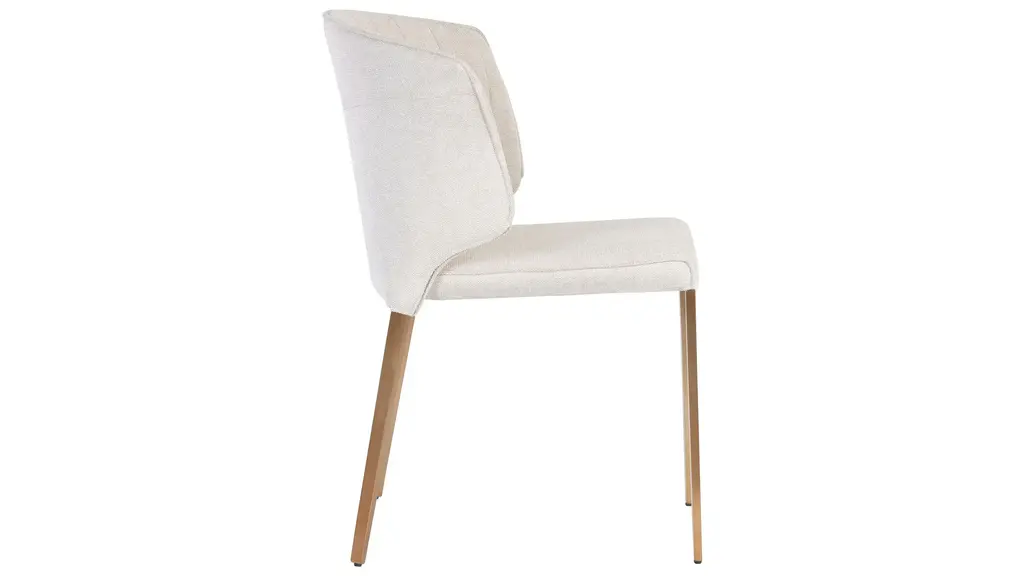 Zayden Dining Chair features a well-structured curved backrest with vertical tufting on the interior. Stocked in belfast oatmeal fabric and completed with stainless steel legs in a gold finish.