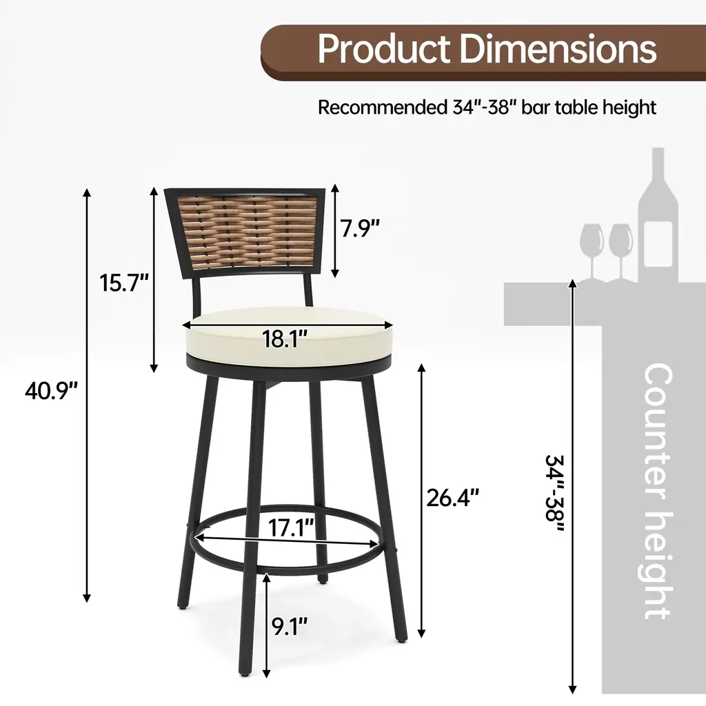 Our 2/4/6-piece outdoor dining chairs offer a smooth 360-degree rotation, allowing for effortless direction changes. The ergonomic curved backrest provides excellent support, complemented by a footrest for added comfort. The soft sponge cushion, secured with Velcro, is easily removable, and the machine-washable zip cover simplifies cleaning and maintenance. Constructed with a sturdy, rust-resistant metal frame and durable rattan back, these patio bar stools are built to last. Upgraded non-slip foot pads ensure safety for outdoor use, making these stools perfect for your yard, lawn, deck, or poolside.Features: Weights & Dimensions: Product Details: